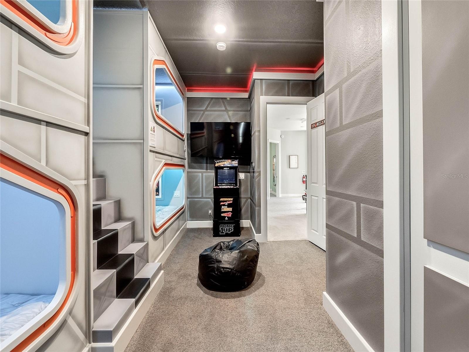 The arcade room features 2 Superbikes 2, Skeeball, Multi-Arcade, basketball arcade, and 5 arcades, Pac Man, Asteroids, Street Fighter, Centerpede & Rampage, a 120-Inch theater screen connected to upgraded cable, an Apple TV 2 with theater seating and karaoke set-up. It also features Custom built full-size bunk beds and a Car Pool table, a New York theme scape with working lights .