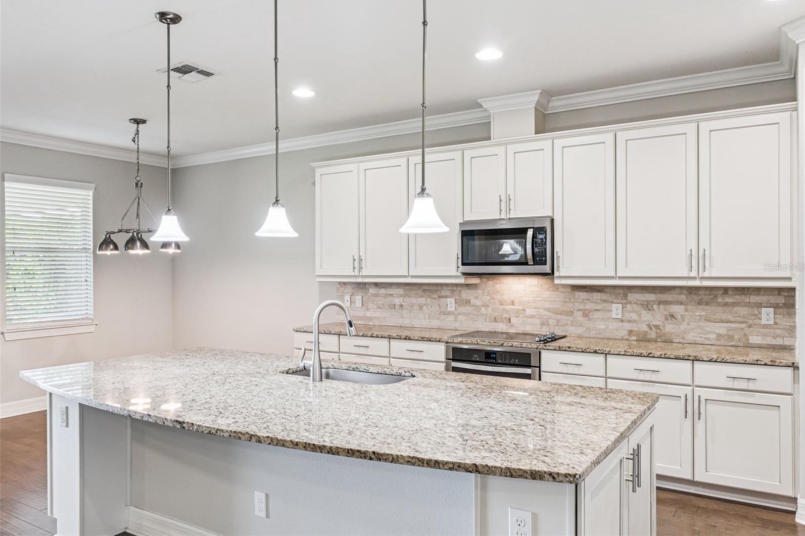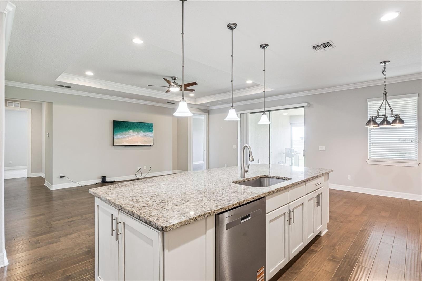 WELCOME TO LAKESHORE! This spacious 4-bedroom, 3-bath home with expansive lakefront view was built by Pulte Homes and features the Palm floor plan, offering both elegance and functionality. The residence showcases high-end designer finishes throughout—including granite countertops in the kitchen and bathrooms, stainless steel appliances, elegant wood cabinetry, and stylish wood flooring in the main areas, berber carpet and tile in the bedrooms and bathrooms.
