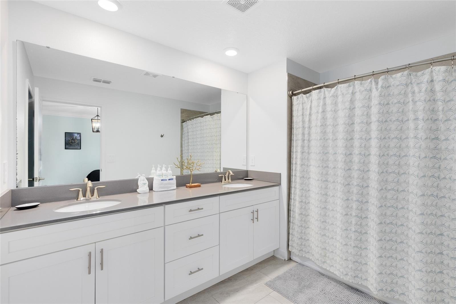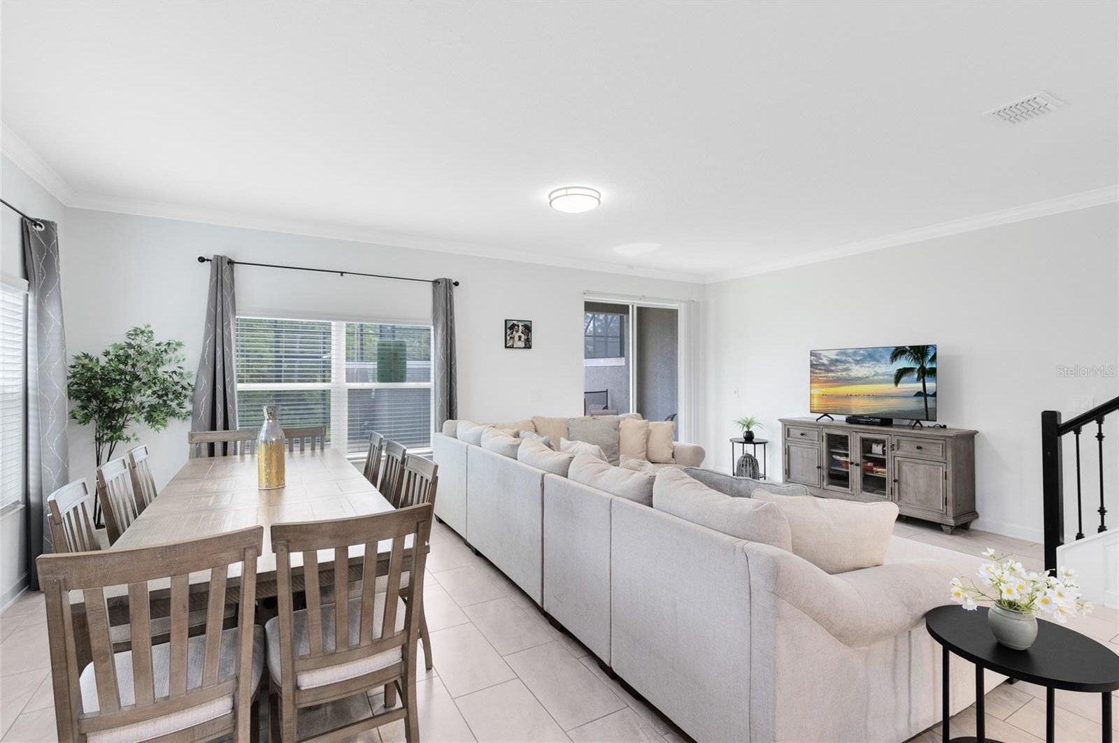 The first floor features a bright open-concept living area with tile flooring throughout. The chef’s kitchen offers granite countertops, stainless steel appliances, a large island with bar seating, and pendant lighting. The spacious dining area flows seamlessly into the living room, where natural light pours in through large windows and sliding doors leading to the private screened splash pool and covered patio. Two bedrooms on the first level provide flexible space for guests or multi-generational living.