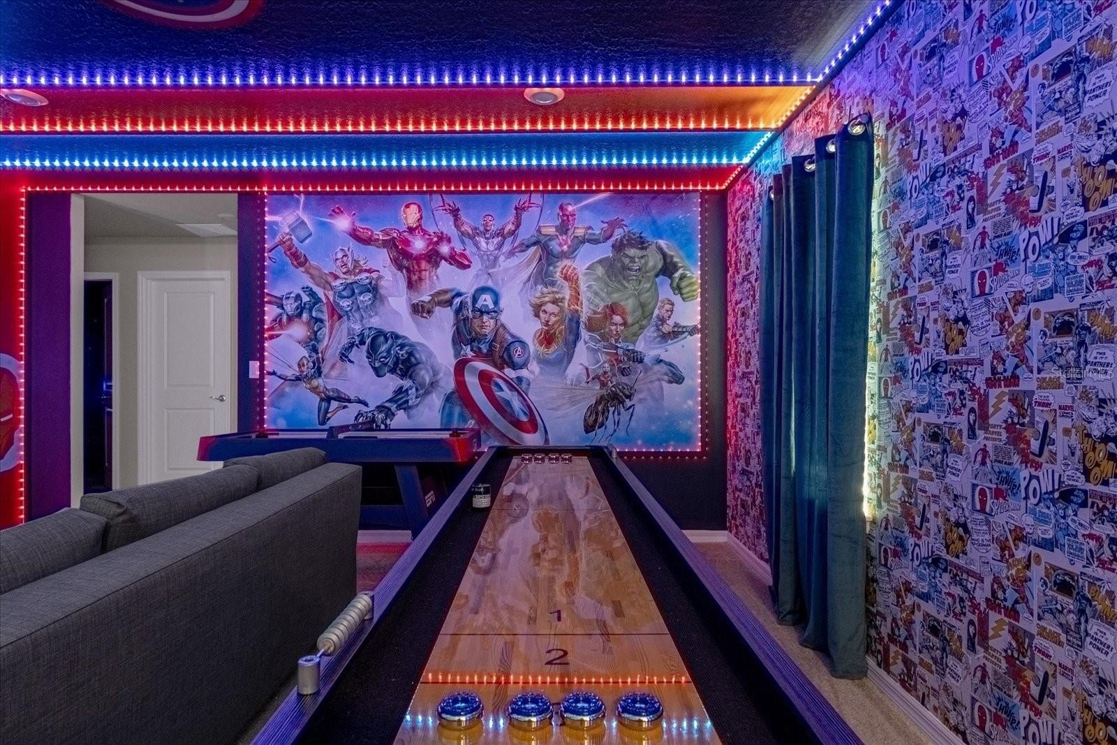 This professionally designed, fully furnished 7-bedroom, 5.5-bath vacation retreat offering over 3,200 square feet of upgraded living space in one of Central Florida’s most sought-after resort communities. This turnkey property blends upscale finishes with functional design, ideal for investors and vacationers alike. Step inside to discover a spacious open-concept layout perfect for large groups. The gourmet kitchen features rich espresso cabinetry, granite countertops, stainless steel appliances, and a generous center island with seating that's ideal for casual dining and entertaining. The main-level primary suite offers direct pool access and a spa-inspired en suite bath with dual sinks, a garden tub, and walk-in shower. Upstairs, a sprawling loft has been transformed into a private game and movie room, surrounded by six additional bedrooms and four full baths, providing ample space for guests and family. Outside, enjoy your own private oasis with a heated pool and spa, covered lanai, and plenty of seating for sun-soaked relaxation or evening gatherings. Located in Windsor Island Resort, just minutes from Disney, this community is packed with world-class amenities: a zero-entry resort pool, lazy river, water slide, splash pad, clubhouse with concierge and arcade, fitness center, mini golf, playground, firepit with Disney fireworks views, and the Blue Marlin Grille restaurant. With short-term rentals allowed and high demand year-round, this property offers both lifestyle and income potential.