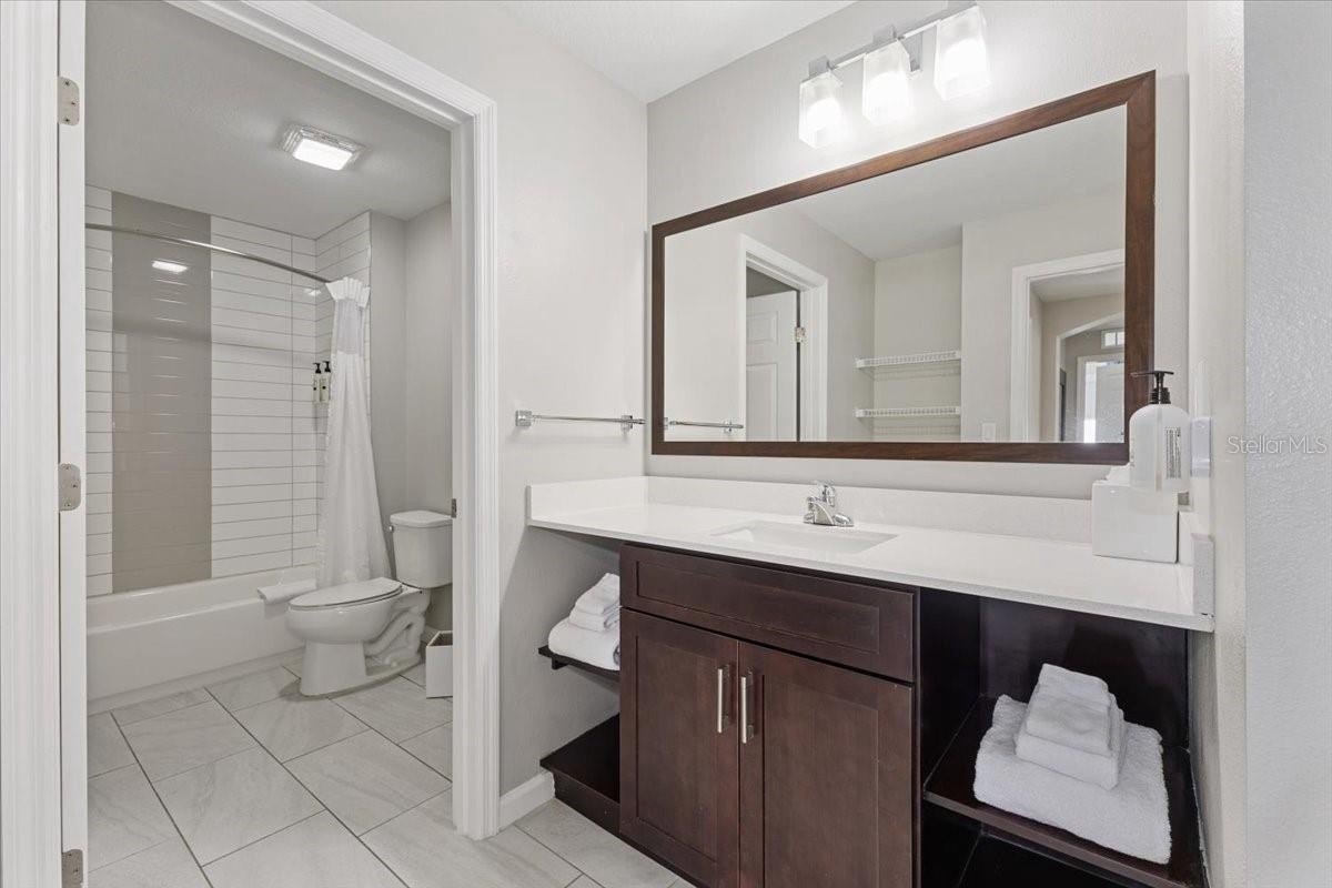 Step inside to find a spacious, light-filled layout that’s perfect for relaxing or entertaining. The condo features contemporary décor, high-end finishes, and a sleek, modern kitchen complete with stainless steel appliances, quartz countertops, and plenty of storage. A private screened balcony extends your living space outdoors, while the in-unit washer and dryer add convenience for longer stays.