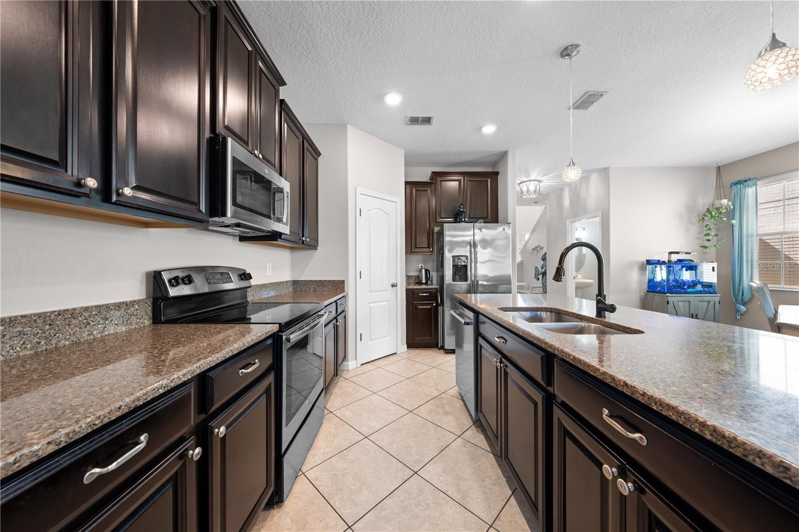 The first-floor owner’s suite is a private retreat with tranquil water views and direct access to a luxurious in-suite bath that flows seamlessly into the laundry room. The gourmet kitchen is a chef’s dream, featuring granite countertops, stainless steel appliances, a walk-in pantry, and ample space for entertaining.