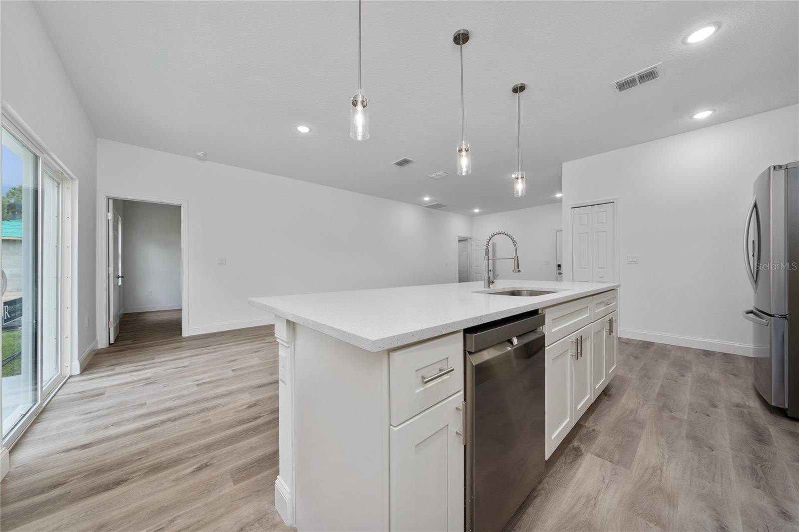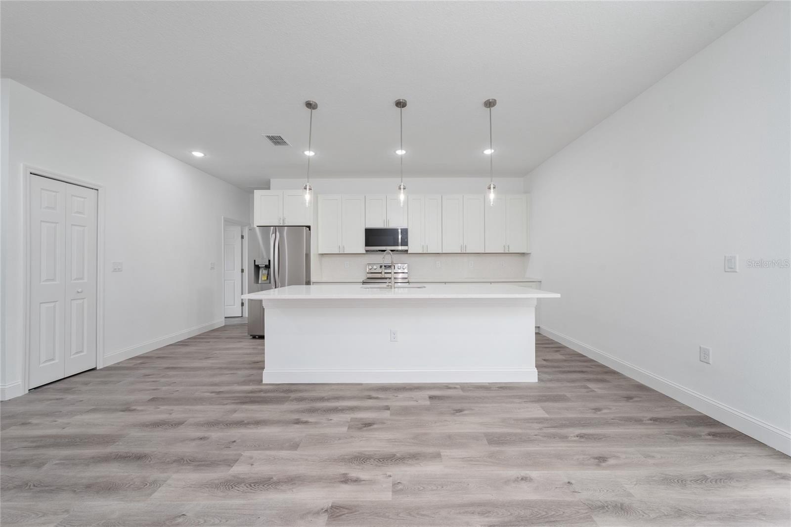 Take advantage of this opportunity on a brand-new 4BR/2BA home in Ocala. The open, light-filled layout features a gourmet kitchen with quartz countertops, soft-close cabinetry, a stylish tile backsplash, a spacious island, and a complete Samsung appliance package — refrigerator, range, hood, dishwasher, washer, and dryer all included.