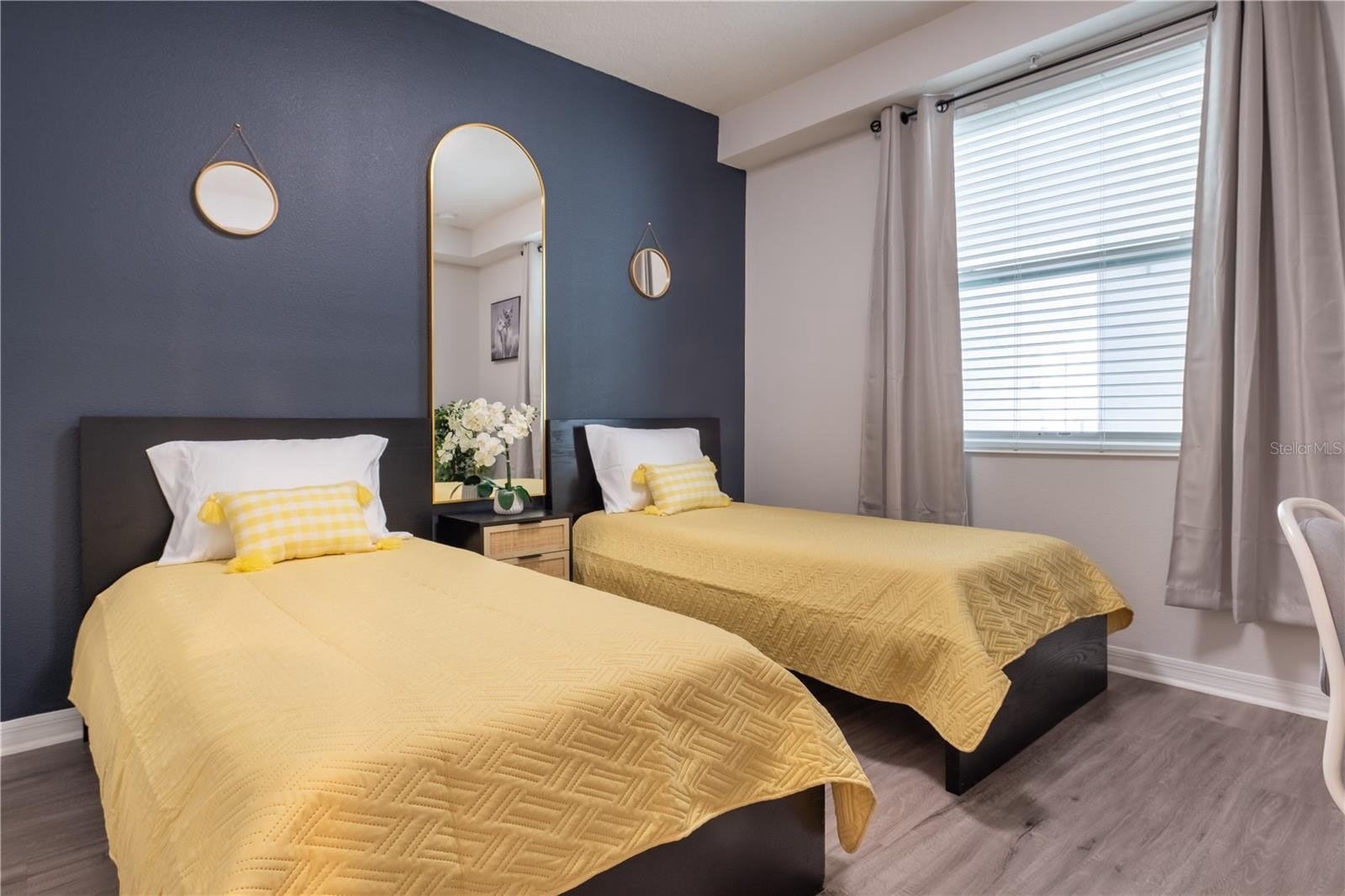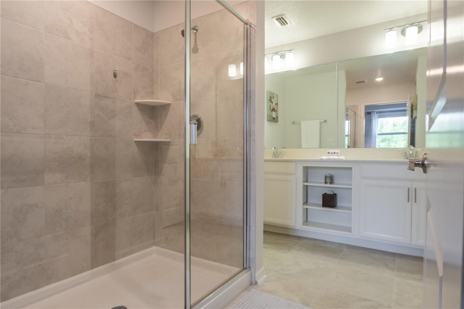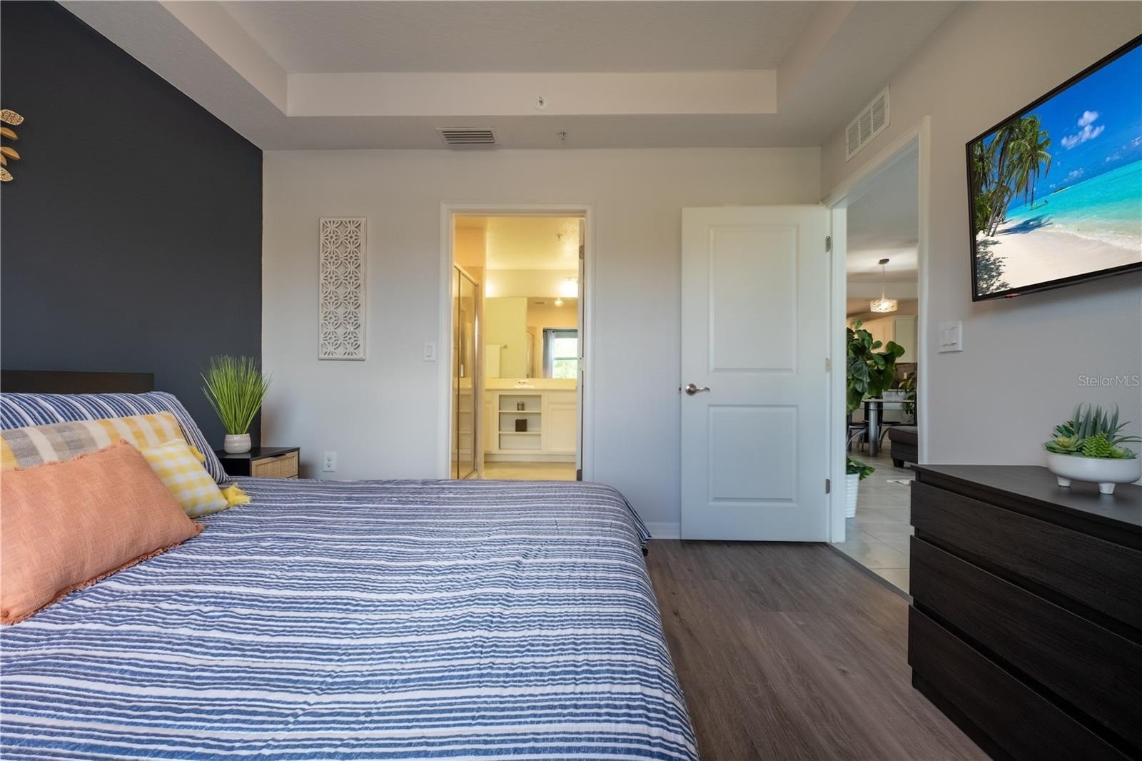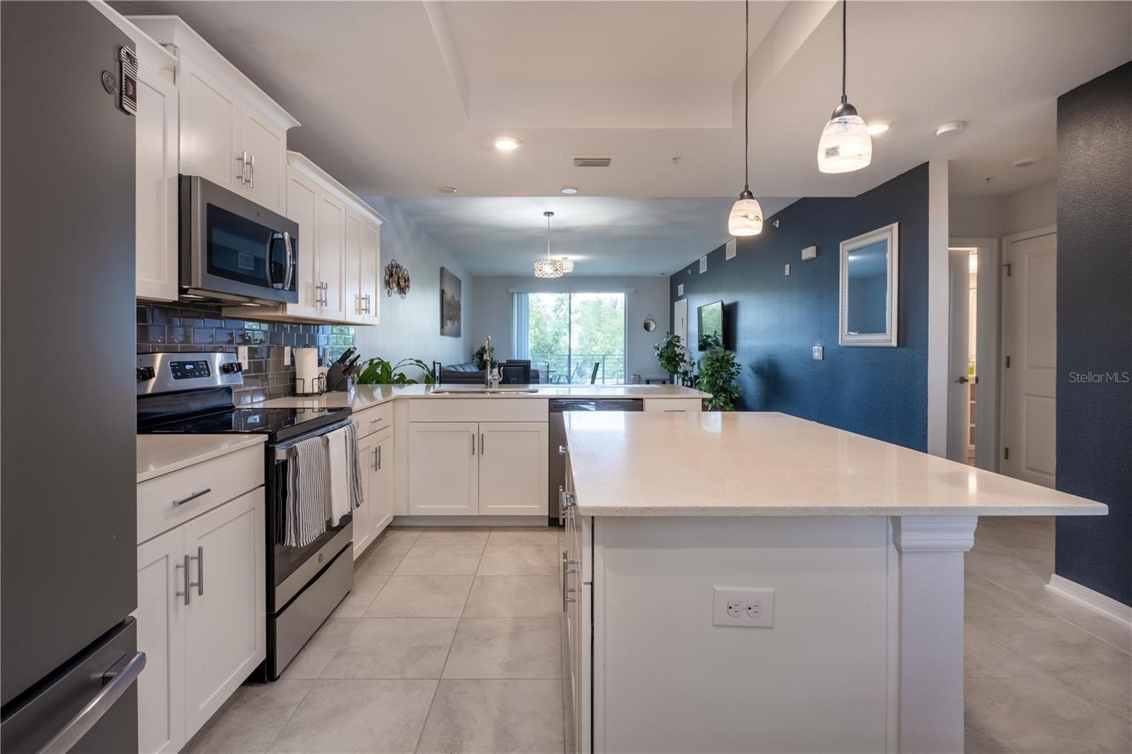 Welcome to this beautifully updated 2-bedroom, 2-bath condo in the Terraces at Storey Lake, offering low-maintenance living in one of Central Florida’s premier resort communities. This bright, open floor plan features a modern kitchen with white shaker cabinetry, quartz countertops, a large center island, stainless steel appliances, and a charcoal subway tile backsplash. Ceramic tile flooring extends through the main living areas, with vinyl flooring in both bedrooms—no carpet. The spacious primary suite includes a tray ceiling, a designer accent wall, and an ensuite bath with a double-sink quartz vanity and a large walk-in shower. The second bedroom enjoys its own nearby full bath with a double-sink vanity and tub/shower combo. The living and dining areas open to a private balcony with peaceful greenery views. Storey Lake offers a full resort experience with a heated pool, lazy river, water slides, splash pad, mini golf, a fitness center, sports courts, canoe and kayak rentals, dog parks, quiet pools, playgrounds, and 24-hour gated entry. Ideally located minutes from Disney, Lake Buena Vista, Disney Springs, The Loop, shopping, dining, and Orlando International Airport.