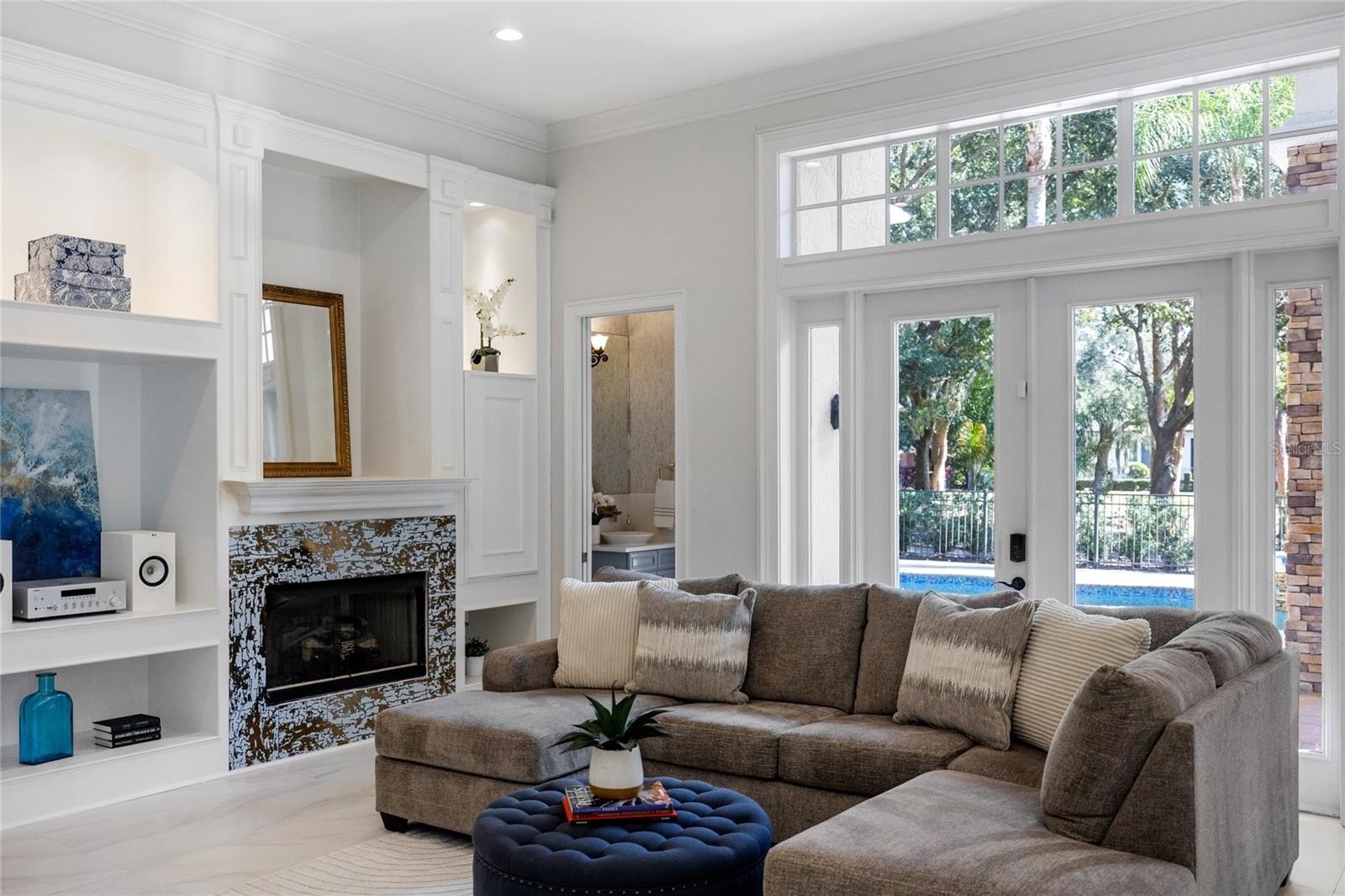 From the moment you step inside, the home commands attention. A soaring 22-foot ceiling, a nine-foot sparkling crystal chandelier, and a dramatic custom stone water feature set the tone. The first floor has been transformed with 24x48 porcelain tile in a flowing layout capturing natural light and uninterrupted views of the pool, patio, and golf course.