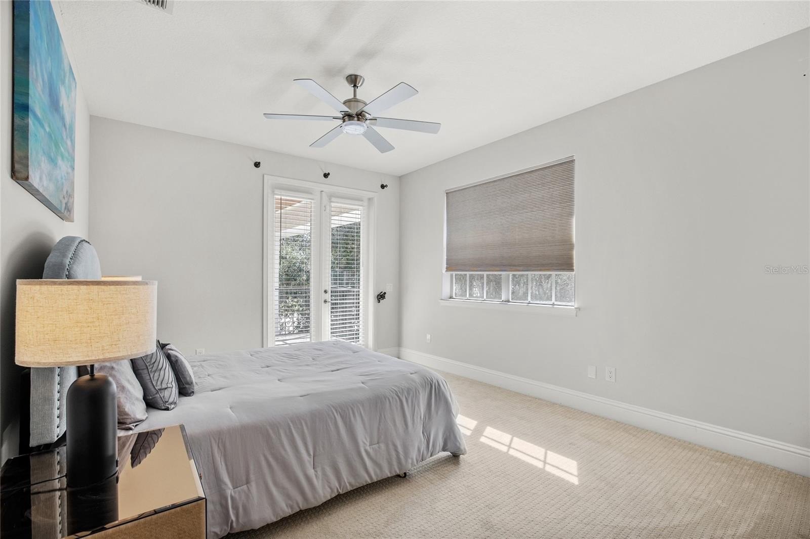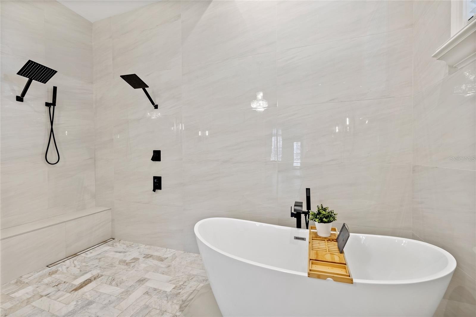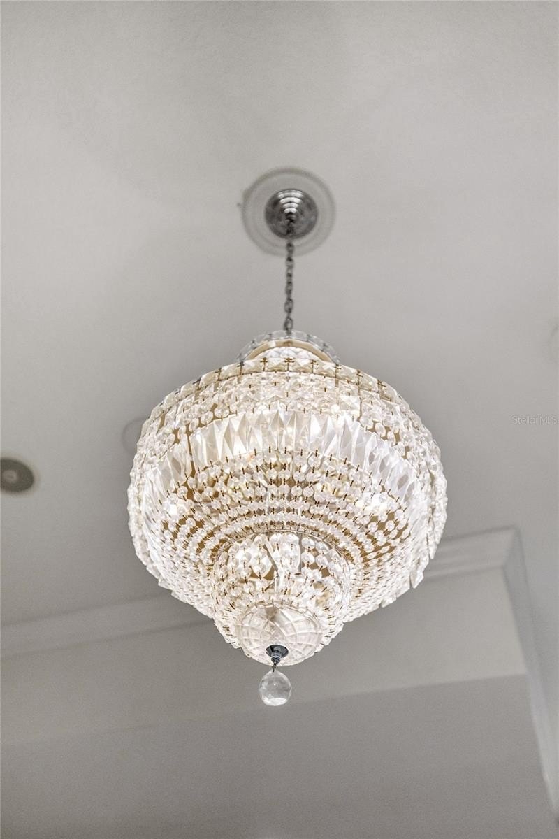 The spacious primary suite offers a spa-caliber retreat: floor-to-ceiling tile, a crystal chandelier, and a serene hotel-inspired design.