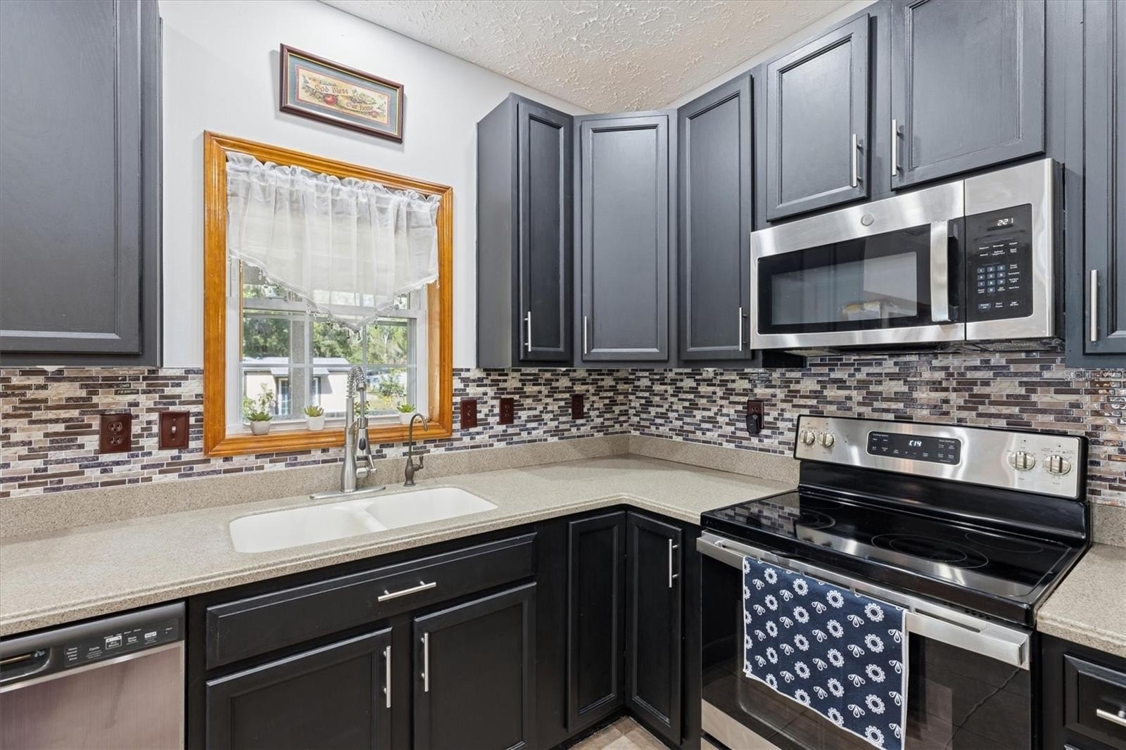 Inside, the living room features a cozy fireplace and a stunning view of the front patio and yard, giving everyday living a vacation-like feel. The kitchen is perfectly sized with a convenient dining area.