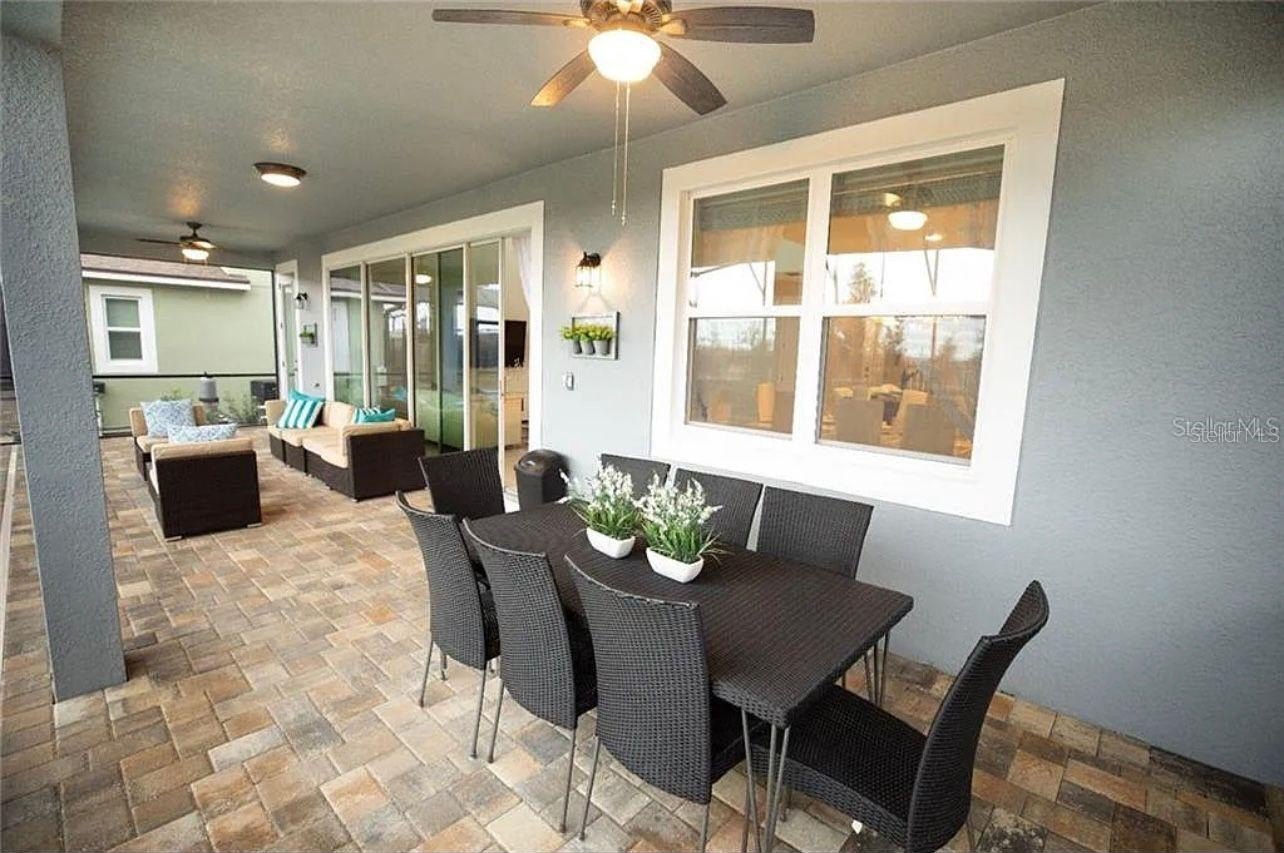 The kitchen is designed for both style and functionality, offering granite countertops, plenty of cabinet space, and all appliances included, all opening seamlessly to the inviting family room. Large sliding doors lead to the covered lanai, creating an effortless blend of indoor and outdoor living.