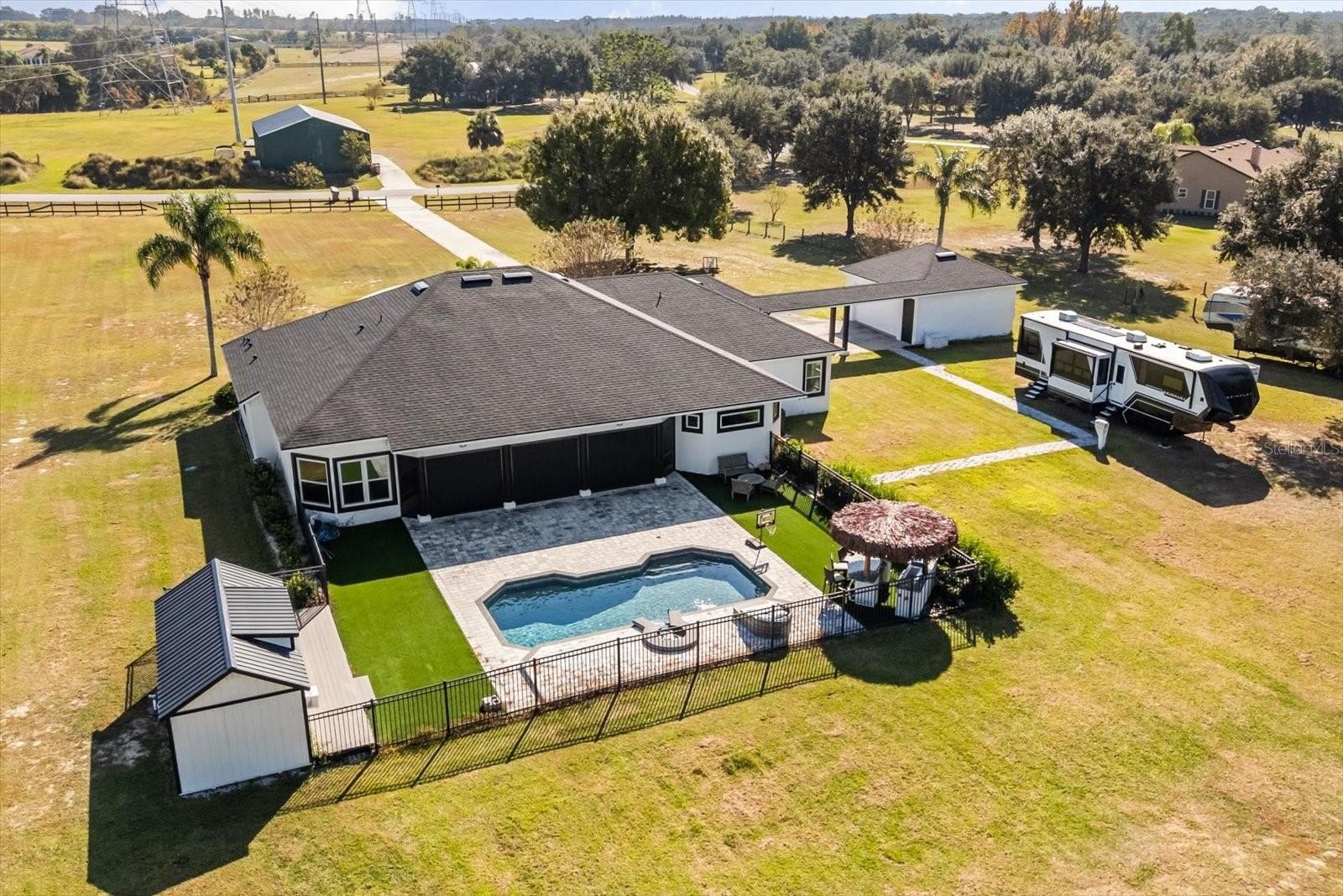 Welcome to your very own slice of Winter Garden paradise! This impressive 5.3-acre, high-and-dry property is fully fenced, offers no HOA, and is ready for its next owner. The custom-built 2003 ranch-style home now features a brand-new roof, new windows, and 2025 spray foam insulation, offering enhanced comfort, efficiency, and peace of mind. A 3-car garage, a spacious circular driveway, and a massive covered lanai—complete with a sparkling pool and relaxing jacuzzi—set the tone for luxury living. Inside, you’ll find four full bedrooms, four full bathrooms, a dedicated movie room, a wet bar, and a desirable split floor plan. The property also provides the opportunity to construct an additional structure—whether for a second residence, barn, stable, or garage with heated living space. Stylish ceiling fans and updated light fixtures add a refined touch throughout. The luxurious primary suite features direct access to the covered lanai, creating seamless indoor-outdoor living. Step outside to enjoy your private pool area, enhanced by retractable screen shades that offer extra comfort and make the patio ideal for both relaxing and entertaining. This exceptional estate combines luxury, sustainability, and expansive space in a beautifully updated environment. Don’t miss your chance to own this remarkable Winter Garden property—a true gem offering the perfect blend of serenity, modern convenience, newly upgraded features, and the freedom of no HOA.