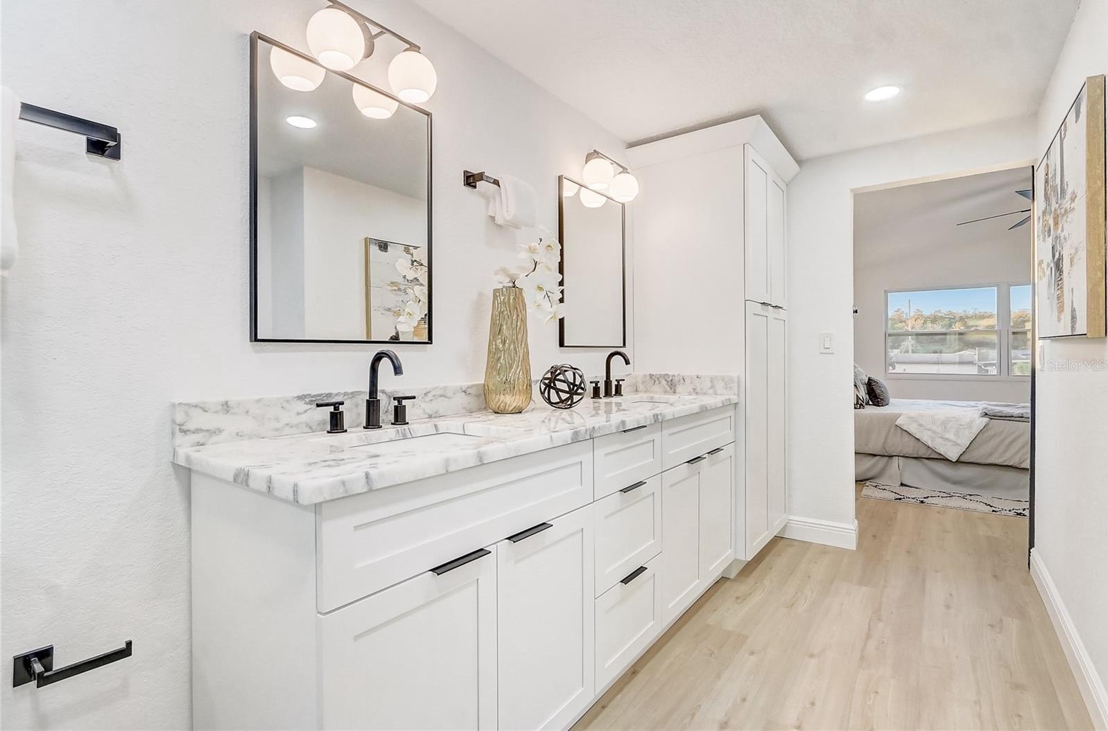 The custom kitchen is a showstopper, featuring all-new white shaker cabinets, new stainless steel appliances, and Panda Marble countertops throughout the kitchen and bathrooms, complemented by a seamless marble backsplash—perfectly blending style, function, and timeless elegance.