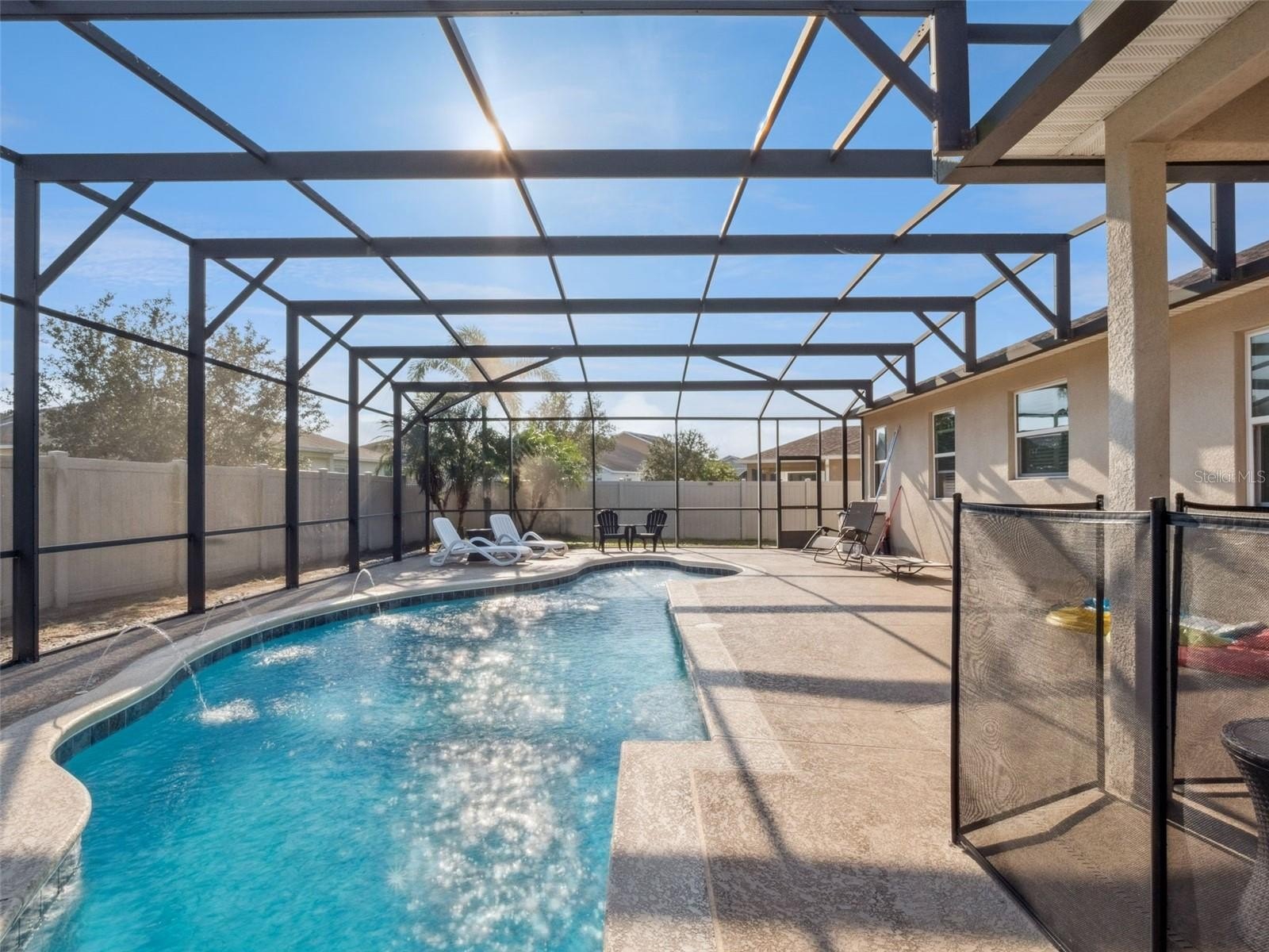 But the magic really happens outside. Welcome to your tropical oasis, featuring the legendary Manatee heated saltwater pool—complete with river-rock border, sun shelf, and therapy jets. It’s all set on a giant screened-in deck with a covered chill zone perfect for morning coffee or late-night hangs. The fenced yard lined with Florida palms gives you resort vibes without ever leaving home.