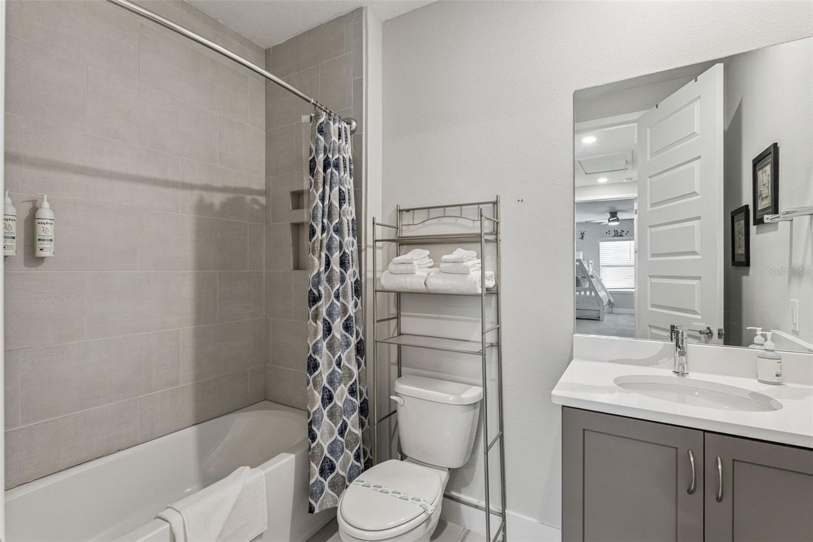 Interior features include ceramic tile flooring on the first floor, stylish vinyl flooring on the stairs and second level, and carpeted bedrooms. The home is finished with neutral décor throughout, appealing to both owners and guests. The one-car garage has been converted into a small game room, adding extra entertainment value.