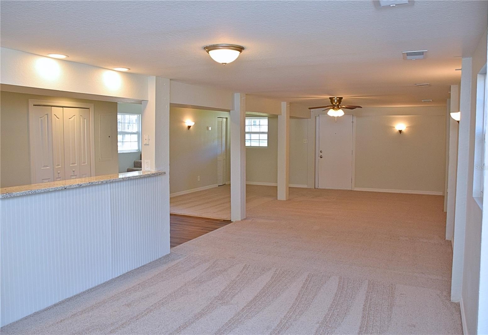 The main living area features an open-concept layout with neutral finishes, and a combination of laminate and carpet flooring. The kitchen includes white cabinetry, granite countertops, stainless steel appliances, and ample workspace for daily living or entertaining.