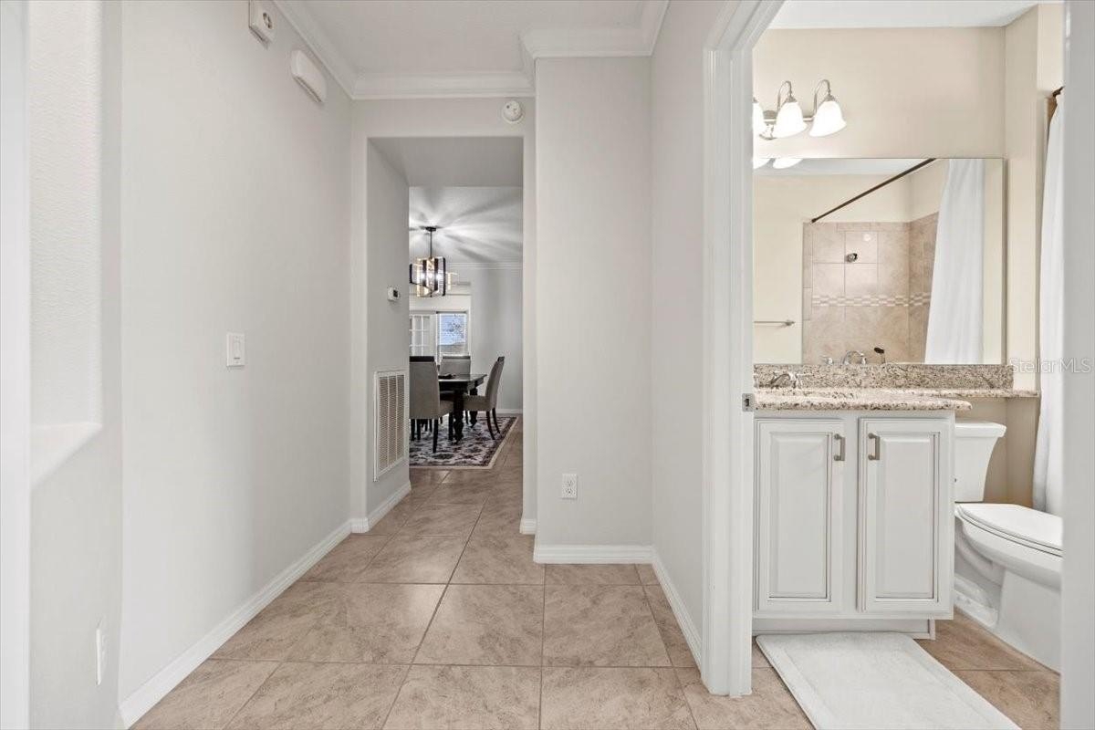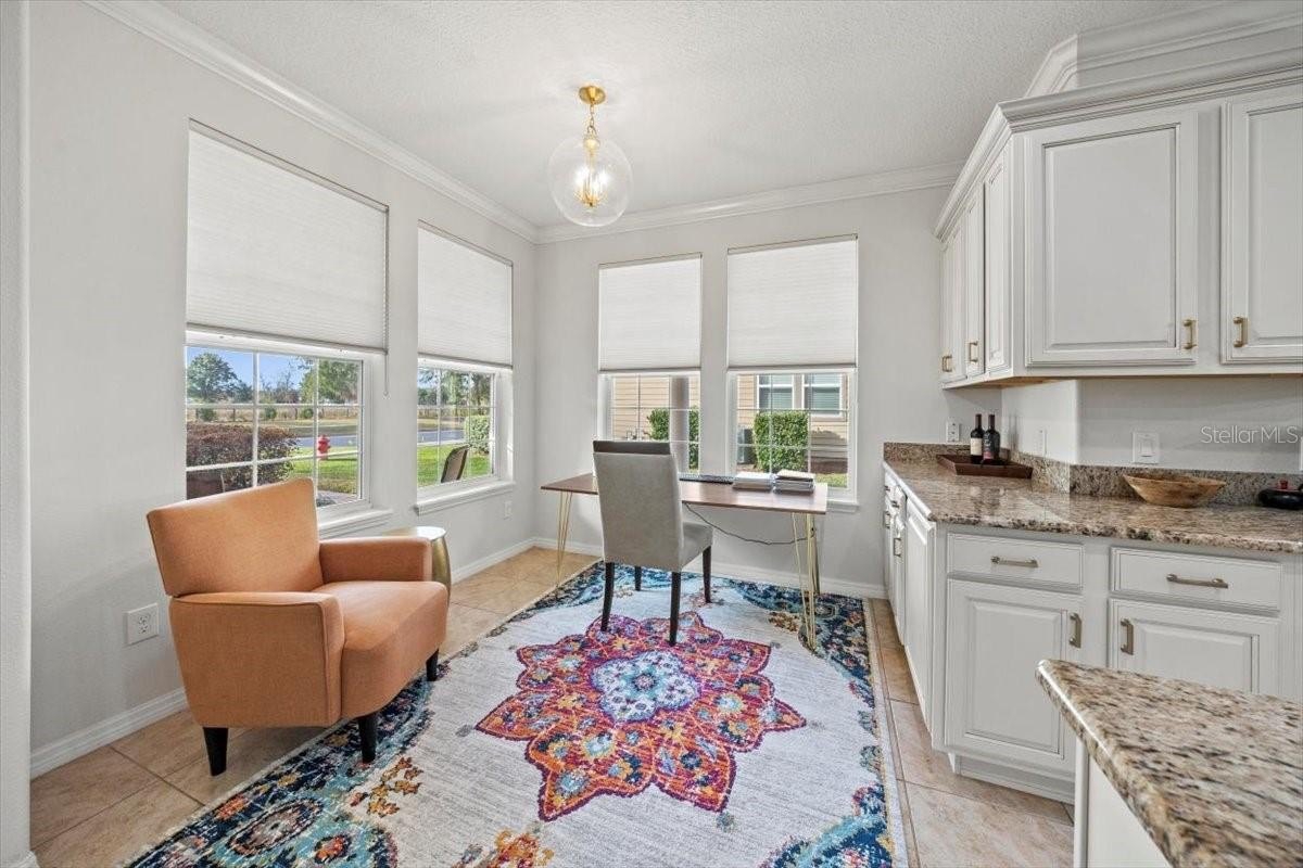 This thoughtfully designed residence features tile flooring throughout, crown molding, rounded corners, and an abundance of natural light. The enclosed den with French doors and a built-in desk provides the perfect flex space for a home office, library, or guest retreat. The open-concept kitchen is appointed with granite countertops and a charming front window overlooking the patio—offering added privacy with no neighbors directly across the street.