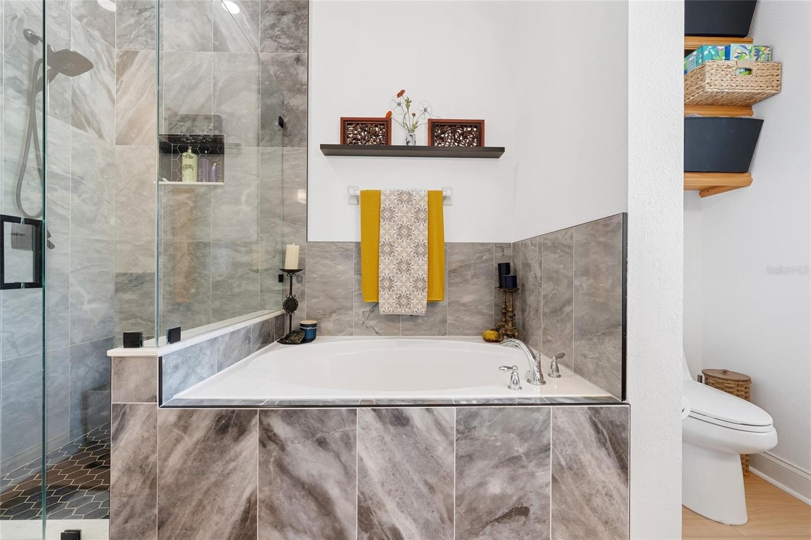 The primary suite is a true highlight. Benefiting from the corner-unit position, it is flooded with natural light throughout the day, offering an airy and tranquil retreat rarely found in condominium living. The ensuite bath is beautifully finished with a glass-enclosed shower, soaking tub, and ample vanity storage, providing both comfort and function. A well-proportioned secondary bedroom and full bath offer flexibility for guests, a home office, or additional living needs, while a full-size in-unit washer and dryer add everyday practicality.