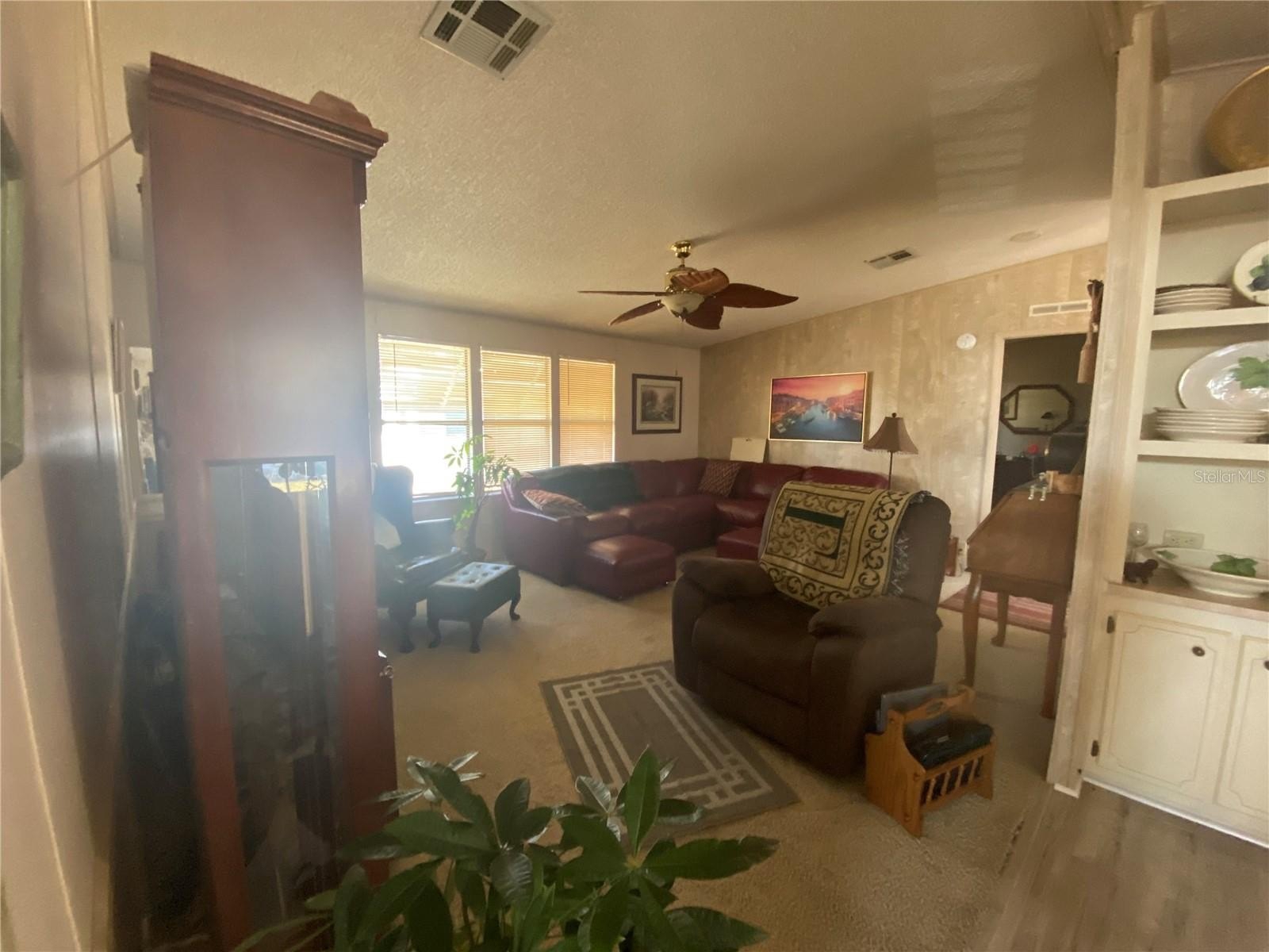 Welcome to Zellwood Station, a premier 55+ golf community! This charming 2-bedroom, 2-bath home is ideally located in the highly sought-after pet area and offers a spacious split-bedroom floor plan with generously sized rooms throughout. The home features both a living room and a family room, enhanced with built-in shelving for added character and storage. The kitchen has been refreshed with new countertops, a designer sink, and updated cabinet doors, creating a clean and modern feel. New carpet has been installed in the living room, and a new central air conditioner provides comfort and efficiency. Just off the kitchen, you’ll find a fantastic flex-space room equipped with a newly installed mini-split air conditioner—perfect for a workshop, office, craft room, storage area and the laundry room adjoined too.