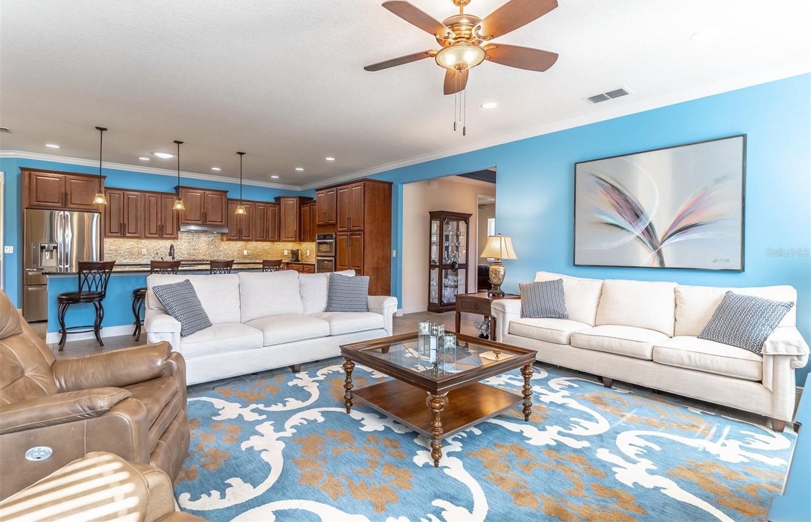 The gourmet kitchen features many upgrades including staggered cabinets, center Island with interior cabinets, tile backsplash, quartz countertops, a full-length pantry cabinet, built in oven and microwave combo, recessed lighting, pendant lights, a gas range cooktop all stainless-steel appliances.