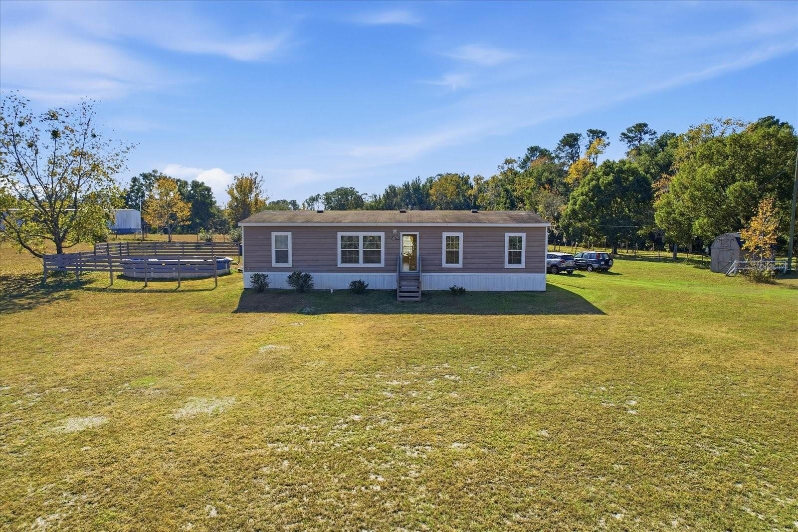 And yes— the chickens, too. Literally hold your horses & chickens in this 5.4-acre fully fenced property. This property is the perfect blend of space, security, and peaceful country living. The land features a 1-stall horse barn with tack area, a professionally installed underground bunker rated for 10–12 people, a large steel building on a slab, multiple storage sheds (one with electric), and a well-maintained above-ground pool. The home itself is a beautiful 2017, 4-bedroom, 2-bath modern manufactured home with a spacious 23' x 13' Florida room with screens and vinyl windows for year-round enjoyment. The open-concept kitchen with a large island flows into the dining and living areas, creating an inviting space for entertaining. The split-bedroom layout offers privacy for guests or family.
