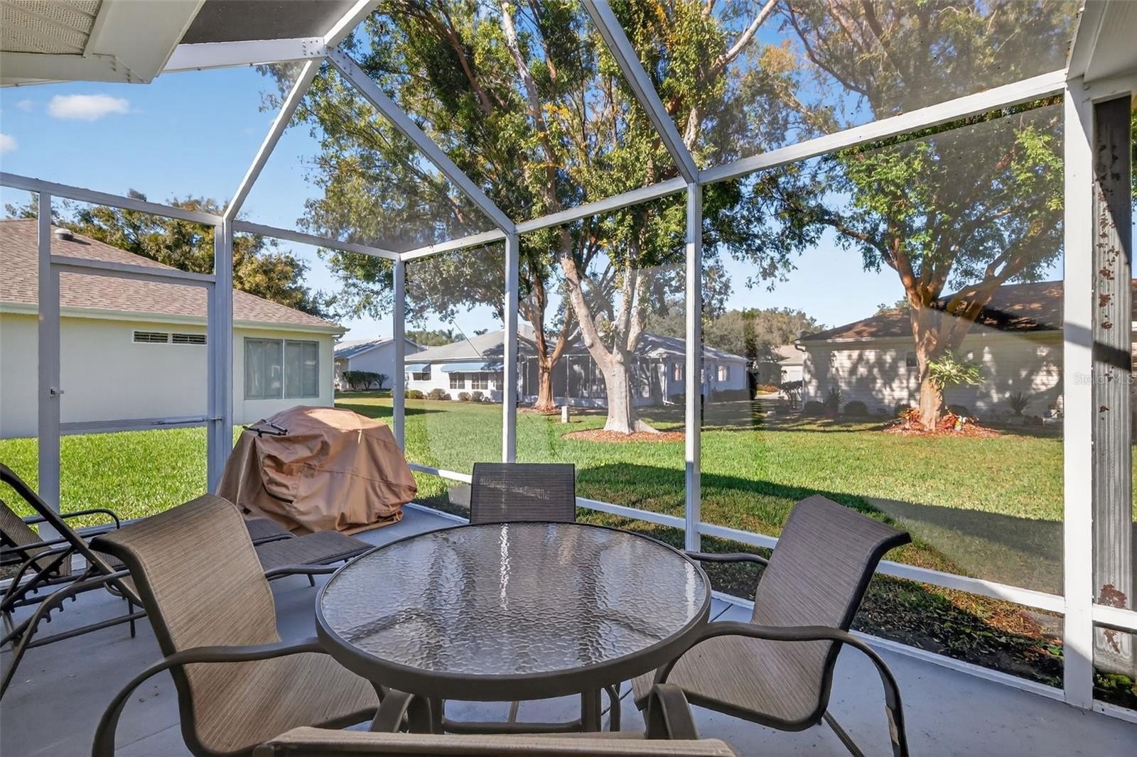 Exterior updates include a newer roof (2021/2022) and newer HVAC (2023). Outdoor living offers an enclosed lanai with a birdcage (2024). Additional features include an irrigation well with sprinkler system, a separate laundry/utility room, and a two-car garage.