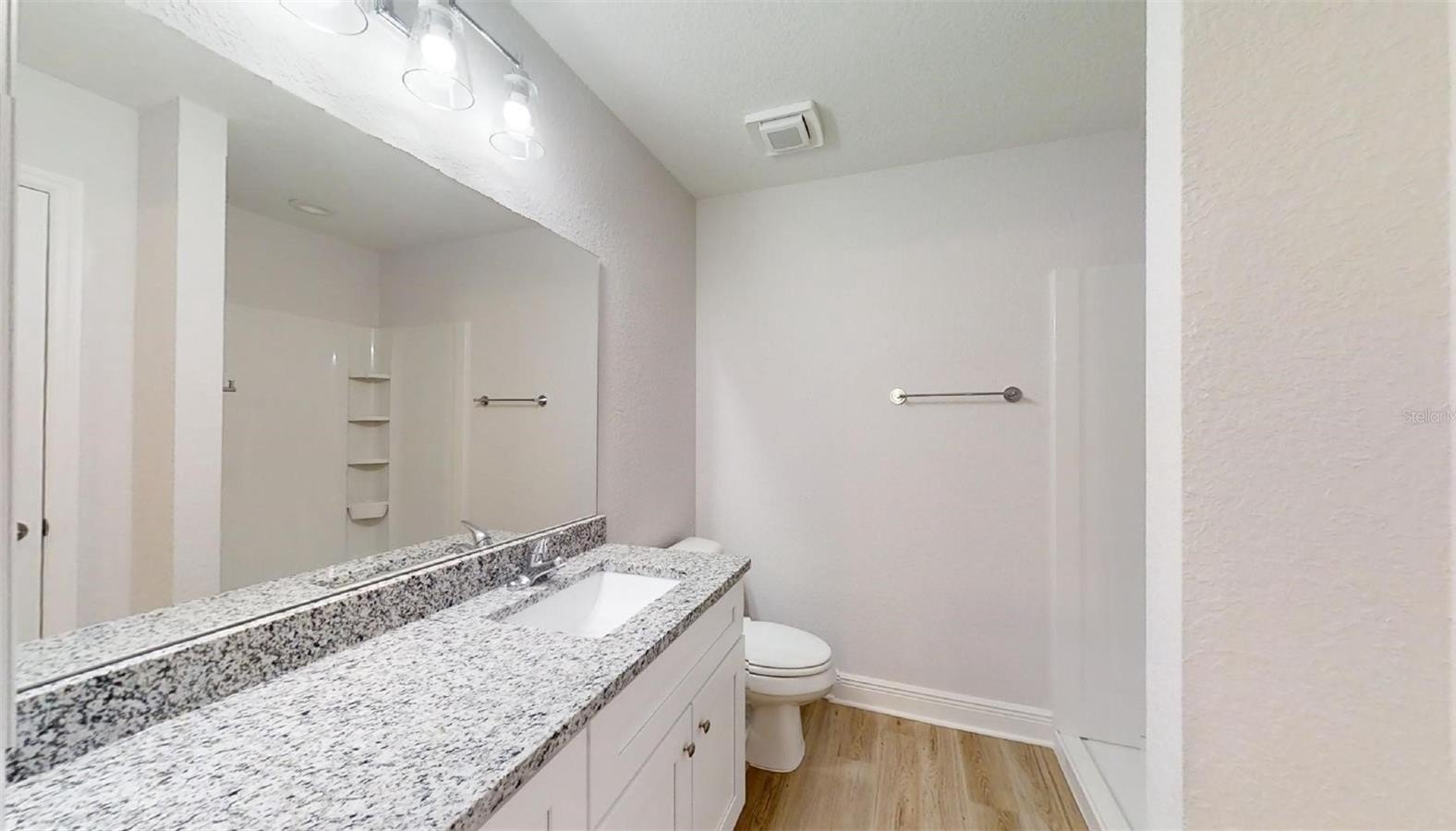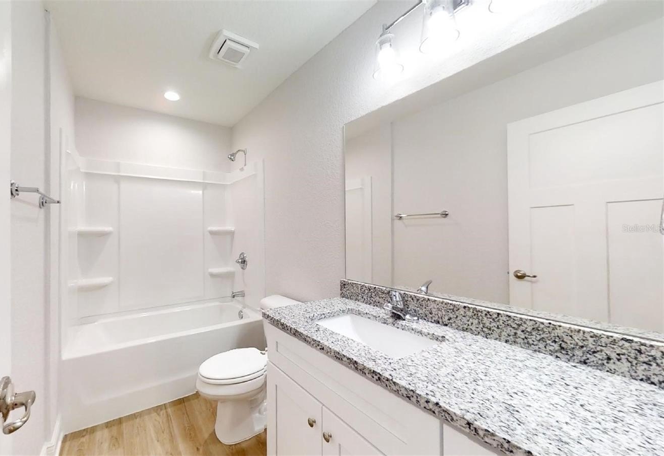 The kitchen features granite countertops and a stainless-steel appliance package, combining style with functionality for any home chef.