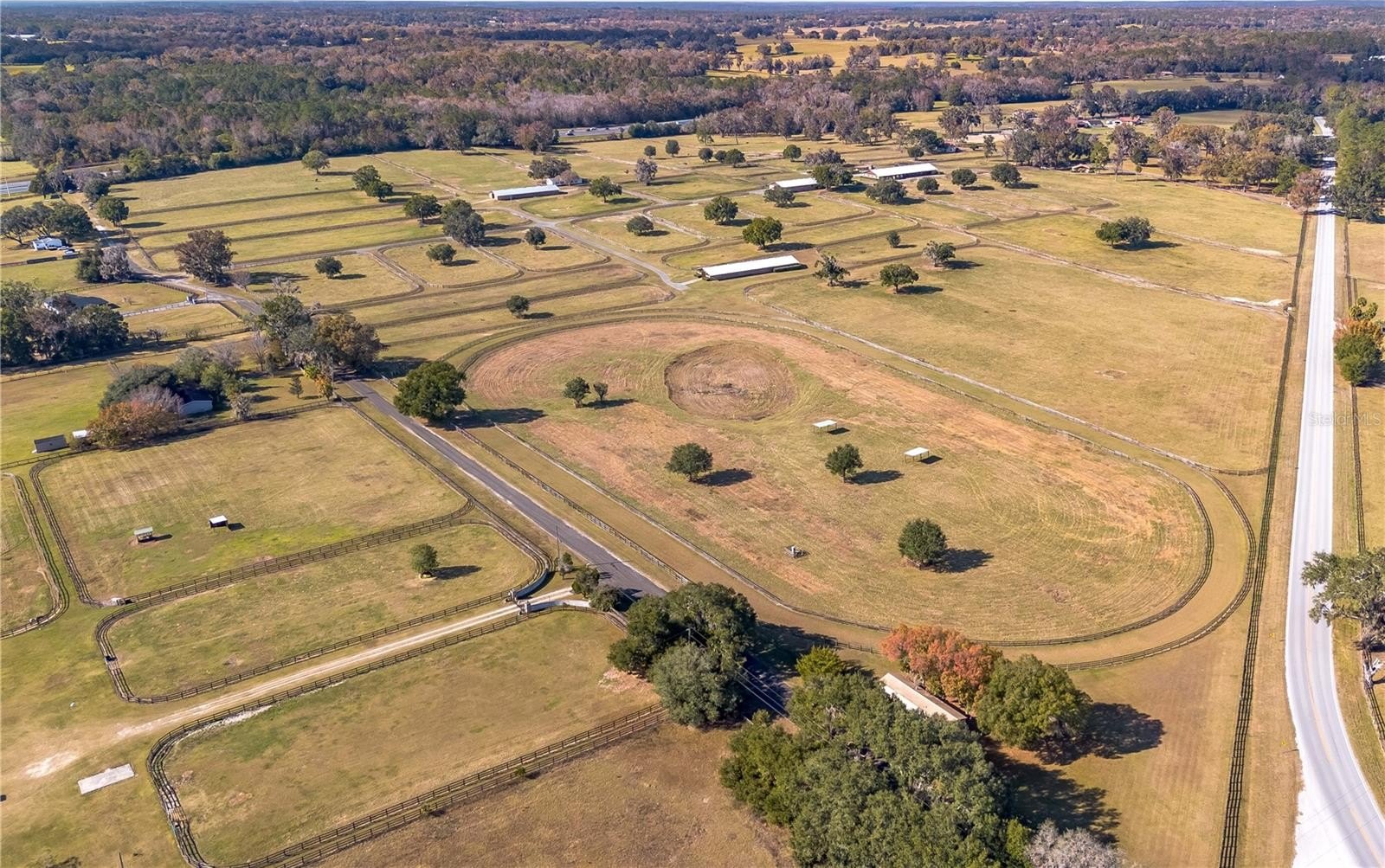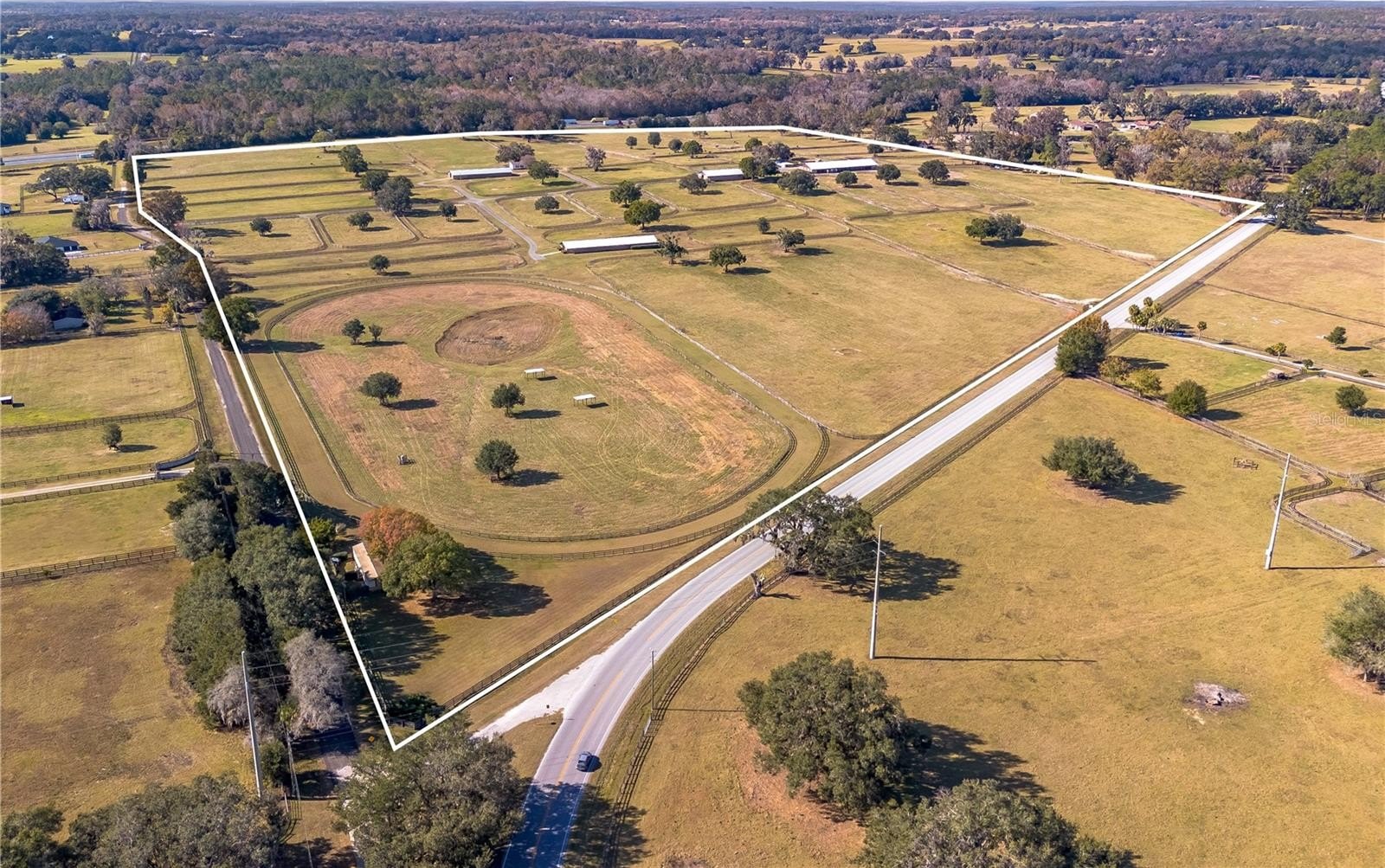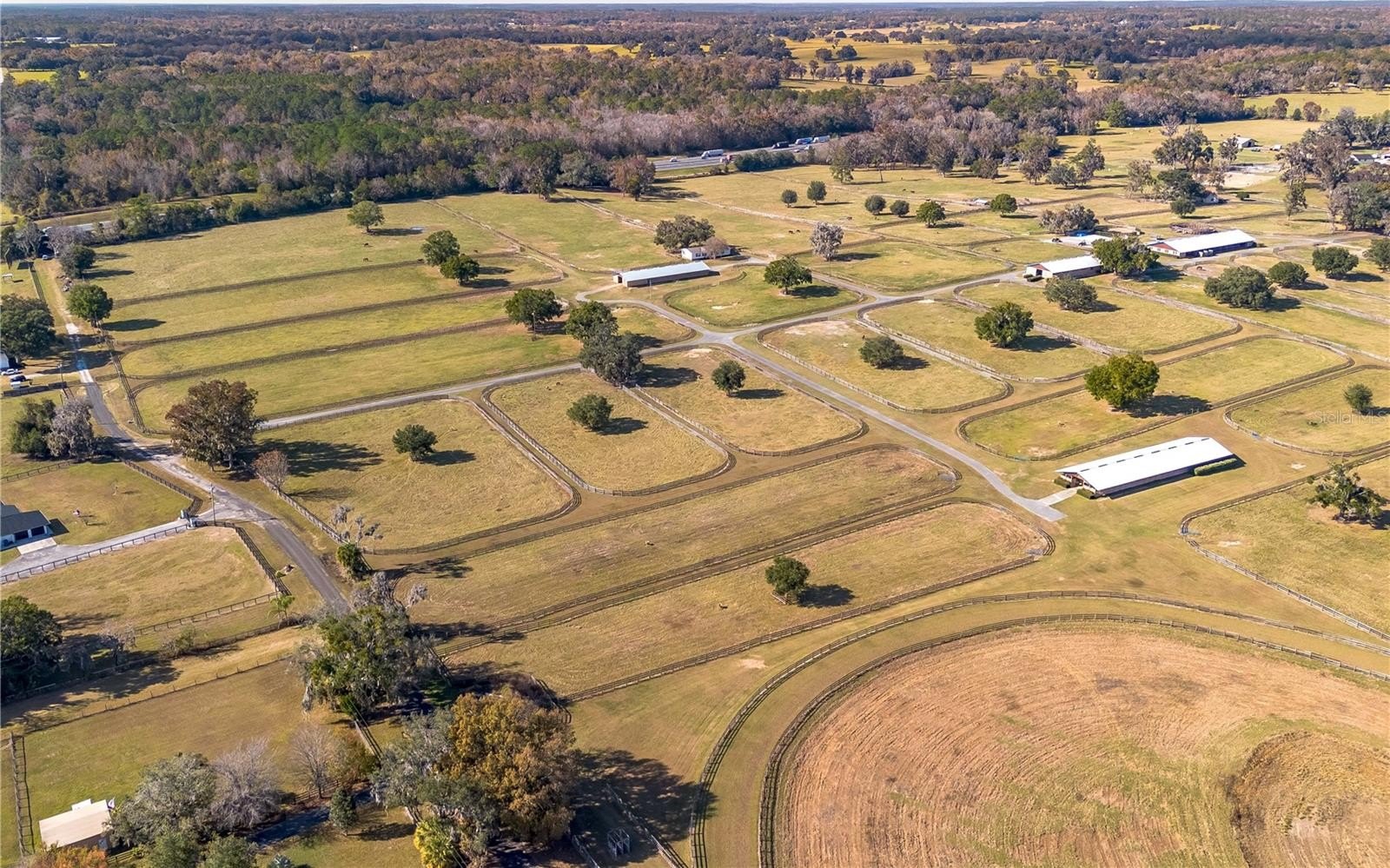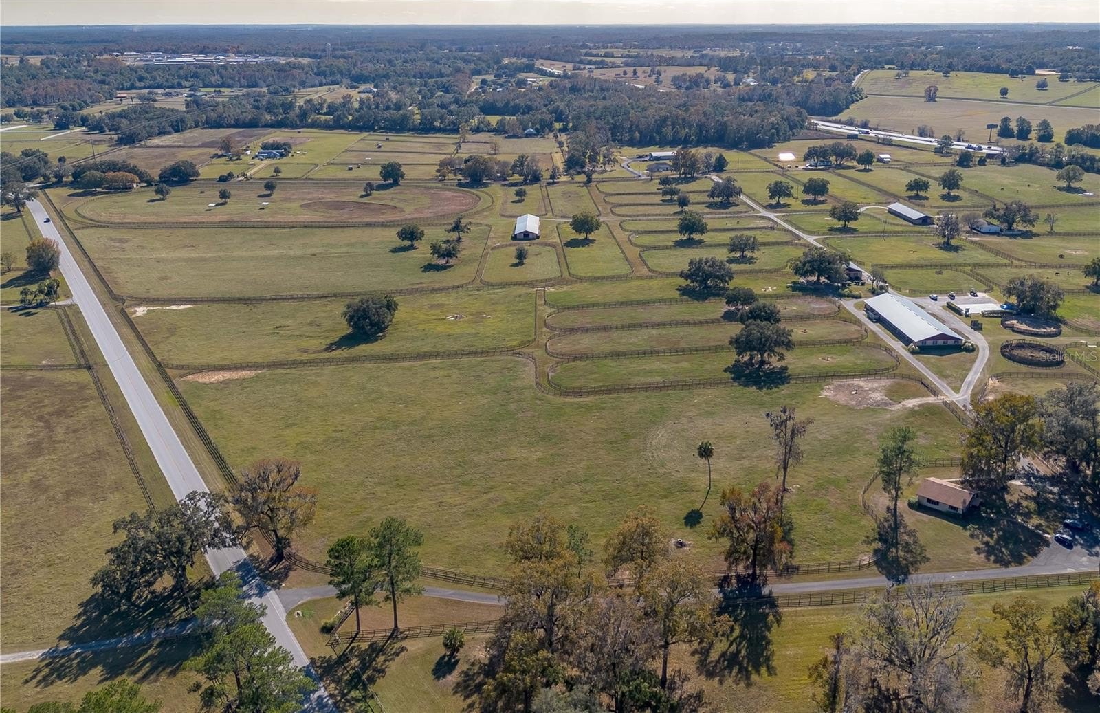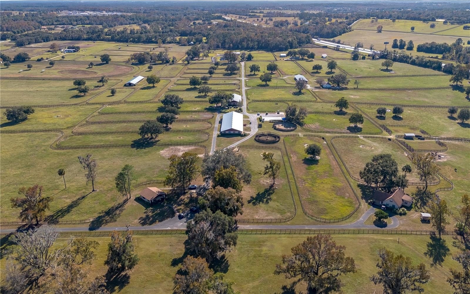 Dreaming of taking your equestrian venture to the next level? Welcome to this extraordinary 100-acre farm, where turnkey infrastructure meets peaceful countryside living! Nestled just a short drive from both HITS and the World Equestrian Center (WEC) and just minutes from Ocala and I-75, this property is perfectly positioned to take advantage of everything Ocala has to offer. The property features multiple gated entries, each following a paved driveway that continues throughout the property to ensure smooth access to every portion of the farm. Rolling green pastures and paddocks stretch out in every direction, each thoughtfully designed to include their own mature oak trees for much needed shade. Five high-quality barns are established on the farm, currently offering a total of 64 stalls combined, including a smaller 7-stall barn that would be ideal for stallions or foaling. A turf gallop track is ideal for conditioning year-round, and the farm also includes a eurocizer, round pen, and ample open space to train. This farm is designed with serious equestrian operations in mind from start to finish. Residences include a warm, welcoming A-frame main home with vaulted ceilings, a stone fireplace, and sunlit gathering spaces. The open kitchen flows easily into the living and dining areas, while the primary suite on the main floor provides privacy and retreat. A separate office building supports business operations, and a double-wide mobile home serves as the on-site manager’s residence, completing the property's thoughtful layout. Whether you’re launching a training operation, expanding an existing equine business, or seeking a private haven with unmatched infrastructure, this estate is a rare opportunity in one of Florida’s most prestigious equestrian regions. Smaller acreage options may be available—please contact the listing agent for details.