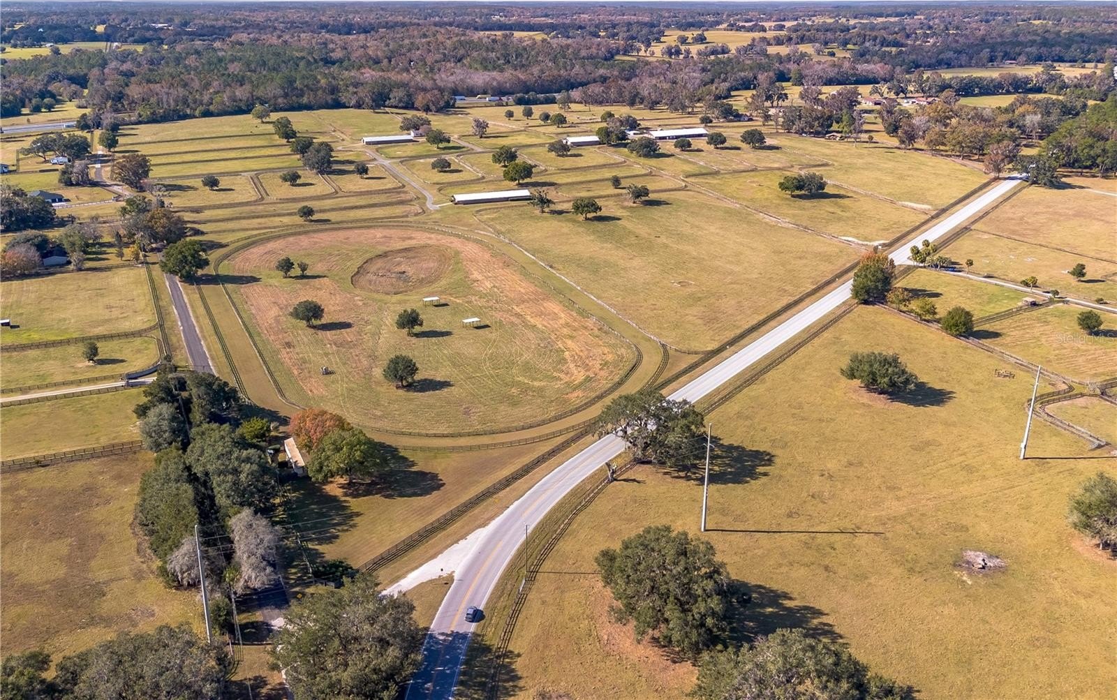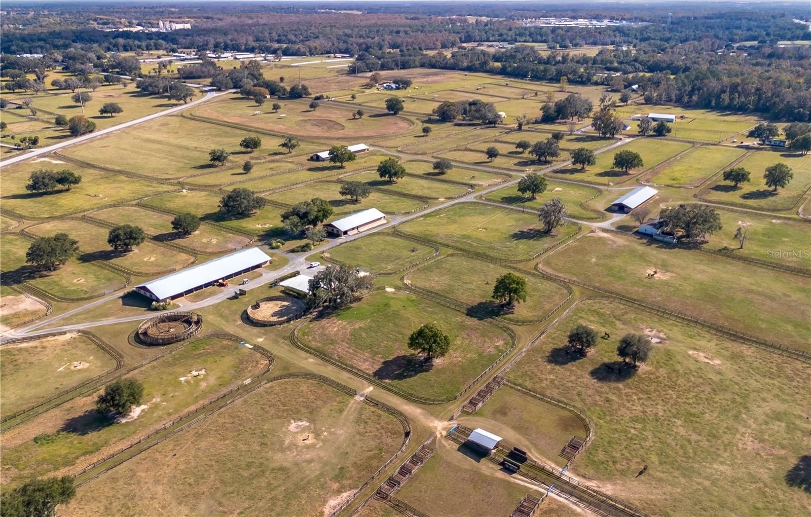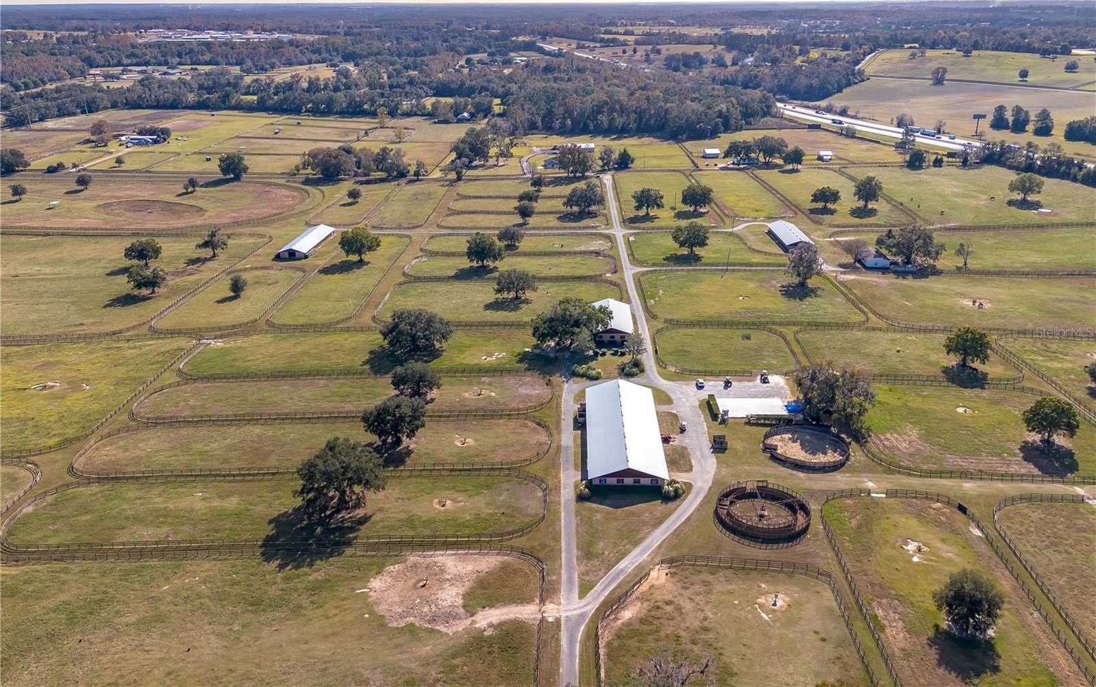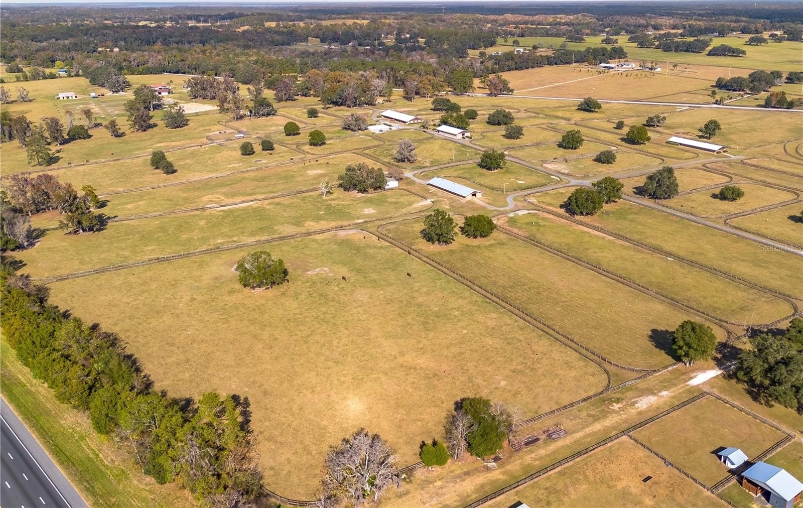 Dreaming of taking your equestrian venture to the next level? Welcome to this extraordinary 100-acre farm, where turnkey infrastructure meets peaceful countryside living! Nestled just a short drive from both HITS and the World Equestrian Center (WEC) and just minutes from Ocala and I-75, this property is perfectly positioned to take advantage of everything Ocala has to offer. The property features multiple gated entries, each following a paved driveway that continues throughout the property to ensure smooth access to every portion of the farm. Rolling green pastures and paddocks stretch out in every direction, each thoughtfully designed to include their own mature oak trees for much needed shade. Five high-quality barns are established on the farm, currently offering a total of 64 stalls combined, including a smaller 7-stall barn that would be ideal for stallions or foaling. A turf gallop track is ideal for conditioning year-round, and the farm also includes a eurocizer, round pen, and ample open space to train. This farm is designed with serious equestrian operations in mind from start to finish. Residences include a warm, welcoming A-frame main home with vaulted ceilings, a stone fireplace, and sunlit gathering spaces. The open kitchen flows easily into the living and dining areas, while the primary suite on the main floor provides privacy and retreat. A separate office building supports business operations, and a double-wide mobile home serves as the on-site manager’s residence, completing the property's thoughtful layout. Whether you’re launching a training operation, expanding an existing equine business, or seeking a private haven with unmatched infrastructure, this estate is a rare opportunity in one of Florida’s most prestigious equestrian regions. Smaller acreage options may be available—please contact the listing agent for details.