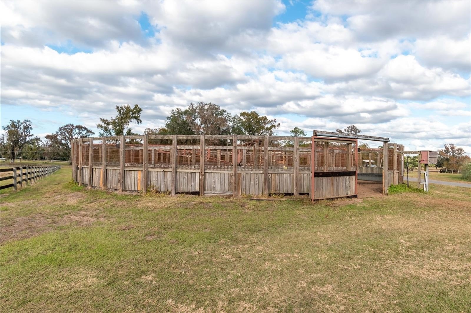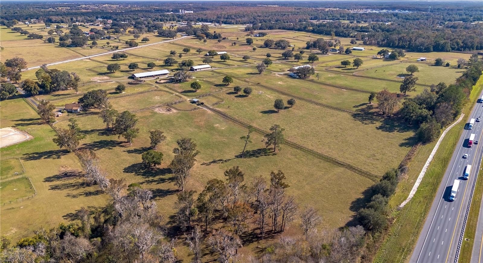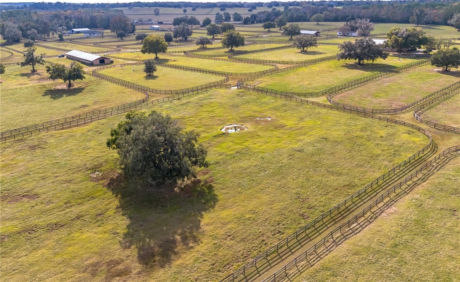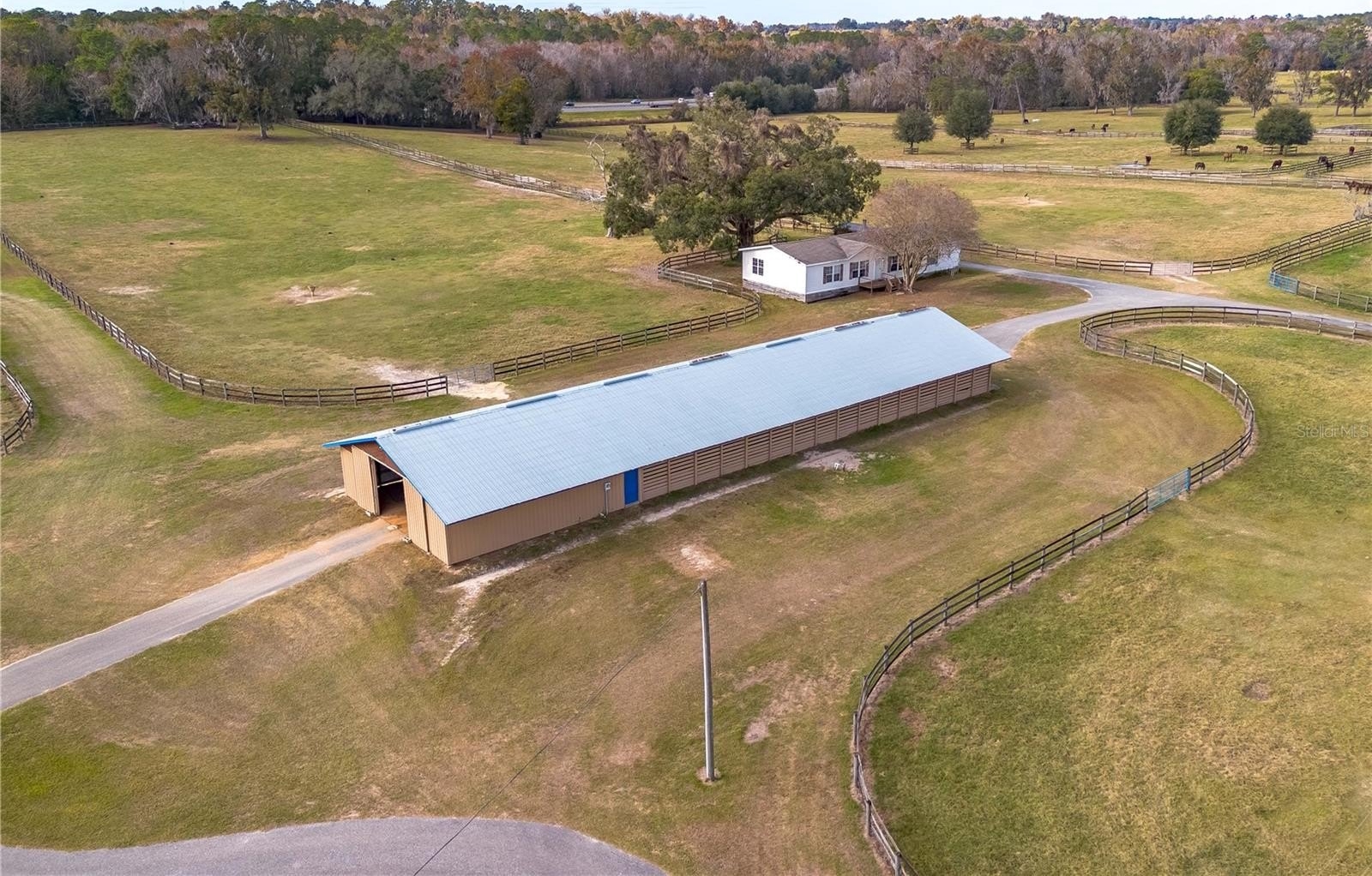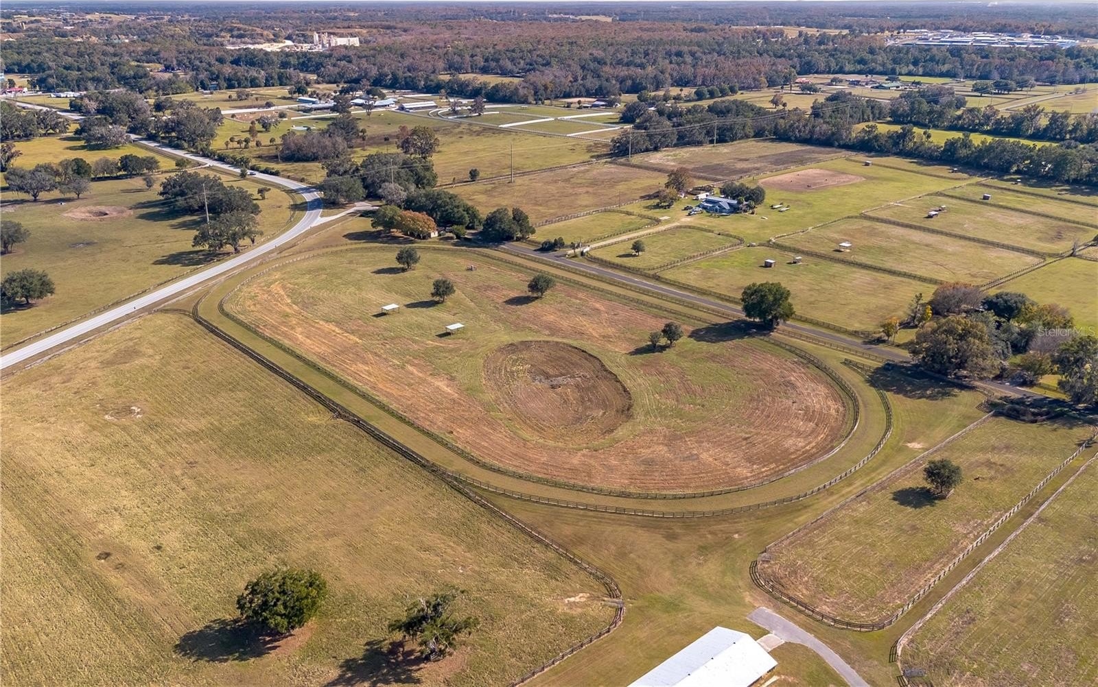 Dreaming of taking your equestrian venture to the next level? Welcome to this extraordinary 100-acre farm, where turnkey infrastructure meets peaceful countryside living! Nestled just a short drive from both HITS and the World Equestrian Center (WEC) and just minutes from Ocala and I-75, this property is perfectly positioned to take advantage of everything Ocala has to offer. The property features multiple gated entries, each following a paved driveway that continues throughout the property to ensure smooth access to every portion of the farm. Rolling green pastures and paddocks stretch out in every direction, each thoughtfully designed to include their own mature oak trees for much needed shade. Five high-quality barns are established on the farm, currently offering a total of 64 stalls combined, including a smaller 7-stall barn that would be ideal for stallions or foaling. A turf gallop track is ideal for conditioning year-round, and the farm also includes a eurocizer, round pen, and ample open space to train. This farm is designed with serious equestrian operations in mind from start to finish. Residences include a warm, welcoming A-frame main home with vaulted ceilings, a stone fireplace, and sunlit gathering spaces. The open kitchen flows easily into the living and dining areas, while the primary suite on the main floor provides privacy and retreat. A separate office building supports business operations, and a double-wide mobile home serves as the on-site manager’s residence, completing the property's thoughtful layout. Whether you’re launching a training operation, expanding an existing equine business, or seeking a private haven with unmatched infrastructure, this estate is a rare opportunity in one of Florida’s most prestigious equestrian regions. Smaller acreage options may be available—please contact the listing agent for details.
