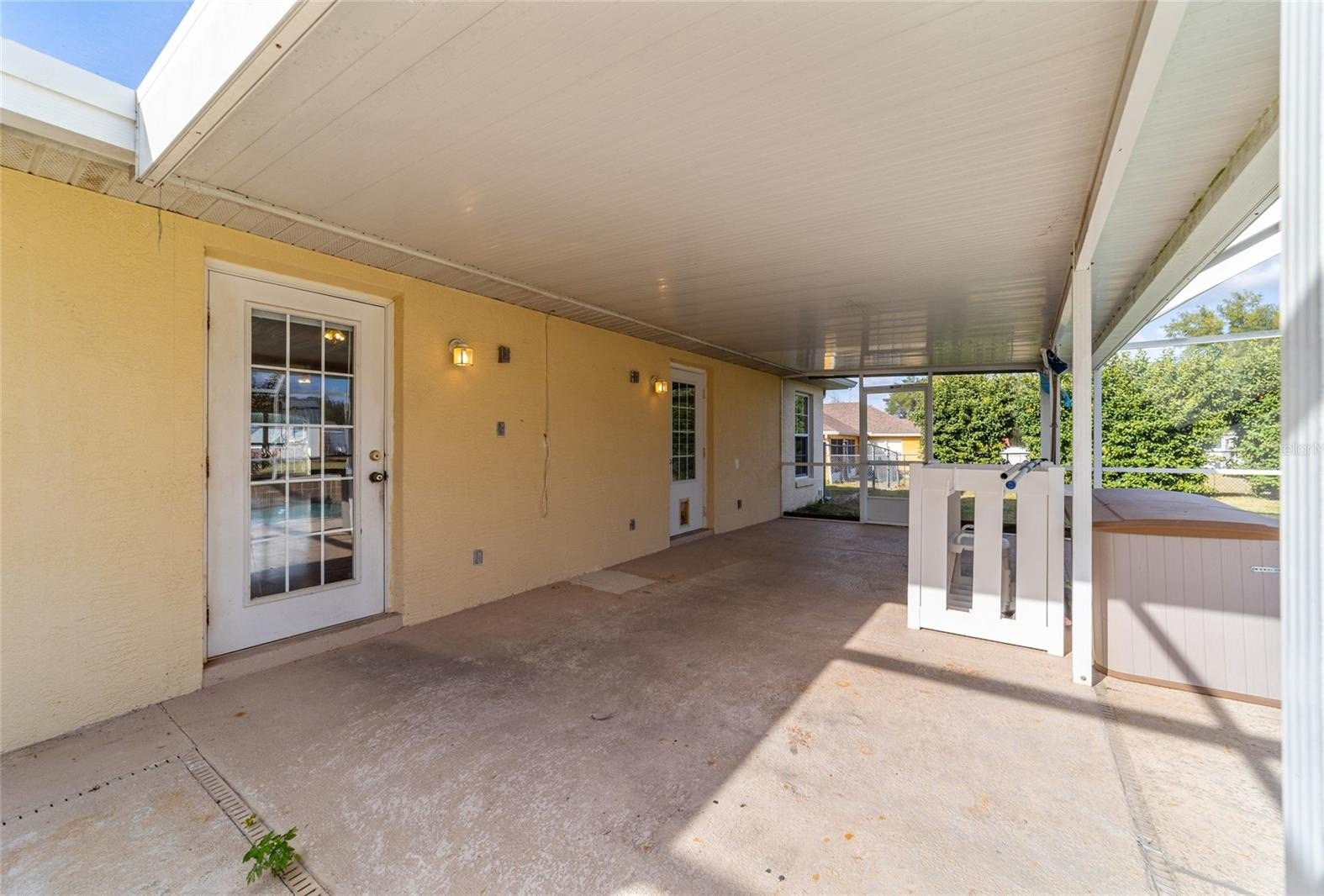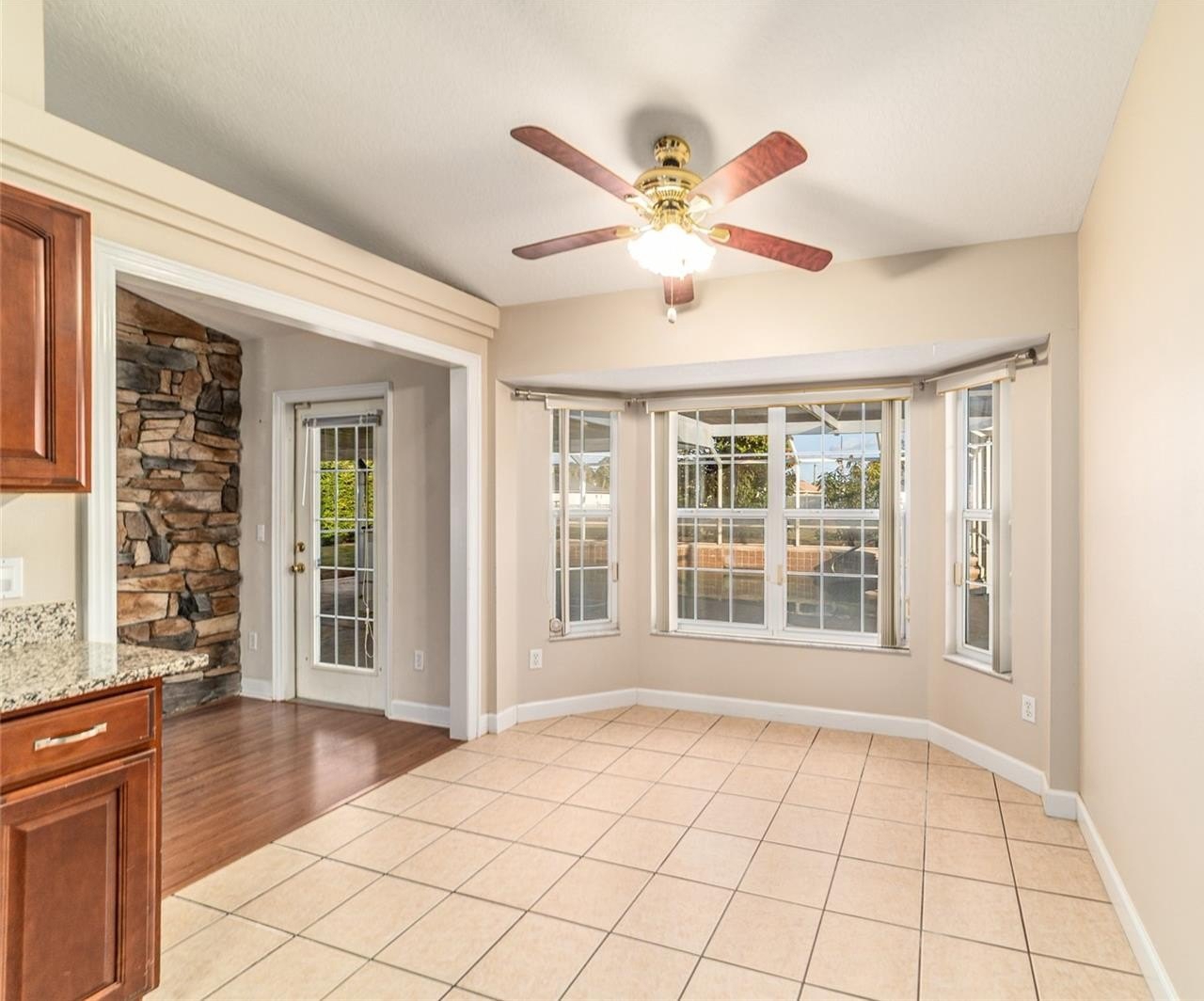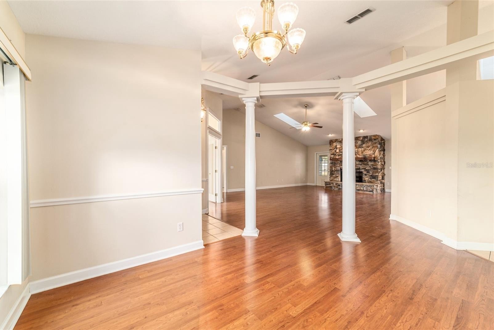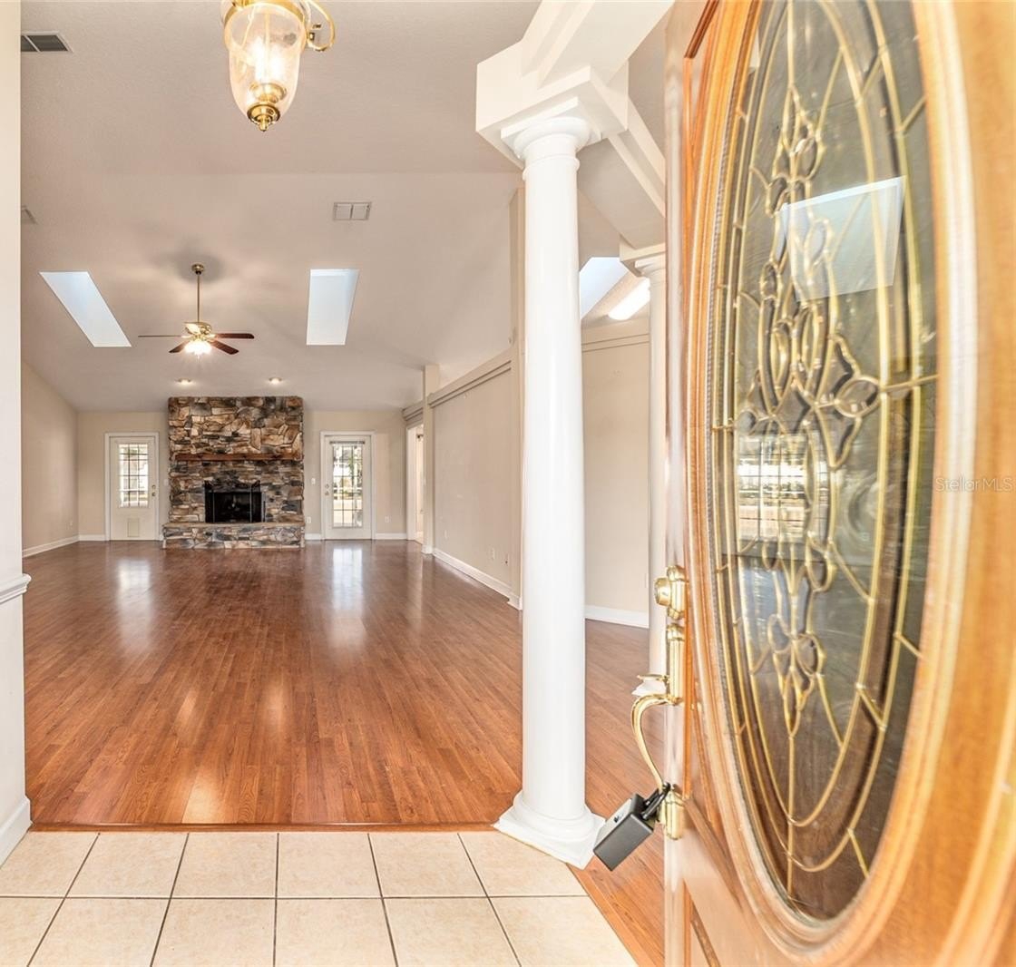 Immediate occupancy available in this beautifully maintained Triple Crown–built POOL home situated on nearly ½ an acre in Ocala — no HOA! Offering over 2,300 square feet of living space, this home features 3 bedrooms, an office, and 2 bathrooms with a thoughtful split-bedroom design. Step inside to a welcoming entry foyer leading to an open, light-filled layout enhanced by volume ceilings, skylights, and decorative columns in the formal dining area. The spacious living room showcases a stone fireplace and French doors that open to the covered lanai and screened pool area — perfect for indoor-outdoor living. The kitchen offers abundant cabinetry, granite countertops, stainless steel appliances, a walk-in pantry, and a generous breakfast nook for casual dining. The primary suite is a true retreat with a large walk-in closet, soaking tub, separate shower, and dual vanities. Two additional bedrooms, a full bath, and a dedicated office provide flexibility for guests or work-from-home needs. Additional highlights include an indoor laundry room with washer, dryer, and utility sink, an oversized 22x24 two-car garage, fenced yard, and enclosed pool area—perfect for year-round enjoyment. Recent updates include a new roof (2024) and new HVAC system (2025). Easy to show and ready for immediate occupancy—this home checks all the boxes! SHED does not convey.