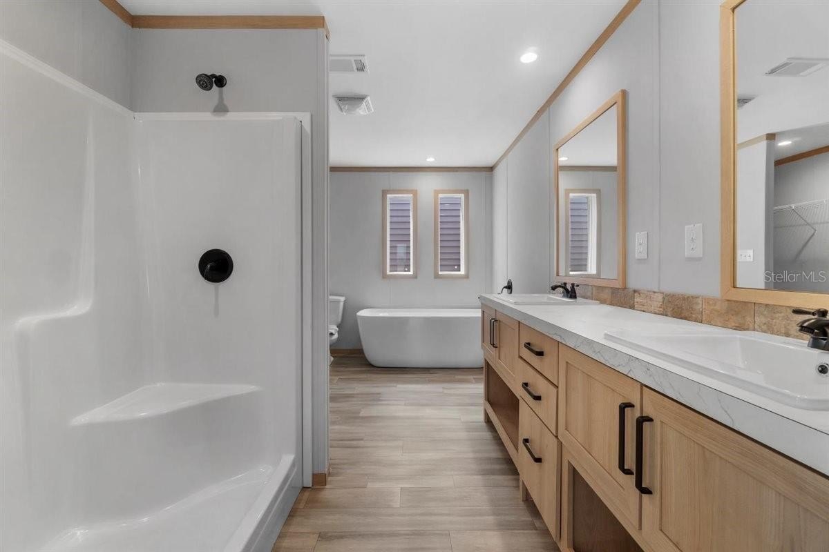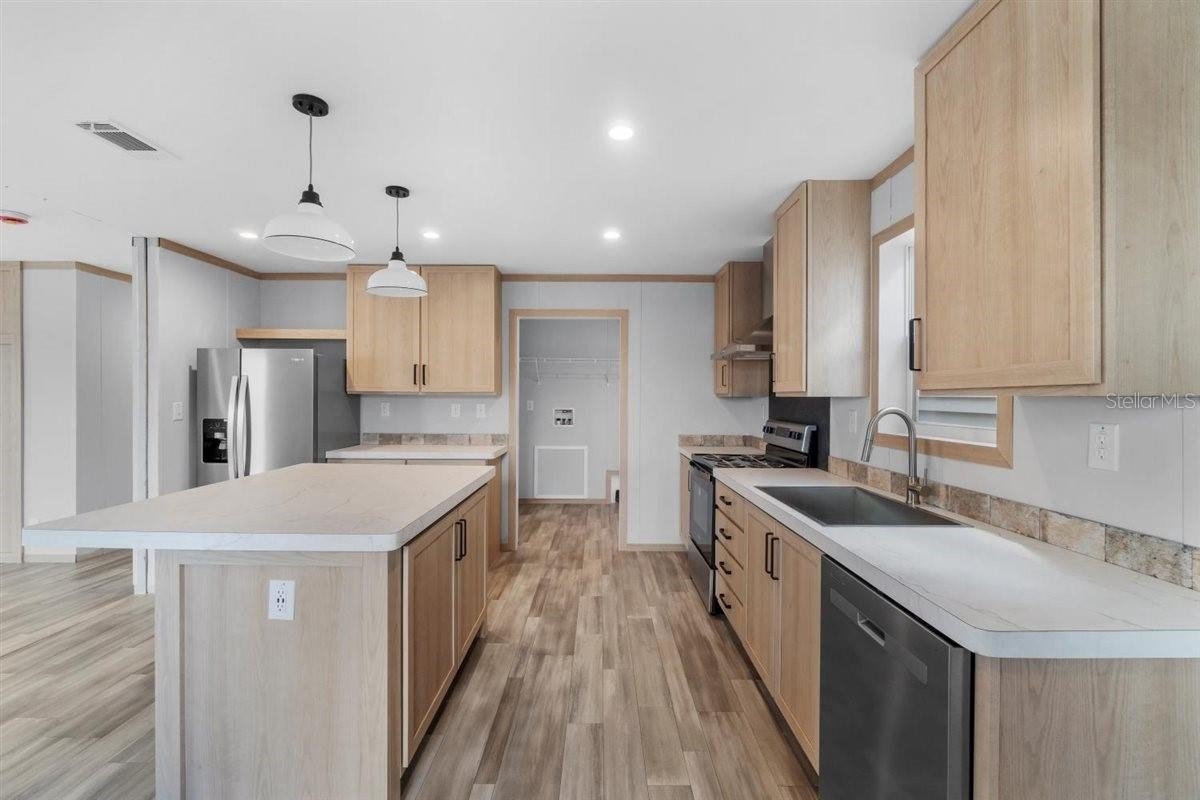 Own your own land with city sewer and city water! Experience the perfect blend of modern living and natural beauty with this BRAND-NEW manufactured home, situated on a lot that you own! Offering 3 bedrooms, 2 bathrooms, and over 1,400 square feet of thoughtfully designed living space. From the moment you arrive, you'll be charmed by the recessed dormer over the front door with vertical vinyl accent, and vinyl door and window trim. Step inside and immediately appreciate the high-quality finishes and attention to detail, from the 4-panel board and batten accent wall or the luxury linoleum flooring throughout, to the open- concept layout that effortlessly connects the living, dining, and kitchen areas-ideal for entertaining. The chef-inspired kitchen is a true highlight, featuring brand-new stainless steel appliances, a sleek chimney range hood, stainless steel sink with a gooseneck faucet, 42" shaker-style cabinets, and canopy-style pendant lighting hanging over the center with a breakfast bar. The primary bedroom offers a serene retreat, complete with a large walk-in closet and a luxurious en-suite bathroom featuring a free-standing soaking garden tub, separate 60" shower, and dual vanities with cubby holes and a bank of drawers-perfect for keeping all your essentials organized. Two additional bedrooms provide comfortable space for family or guests, while the second full bathroom includes a single vanity and a tub/shower combo, perfect for letting guests soak the day away! Additional upgrades include a