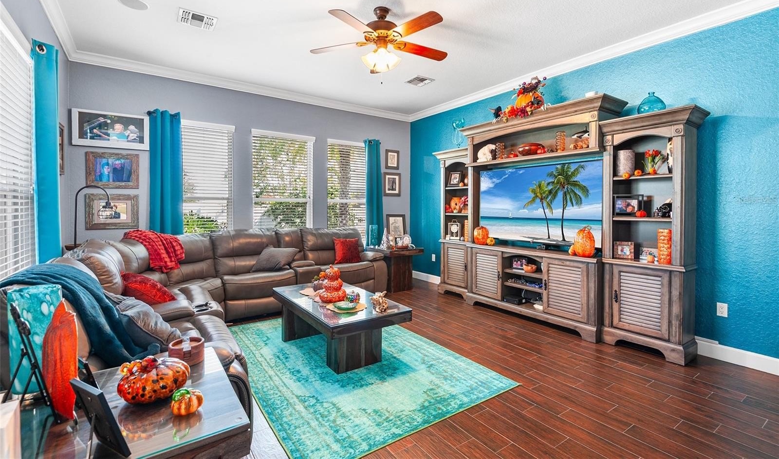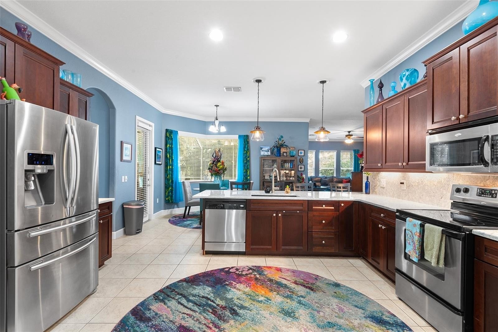 This 3-bedroom, 2.5-bath residence showcases colorful designer themes and custom finishes throughout. The centerpiece of the home is the huge gourmet kitchen, featuring hand-picked quartz countertops that are second to none, abundant cabinetry, stainless-steel appliances, and a large open layout perfect for entertaining or family gatherings. The spacious living area offers vaulted ceilings and natural light, while the primary suite provides a serene retreat with a walk-in closet, dual-sink vanity, and walk-in shower.