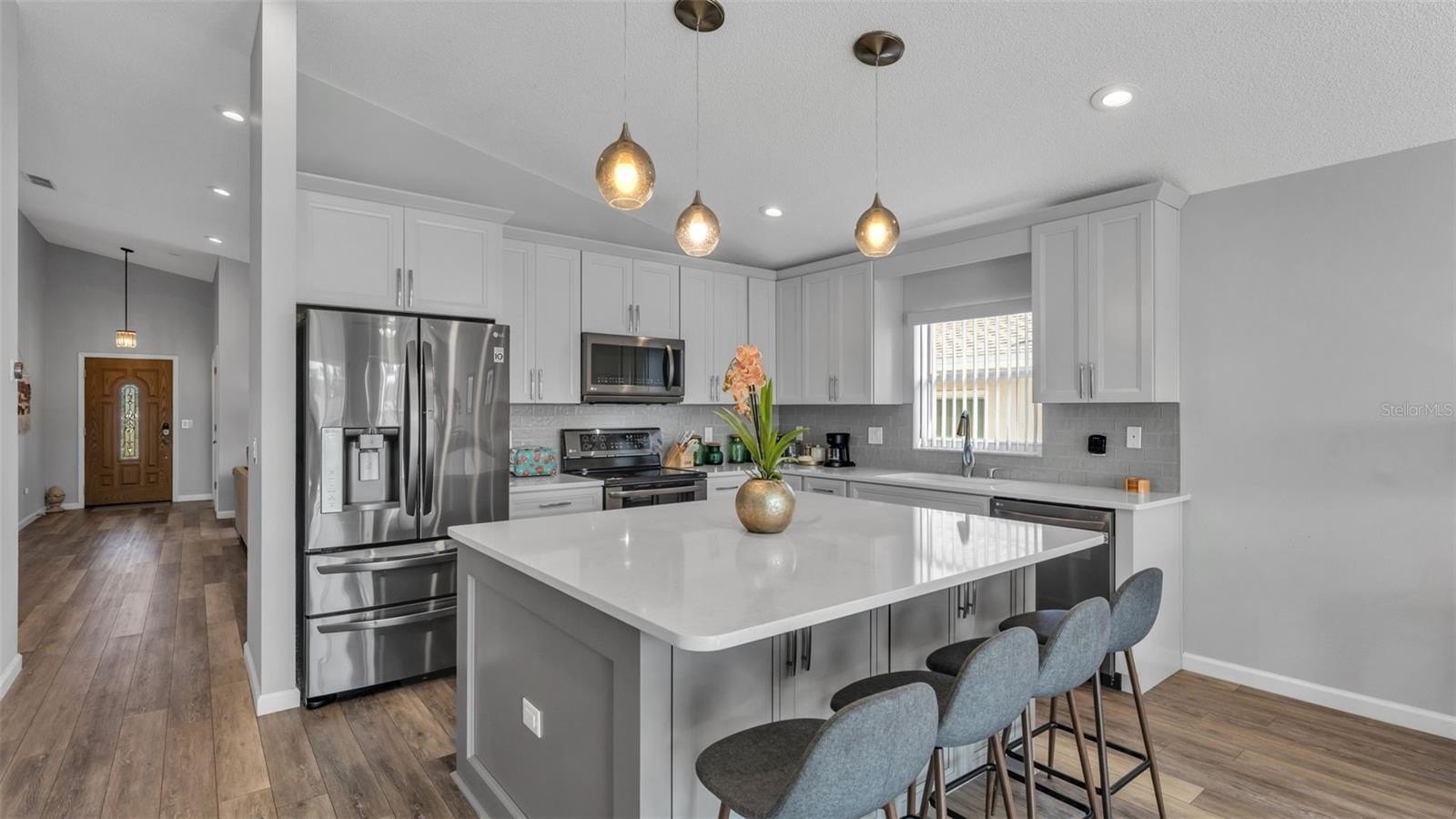 Step inside and be greeted by rich wood flooring and an open-concept design designed for seamless entertaining. The gourmet kitchen is a chef’s delight, anchored by a dramatic oversized island and breakfast bar, premium granite countertops, and brand-new appliances — the perfect setting for elevated gatherings.
