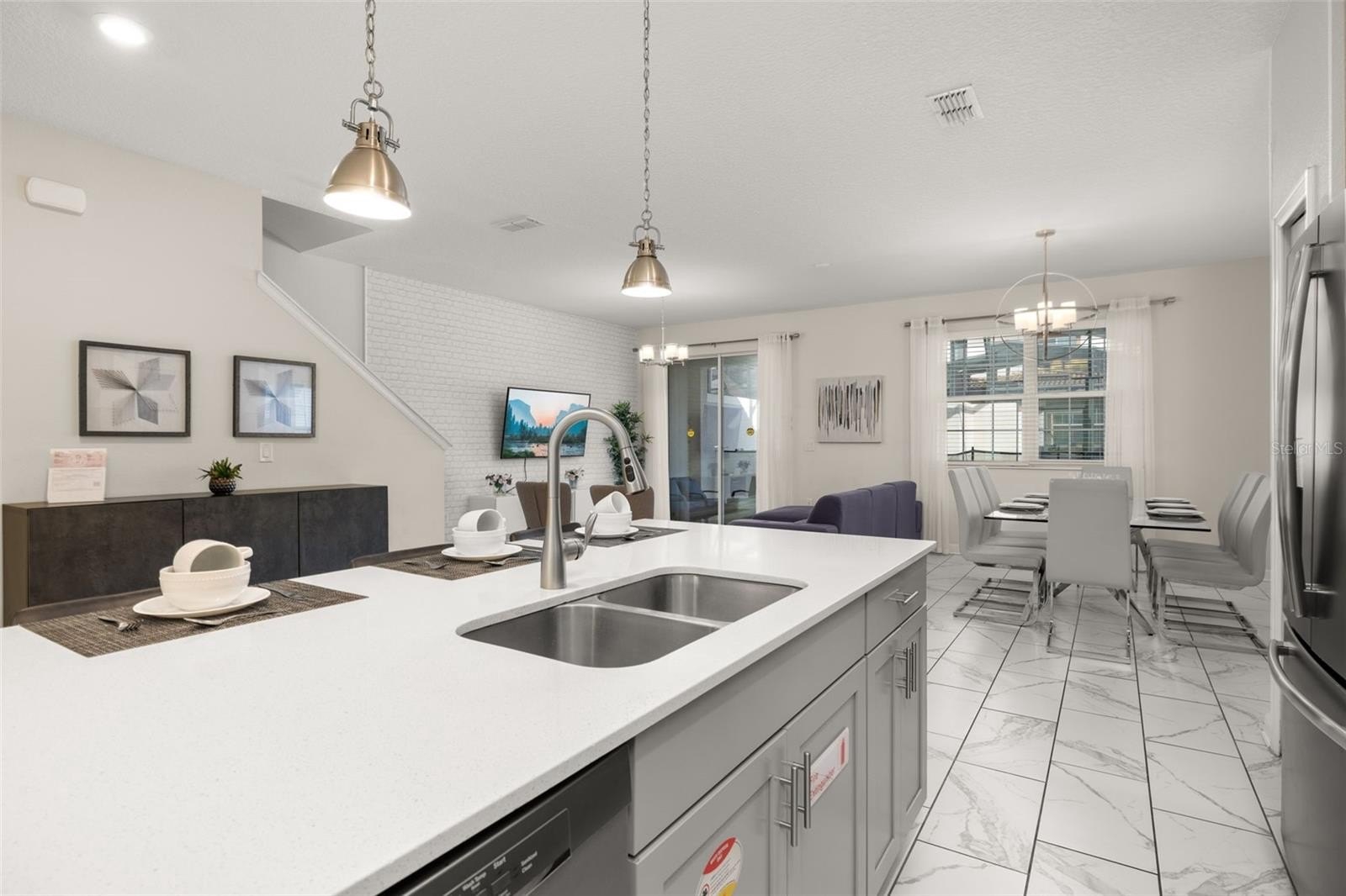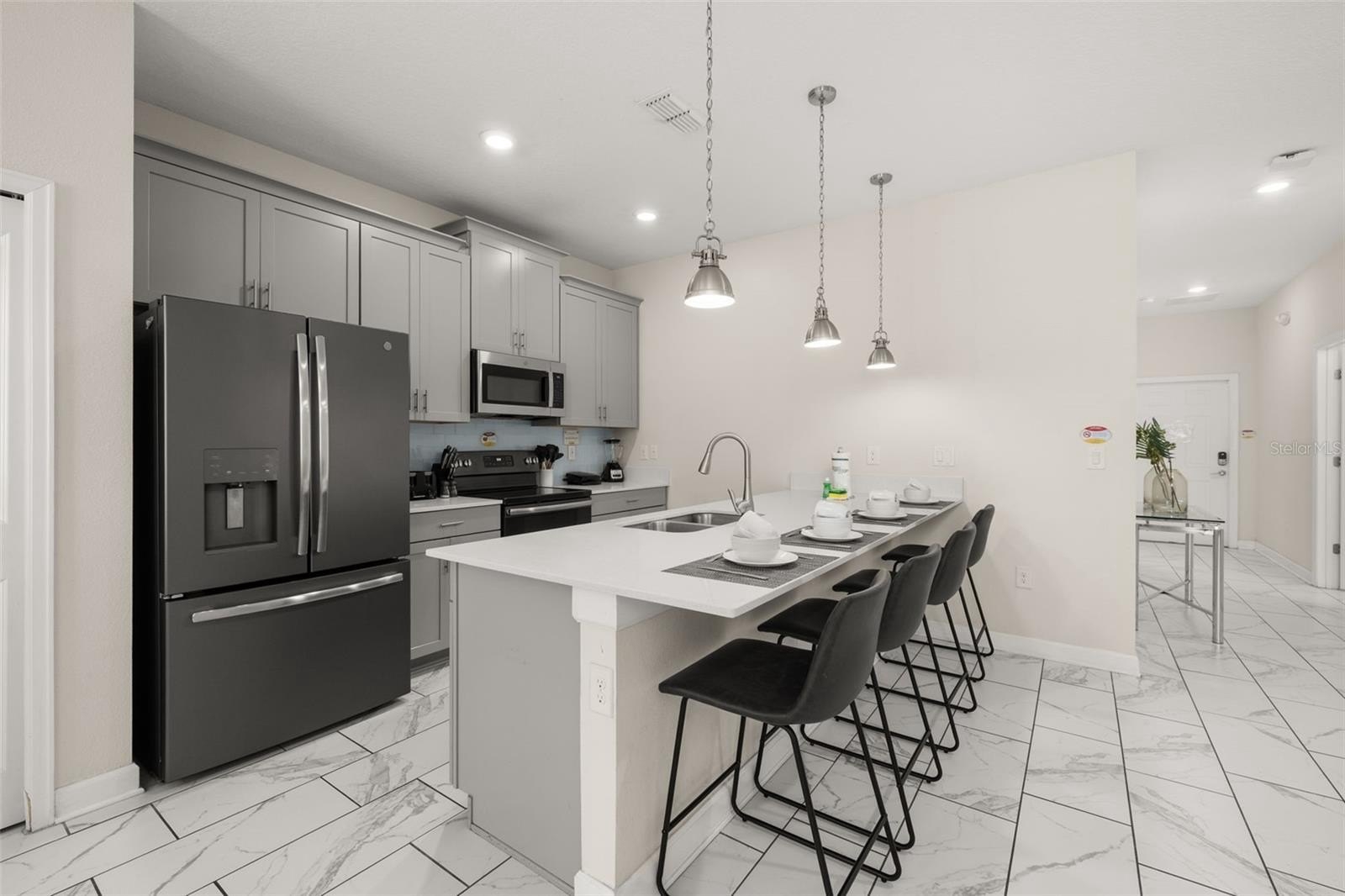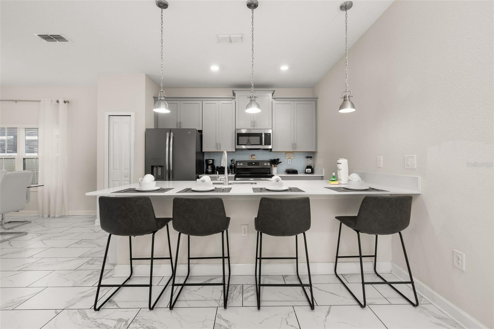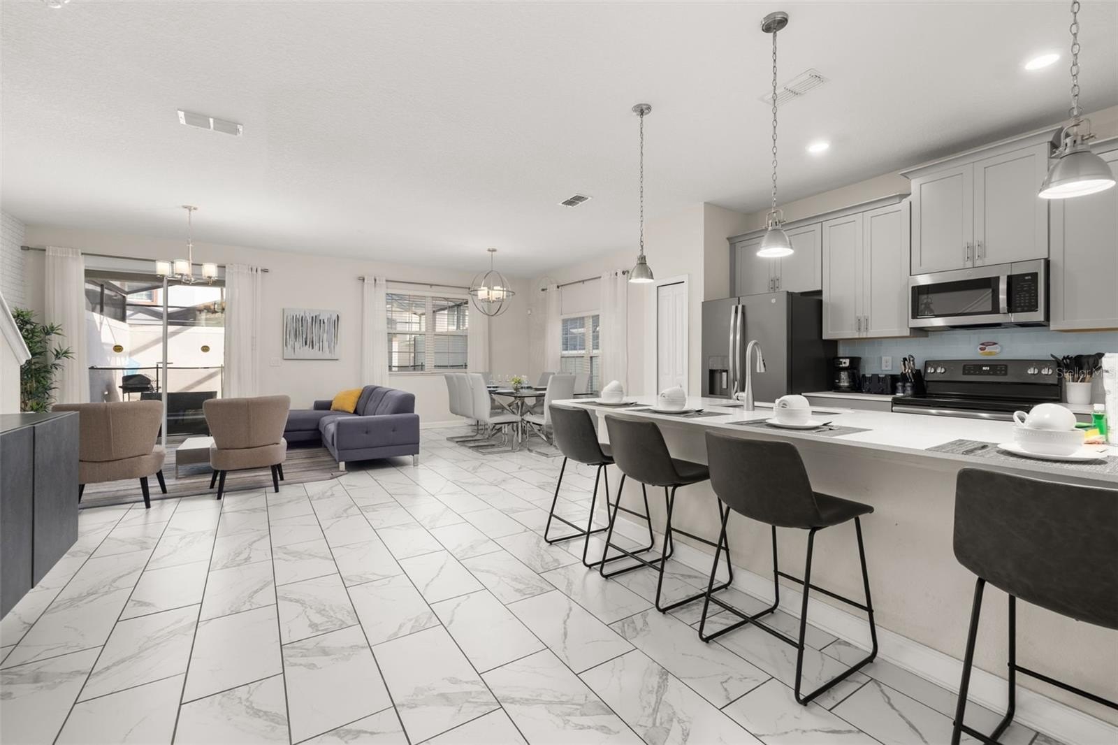 Discover this spacious, FULLY FURNISHED, EQUIPPED AND DECORATED 5-bedroom, 4-bath townhouse located in the highly desirable gated community of STOREY LAKE RESORT, just minutes from Orlando’s world-famous attractions. Thoughtfully designed with a modern, open-concept layout, the home features a bright kitchen with a LARGE WHITE QUARTZ ISLAND offering extra seating, STAINLESS STEEL APPLIANCES, and a FRENCH DOOR REFRIGERATOR. The elegant dining area and comfortable living spaces are perfect for entertaining or relaxing after a day at the parks.