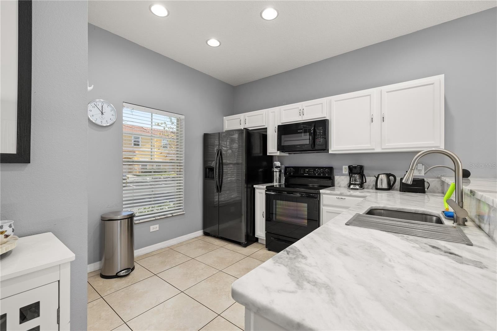 The main level offers a BRIGHT, OPEN-CONCEPT FLOOR PLAN designed for comfort and functionality. The kitchen features WHITE GRANITE COUNTERTOPS, wood cabinetry, and a complete appliance package, with a breakfast bar overlooking the dining and living areas. Sliding glass doors lead to a SCREENED PRIVATE PATIO with a hot tub, outdoor seating, and space to enjoy the Florida lifestyle. The first floor is fully tiled for easy maintenance and includes a half bathroom and a convenient laundry closet.