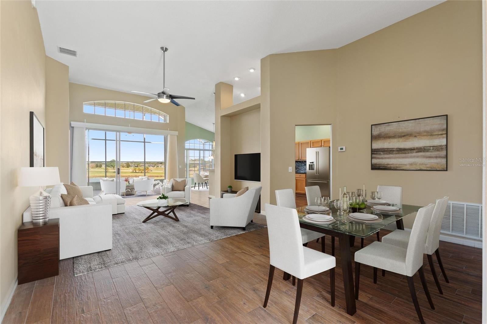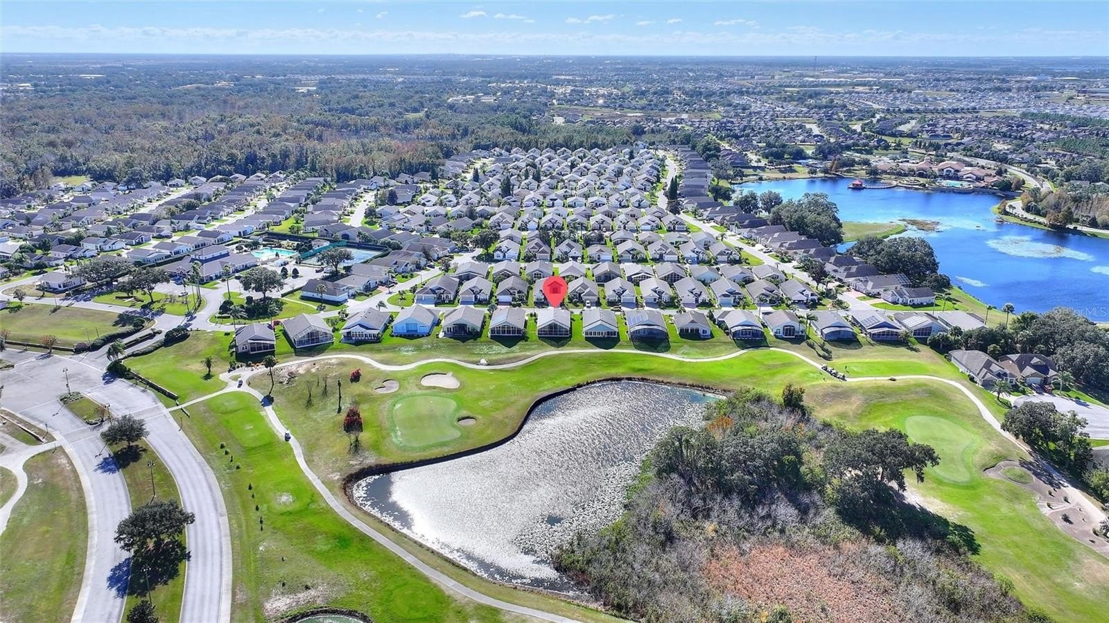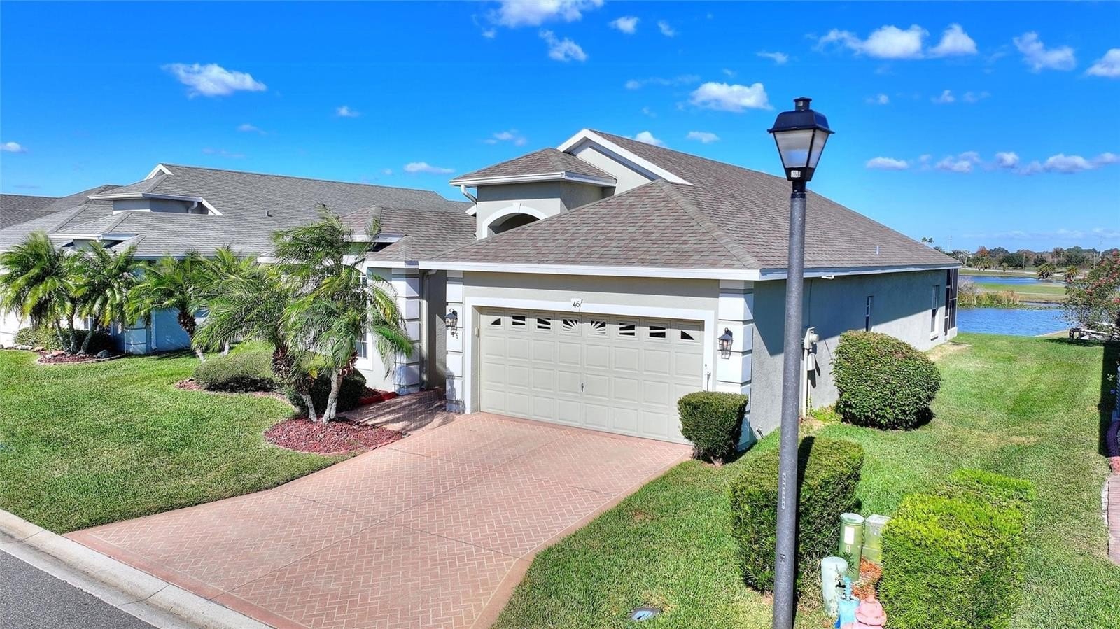 One or more photo(s) has been virtually staged. GOLF COURSE and WATER VIEWS from the Ever-Popular RidgeDale 3/2 model with a 494 SF North-Facing Covered & Screened Lanai overlooking White Heron Golf Club Fairway #14 and located just 0.1 miles from the High Vista 55+ private clubhouse and amenity center. 12 FT ceiling in central Great Room with a wall of patio doors to screened lanai with decorative concrete floor. Eat-in kitchen has granite countertops, built-in desk and breakfast bar with pendant lighting, vaulted ceiling, closet pantry and broom closet. Cathedral ceiling in primary en suite bedroom with walk-in & linen closets and level-entry shower. Split bedroom design offers semi-private guest area with two bedrooms and full bathroom with a linen closet between them. Corridor laundry room to garage has utility sink and closet. Primary bathroom remodeled and water heater replaced in 2025; HVAC replaced 2020; Roof replaced 2015. Full-view leaded-glass front door with matching sidelight. Garage has electric screen, installed off-ceiling storage and pull-down ladder access to attic. Ridgewood Lakes is a golf cart friendly community. $230 monthly High Vista HOA fee includes Spectrum internet and basic cable TV with 2 cable boxes, lawn mowing and exclusive access to resident-owned 12,000 SF private High Vista clubhouse and amenities. $425 semi-annual Ridgewood Lakes HOA fee provides 24x7 staffed security gate and master association-owned private road maintenance. Adjacent to 18-hole White Heron Golf Club with The Nest restaurant, privately owned and open to the public. High Vista is a 55+ community with outdoor heated pool and spa, fitness center, library, pub & many organized activities. Pickle ball, tennis, bocce and shuffleboard courts. Miles of biking and walking trails within Ridgewood Lakes gated community. Shopping, Disney, Universal, Orlando & Central FL entertainment nearby, easy access to I-4, medical facilities, airports & Sunrail Station. Advent Health hospital is 3 miles away.