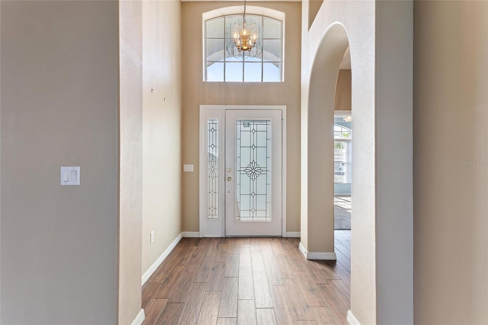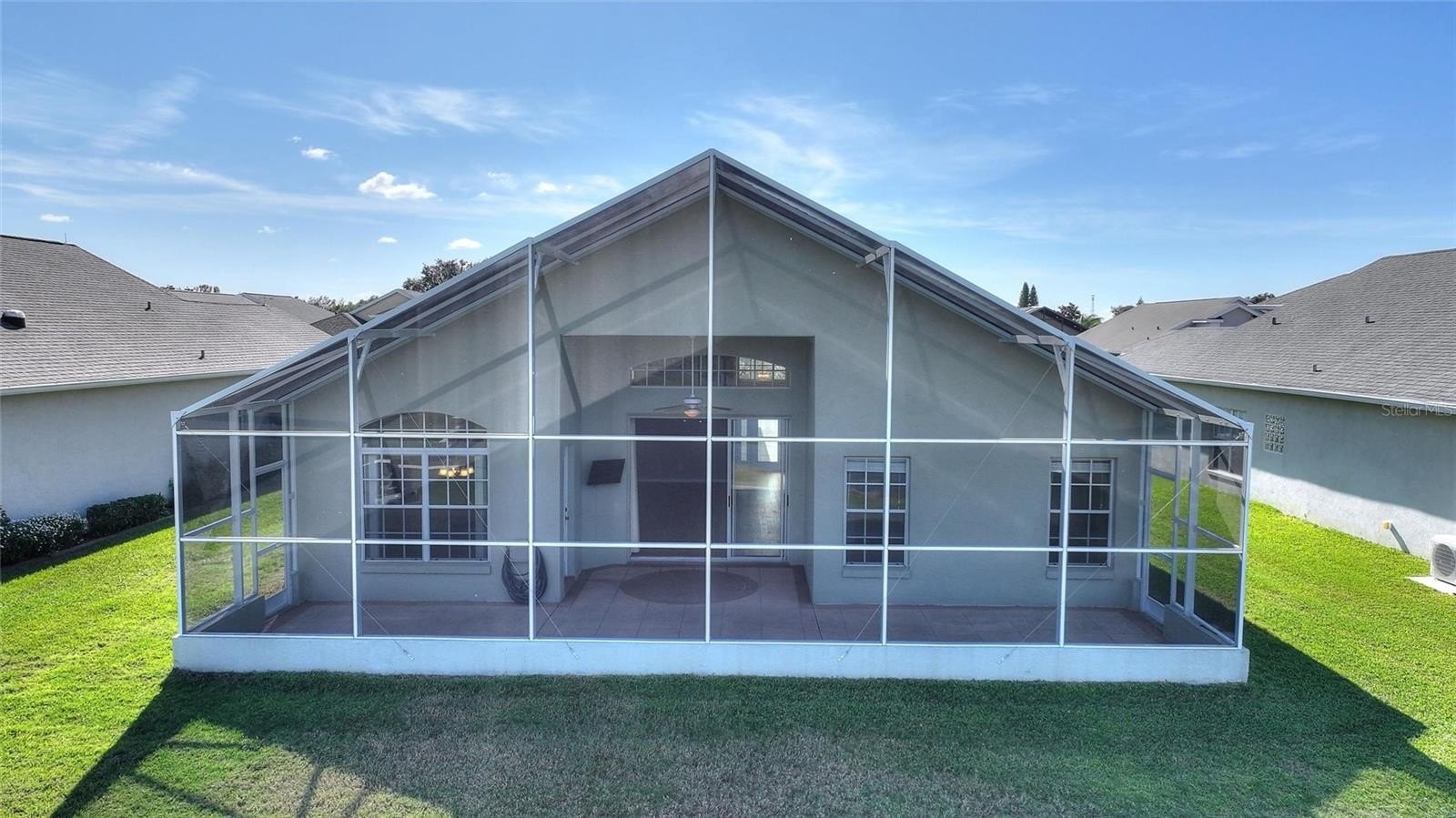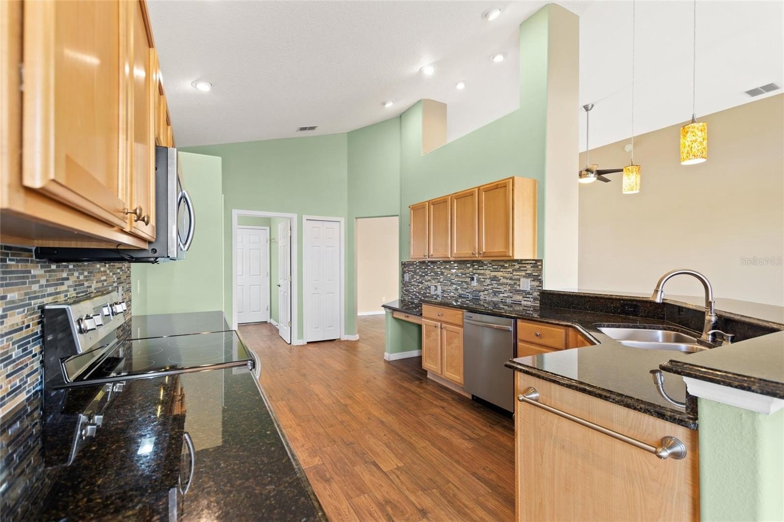 One or more photo(s) has been virtually staged. GOLF COURSE and WATER VIEWS from the Ever-Popular RidgeDale 3/2 model with a 494 SF North-Facing Covered & Screened Lanai overlooking White Heron Golf Club Fairway #14 and located just 0.1 miles from the High Vista 55+ private clubhouse and amenity center. 12 FT ceiling in central Great Room with a wall of patio doors to screened lanai with decorative concrete floor. Eat-in kitchen has granite countertops, built-in desk and breakfast bar with pendant lighting, vaulted ceiling, closet pantry and broom closet. Cathedral ceiling in primary en suite bedroom with walk-in & linen closets and level-entry shower. Split bedroom design offers semi-private guest area with two bedrooms and full bathroom with a linen closet between them. Corridor laundry room to garage has utility sink and closet. Primary bathroom remodeled and water heater replaced in 2025; HVAC replaced 2020; Roof replaced 2015. Full-view leaded-glass front door with matching sidelight. Garage has electric screen, installed off-ceiling storage and pull-down ladder access to attic. Ridgewood Lakes is a golf cart friendly community. $230 monthly High Vista HOA fee includes Spectrum internet and basic cable TV with 2 cable boxes, lawn mowing and exclusive access to resident-owned 12,000 SF private High Vista clubhouse and amenities. $425 semi-annual Ridgewood Lakes HOA fee provides 24x7 staffed security gate and master association-owned private road maintenance. Adjacent to 18-hole White Heron Golf Club with The Nest restaurant, privately owned and open to the public. High Vista is a 55+ community with outdoor heated pool and spa, fitness center, library, pub & many organized activities. Pickle ball, tennis, bocce and shuffleboard courts. Miles of biking and walking trails within Ridgewood Lakes gated community. Shopping, Disney, Universal, Orlando & Central FL entertainment nearby, easy access to I-4, medical facilities, airports & Sunrail Station. Advent Health hospital is 3 miles away.