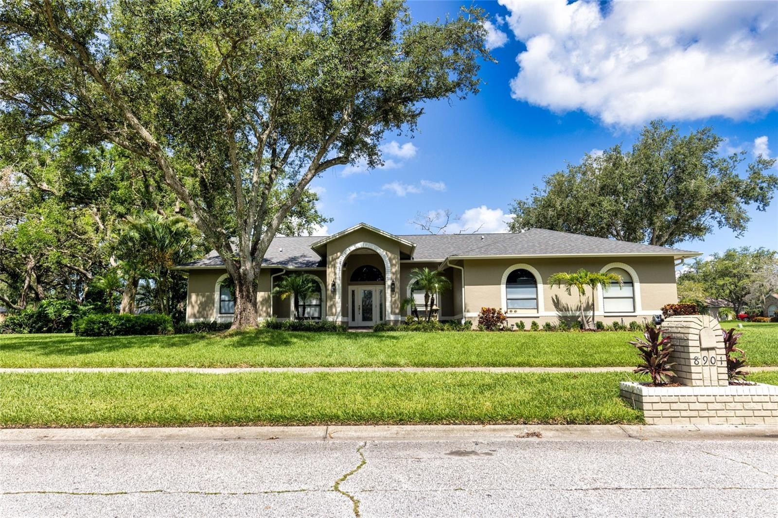 Originally built as a custom home and updated in 2017, this well-maintained property has a new roof from March of 2024 with a manufacturers transferrable warranty, a new central ac/heat pump installed in March of 2023 and fresh exterior paint. The home sits on a half-acre corner lot in a boating community. The welcoming grand entrance opens to the foyer, formal living room and dining room with cathedral ceilings. An office to your left can also be used as a 4th bedroom or a den. The open floor plan features high ceilings and crown molding throughout. The foyer continues into the kitchen with an island that can seat 8 people and a breakfast nook to the left. The home has oversized windows and 8-foot-tall sliding glass doors that let in plenty of light. The kitchen features a solar tube over the sink for additional natural light. The kitchen flows seamlessly into the Florida room which features a propane burning fireplace. Looking out from the main living space is a covered, screened lanai and views of the yard with lush landscaping and mature Oaks. The First Floor Master Suite features a large closet and a second wall to wall closet. Sliding glass doors lead to the lanai. The large master bath features marbled floors & walls, double sink vanity, a freestanding tub, and an open shower. This split floor plan provides privacy with the main bedroom to the south and two guest rooms and bath off of the Florida room to the North. The large 3 car garage has an added 7' deep x 20' wide work space, a utility sink and a ladder to access a storage area in the attic above. In addition to the 3-car driveway at the garage, a second driveway leads to the backyard. The back yard has a large shed for additional storage. The Eagle Watch Community borders the Alafia river with a community clubhouse, community swimming pool, tennis courts, boat ramp and boat slips. Boat slips are deeded to some properties and are occasionally available for rent by community residents. All of the homes in this community are unique and were custom built on half acre lots and larger.
