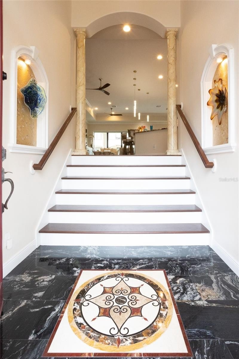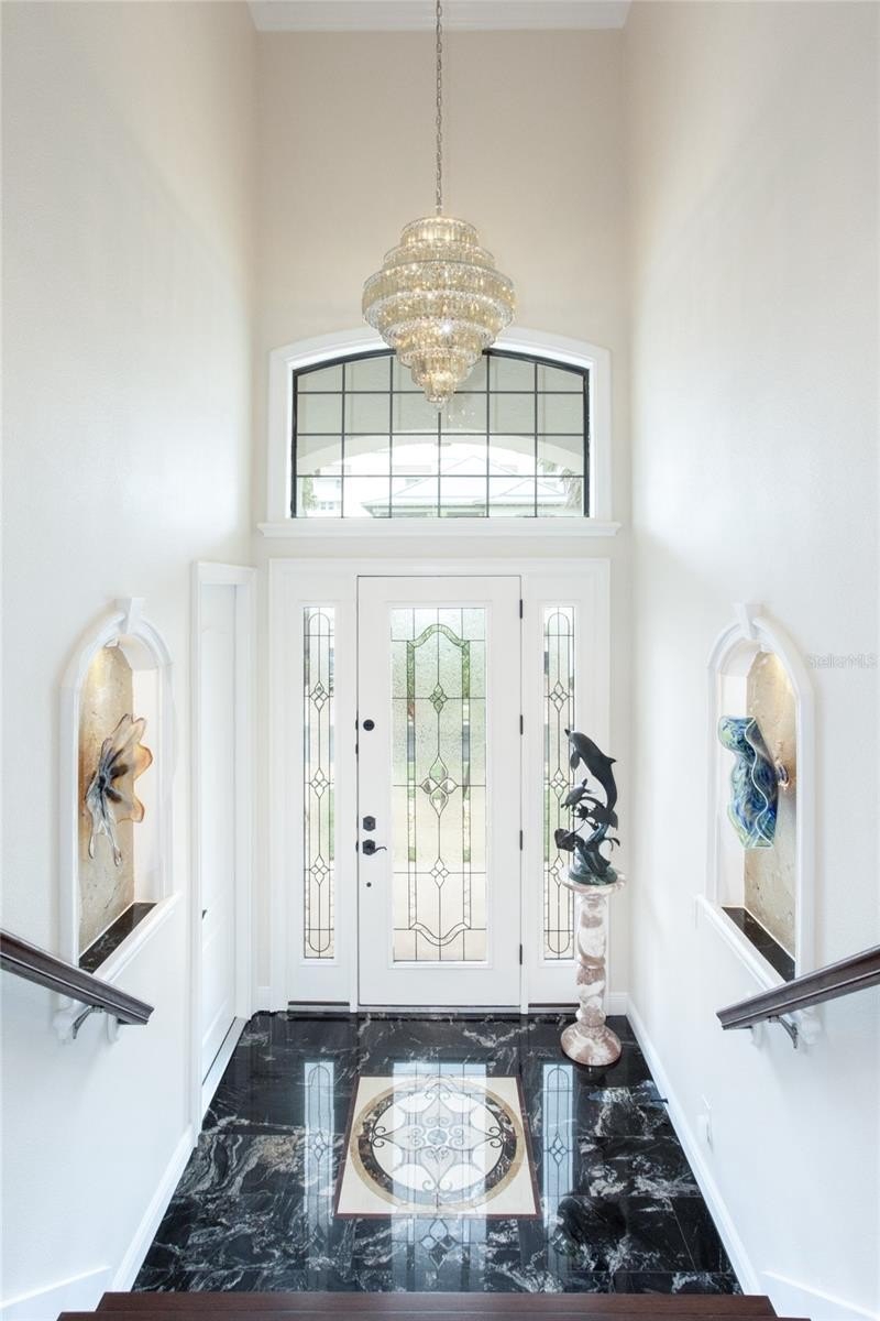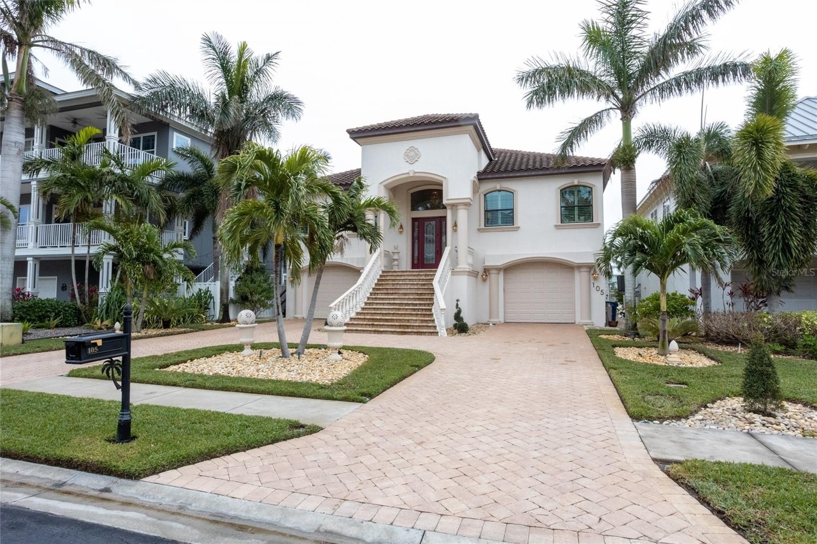 Coastal living at its best! Welcome to an extraordinary move in ready coastal residence, a true masterpiece of design and luxury, located in a prestigious gated community just steps from the pristine sands of the Gulf. This solidly built concrete home offers three bedrooms, three bathrooms, an elevator, and countless custom touches that set it apart. The grand entrance features a black marble foyer illuminated by lighted custom niches and a sparkling amber crystal chandelier. Inside, the 12-foot ceilings create an expansive and inviting atmosphere, enhanced by automated power shades, etched glass accents, and elegant finishes throughout. The home includes a dedicated study, perfect for work or quiet reflection, adding a layer of versatility to the layout. The gourmet kitchen is a chef’s dream with a gas cooktop and high-end appliances, perfectly complementing the home’s sophisticated style. The primary suite is a retreat of unparalleled luxury, boasting a grand entrance, a dazzling chandelier, and a spa-inspired en-suite bathroom. This home is designed for entertaining, with a concrete balcony covered in travertine tiles and an expansive ground level offering generous indoor and outdoor living spaces. A heated saltwater pool and spa are nestled within the professionally landscaped and lighted yard, creating a private oasis. The paver driveway and pool deck add to the home’s exceptional curb appeal. For added convenience and accessibility, the home is equipped with an elevator, ensuring effortless movement between levels. In addition to the exquisite interior and outdoor features, the community offers residents access to a clubhouse with a state of art fitness center, full kitchen, entertainment space, tennis and pickleball courts, a newly added kayak launch, and boat slip opportunities. This home, with its amber crystal light fixtures, custom mosaic flooring featuring onyx, agate, and amber, and countless other bespoke details, provides a rare opportunity to experience the ultimate in luxury coastal living. Don’t miss your chance to own this stunning property surrounded by multi million dollar homes! Seller is ready to make a deal.