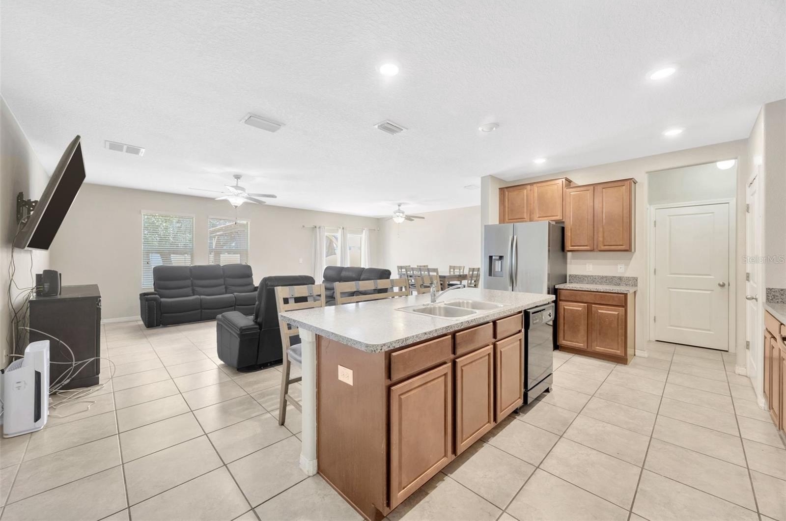 Welcome to 12605 Flatwood Creek Drive, a beautifully maintained and spacious two-story home located in the desirable GATED community of The Preserve at Bullfrog Creek in Gibsonton, FL. Built in 2018, this expansive “Trenton” floor plan offers over 3,300 square feet of living space with six bedrooms and three full bathrooms, providing flexibility and comfort for growing families or multi-generational living. The first floor features a bright, open layout with tile flooring throughout the main areas, a large living and dining space, and a modern kitchen equipped with a brand-new stainless steel refrigerator (2024), 36" raised-panel cabinets, and a full washer and dryer package in a convenient first-floor laundry room.