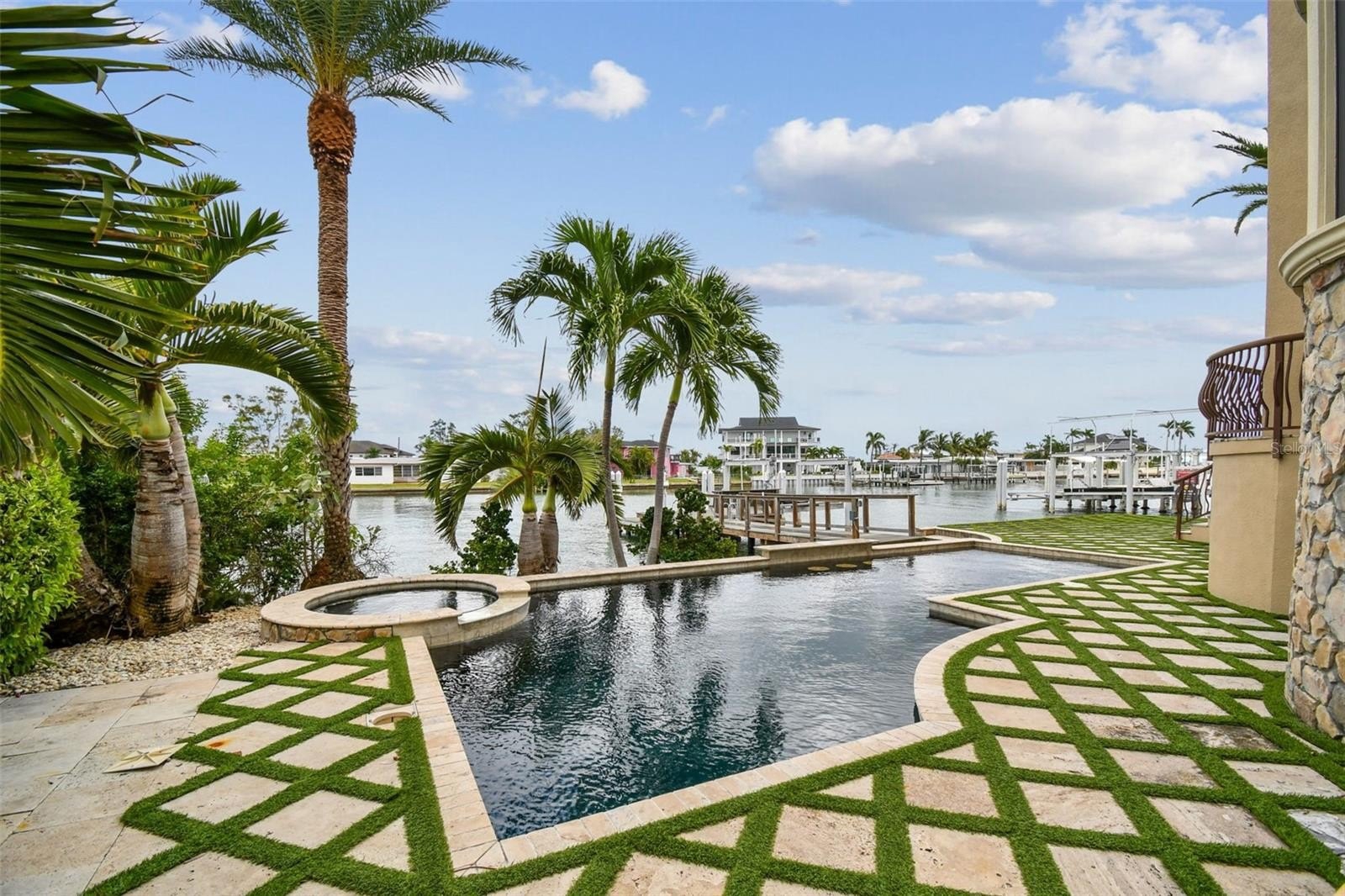 UNIQUE ST. PETE BEACH ELEGANT CUSTOM QUALITY FRENCH STYLE ESTATE, RARE FOR SPB. offering 5 bedrooms, 5.5 baths, and unparalleled craftsmanship throughout. HIGH AND DRY !! Built by a premier custom builder, this residence showcases a dramatic stone facade, expansive open floor plan, and gated private entry creating an estate of distinction. 2025 NEWLY INSTALLED AC UNITS (5 YEAR WARRANTY ATTACHED), NEWLY INSTALLED PRIVATE GATE, NEWLY INSTALLED GARAGE DOOR LOGIC BOARDS. Step inside to SOARING CEILINGS, exposed hardwood beams, 12" crown molding, 8" baseboards, and finely crafted details that elevate every space. A dramatic entry opens into a BREATHTAKING FOYER with recessed hardwood ceiling and chandelier, leading to both a formal dining room, office space and casual expansive family living space. The GOURMET CHEF'S KITCHEN is a rare true show piece, featuring a LARGE GRANITE CENTER ISLAND with beveled trim, CUSTOME WOOD CABINETRY, soft -close drawers, viking and genAir appliances, culinary center island prep sink, and a LARGE WALK-IN PANTRY. Enjoy the adjacent intimate dining nook with absolutely gorgeous water views. If a formal dining experience is required, retreat to the castle-like formal dining room which will accommodate a large 8-10 comfortable seating arrangement. This Dining room is adjacent to the gourmet kitchen and provides for easy serving but adequate distance. Central living area boasts a double facing indoor-out gas fireplace, dramatic 8' plantation shutters adorn the large hurricane windows that brightly light the living space. Notice the double hardwood french doors that provide access to the incredible balcony and exquisite water views. Our custom textured walls throughout, and arched passageways add architectural elegance throughout this house. Follow these to our double hardwood staircases with iron and wood railings to the second floor. This custom home comes with the space and preparation for the addition of an elevator. The first floor primary suite retreat is complete with dual walk-in closets, spa inspired bathroom, steam room, and a private covered balcony with hardwood ceiling and sweeping water views. Additional guest/maid/in-law quarters, offer private entry, kitchen, and separate controlled AC on its second floor residency. Outdoor living is equally extraordinary, with lush landscaping, a large saltwater pool and spa. Drive through your private controlled gate to your expansive motor court, additional side resident parking. Enjoy your vine covered stone facade and NEW LUSH LANDSCAPING unique to St. Pete beach. Your private gated back yard is accessed either through hurricane rated French doors or a side vinyl gate. You are immediately engulfed in luxurious new mature landscaping, travertine and grass paver deck surrounding your Pebletec heated saltwater pool and spa. Expansive Dock w/ 20K boat lift, deep water. TWO second floor balconies. . Easy access to Boca Ciega bay and the gulf of America. World class beaches are moments away, This estate offers easy access to many amenities from, yacht clubs, fine dining, shopping, minutes from Tampa International and Clearwater airports, downtown Saint Petersburg, St. Pete beach, museums, theaters, hotels, multiple hospitals, private airport, cigar bars, comedy clubs. The true elegance and custom workmanship of this highly maintained custom home has to be seen to be appreciated. THIS 5213 SQFT CUSTOM ESTATE REMAINED ABSOLUTELY HIGH & DRY, !!
