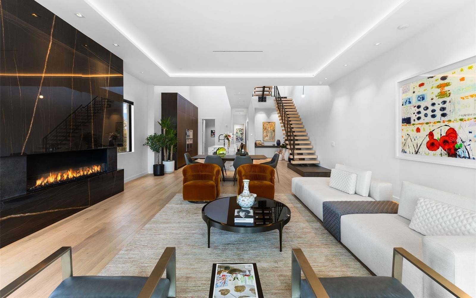 High-end finishes grace every corner, from Porcelanosa countertops to elegant bathrooms, all centered around a cozy fireplace that exudes modern charm. The gourmet kitchen features a Gaggenau appliance suite with a induction range with downdraft vent, double steam oven, speed oven, microwave/convection combo oven, dishwasher, and paneled fridge and freezer. Private 2nd floor balcony off the living room overlooks Central Avenues live oak trees, fabulous restaurants like Baba, Wildchild, Slim Charmer, and Bandit coffeeshop. The separate third-floor loft media room, complete with a wet bar, wine fridge, surround sound, and half bathroom, is perfect for entertaining and stunning views of downtown St Pete highrises and nearby Tropicana Feild. All 4 floors are accessible by a home elevator that takes you from the garage level up to the roof top.