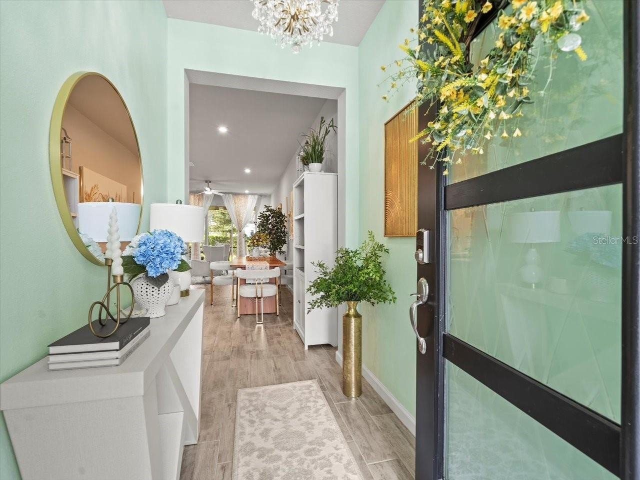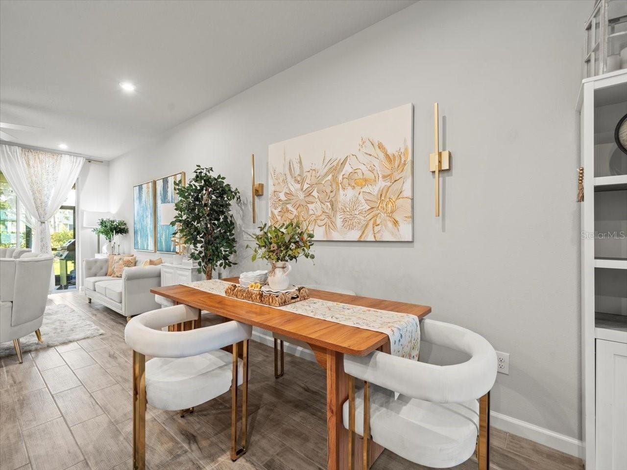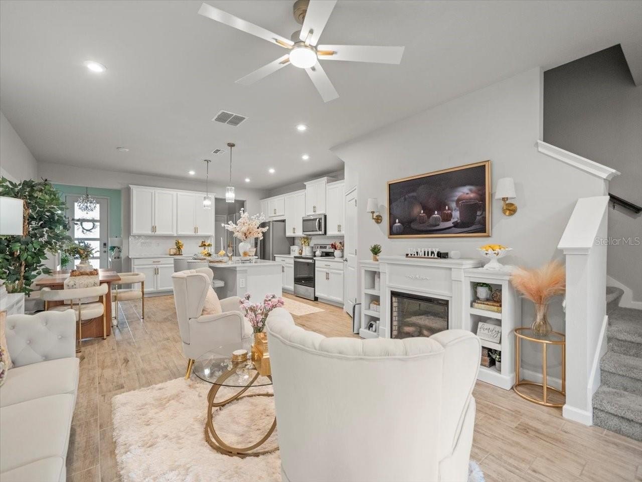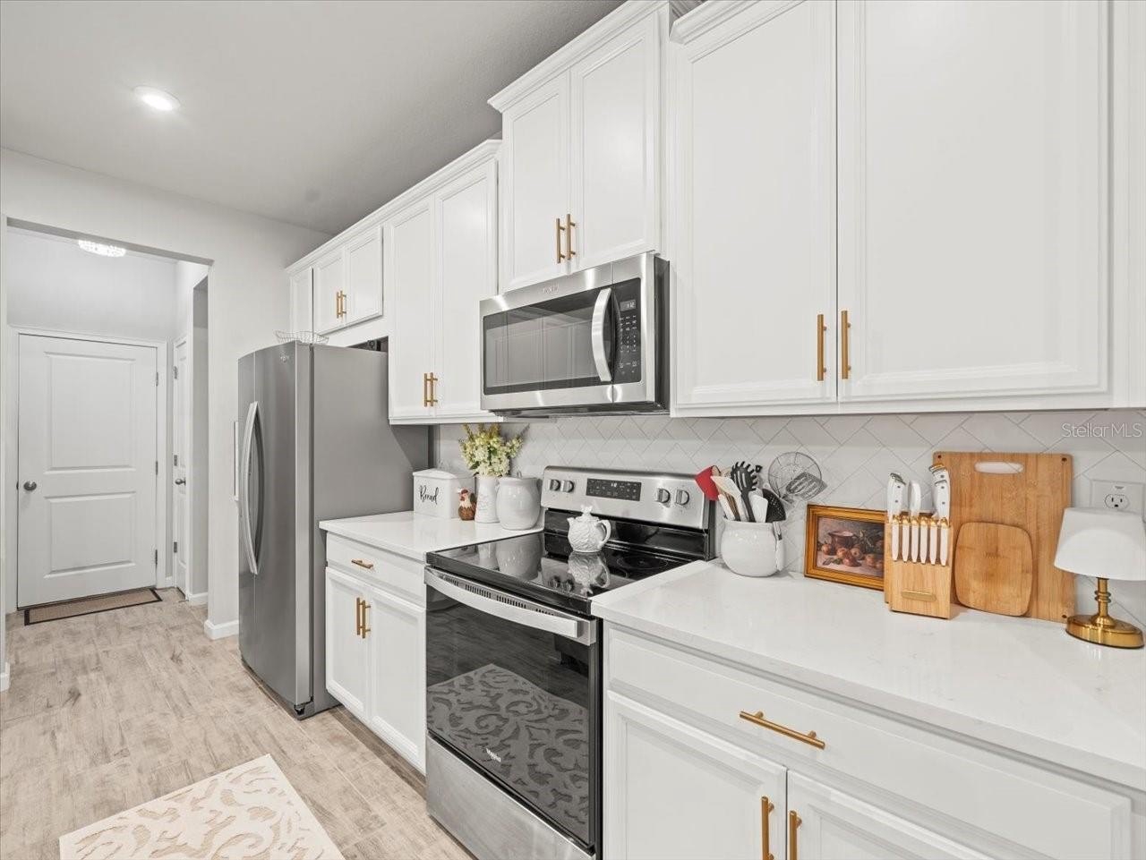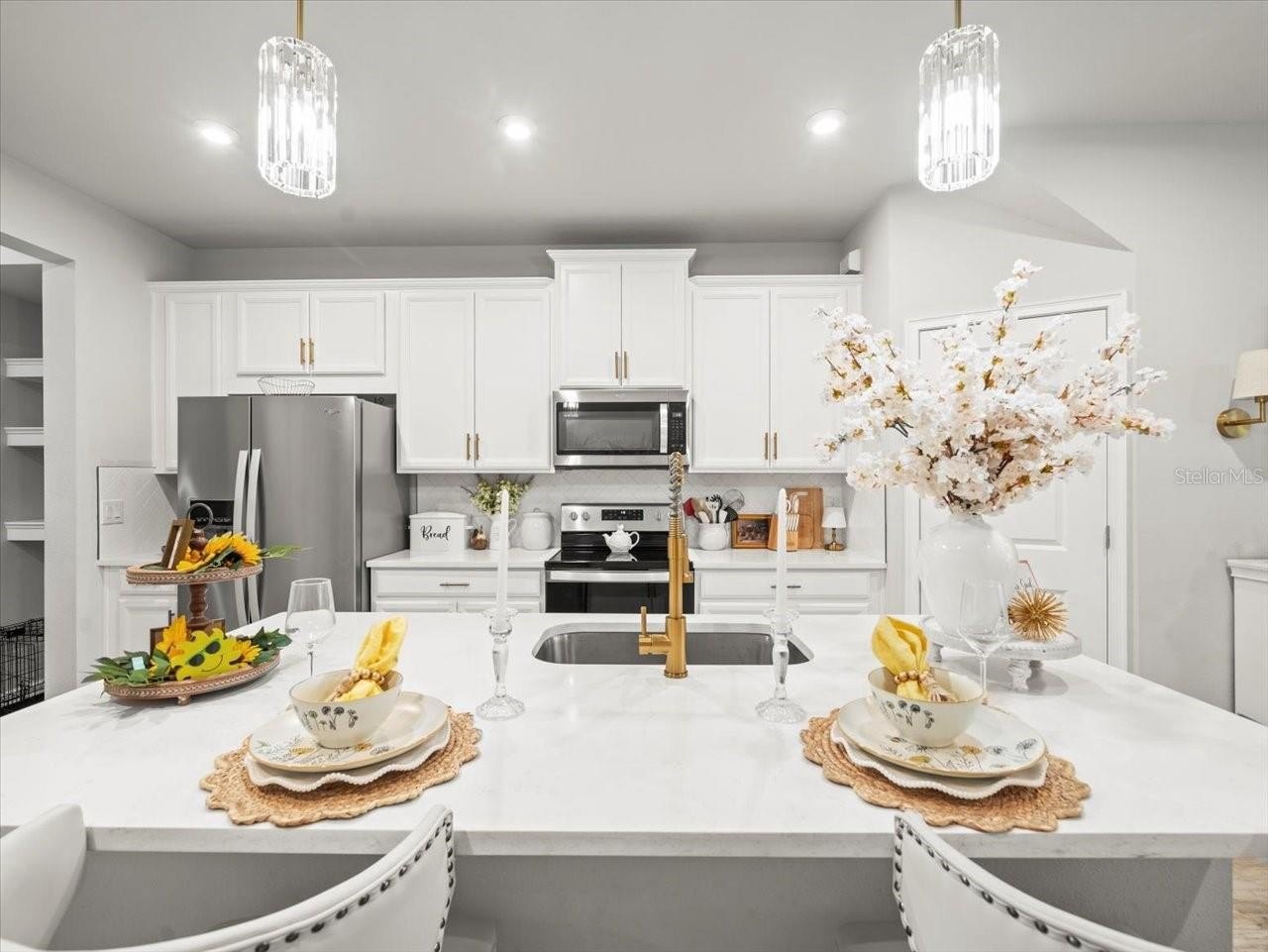 Unlike standard new builds, this home stands out with custom upgrades including chic gold hardware, upgraded fixtures, elegant pendant lighting, and statement chandeliers—adding a true designer touch throughout. The gourmet kitchen features quartz countertops, stainless steel appliances, and a striking herringbone backsplash, all opening to a bright, open-concept living and dining area finished with luxury vinyl plank flooring.