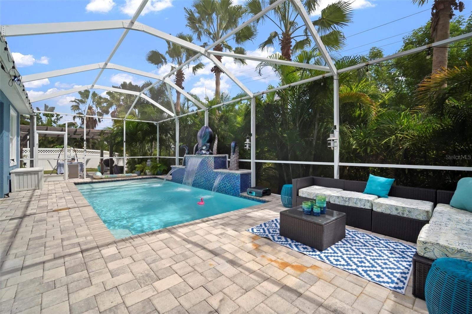 Step outside to your private paradise featuring a heated, inground pool with waterwall feature and with screened enclosure, a separate outdoor dining area under a pergola, and an outdoor kitchen space plumbed for gas and electric, ready for your custom design. Whether you’re hosting a barbecue, enjoying cocktails al fresco, or letting your fur baby play in the fenced backyard, this home is designed for fun and relaxation.