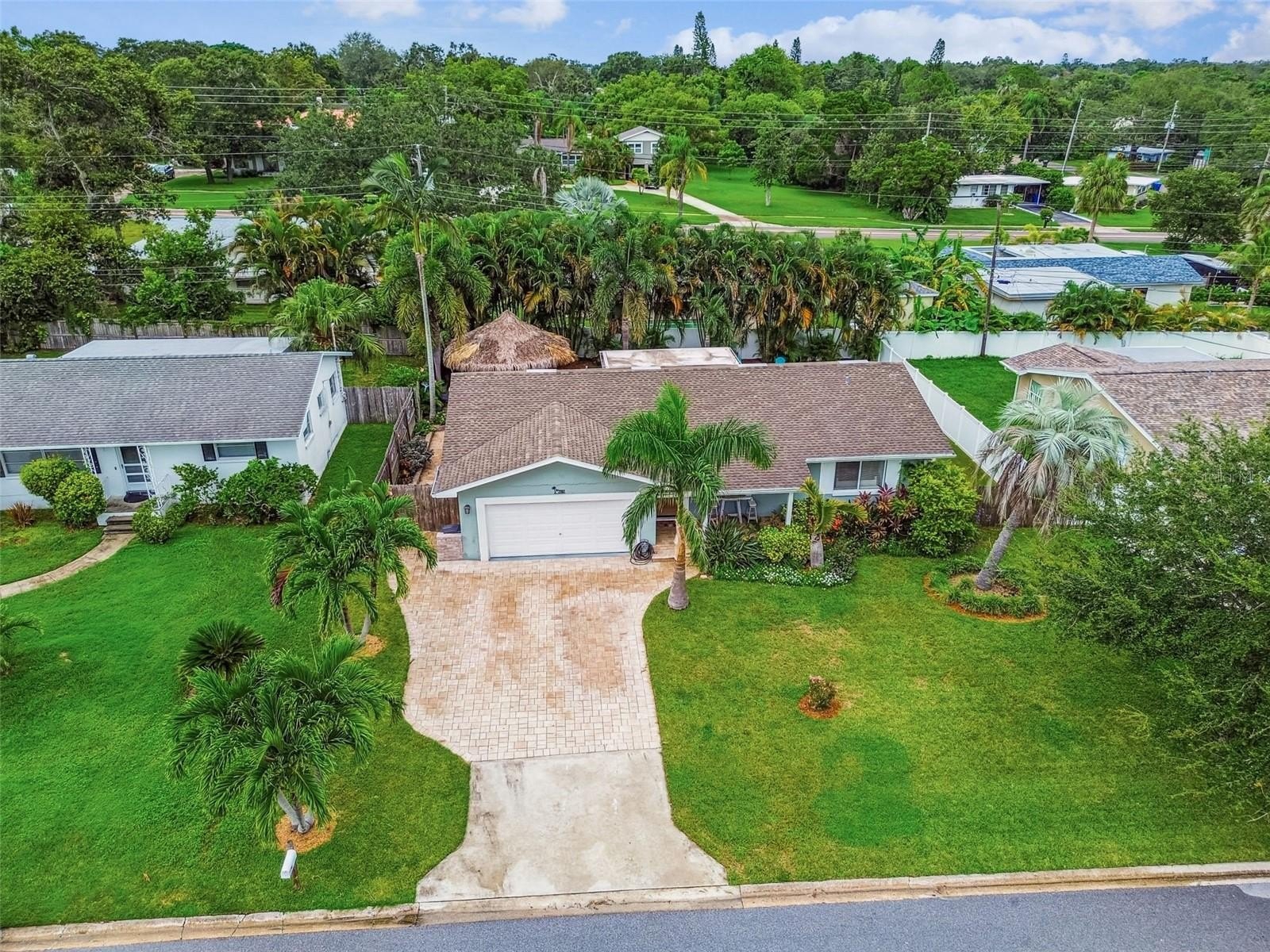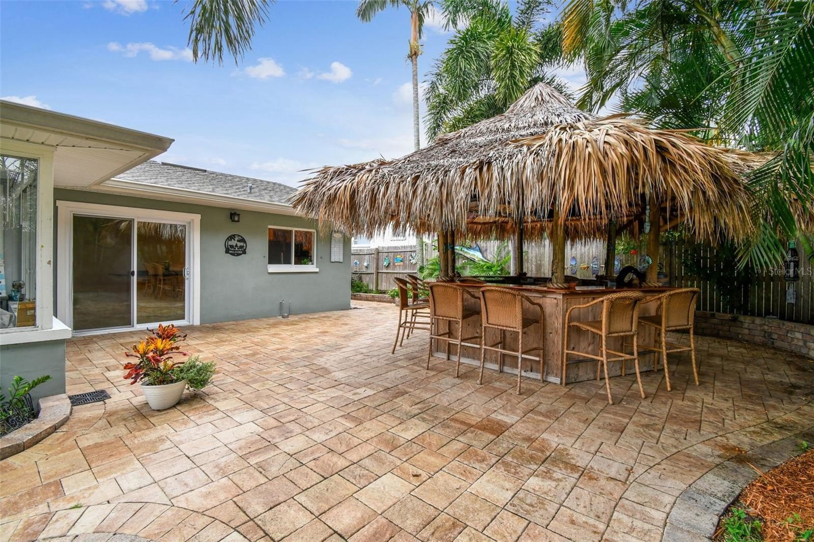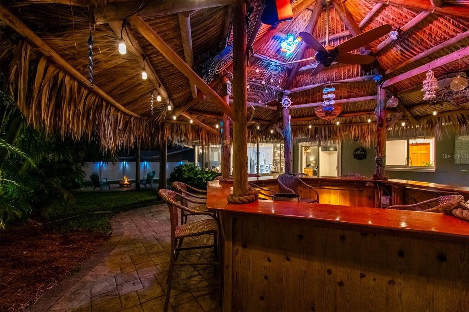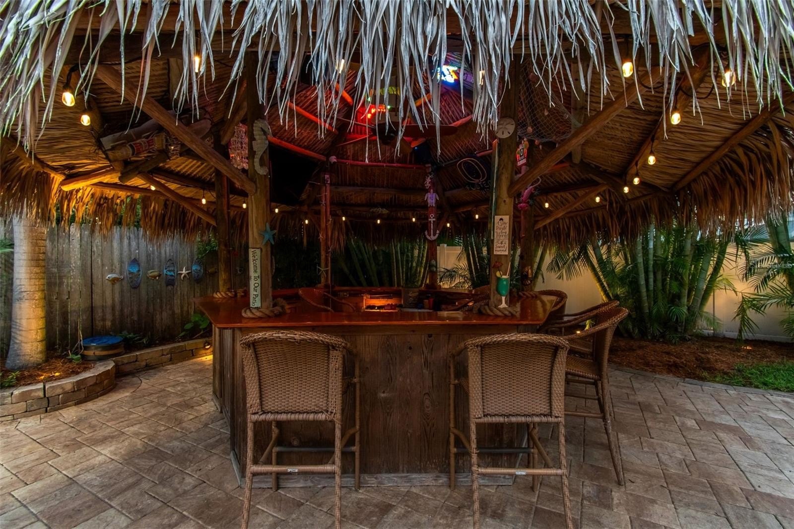 A paved walkway leads you to the ultimate backyard oasis—a tropical haven featuring one of the area’s most impressive island-style Tiki Huts. Spacious enough to seat at least 10 of your closest friends, this Tiki Hut is wired for electricity, complete with outlets, lighting, and even a couple of neon bar lights and a TV, all left by the sellers. It’s the perfect spot for evening cocktails, gatherings, and cookouts. Continue along the paver pathway to the fire pit, ideal for roasting marshmallows and enjoying cozy winter nights under the stars.