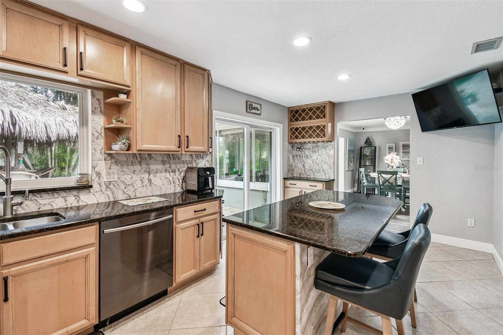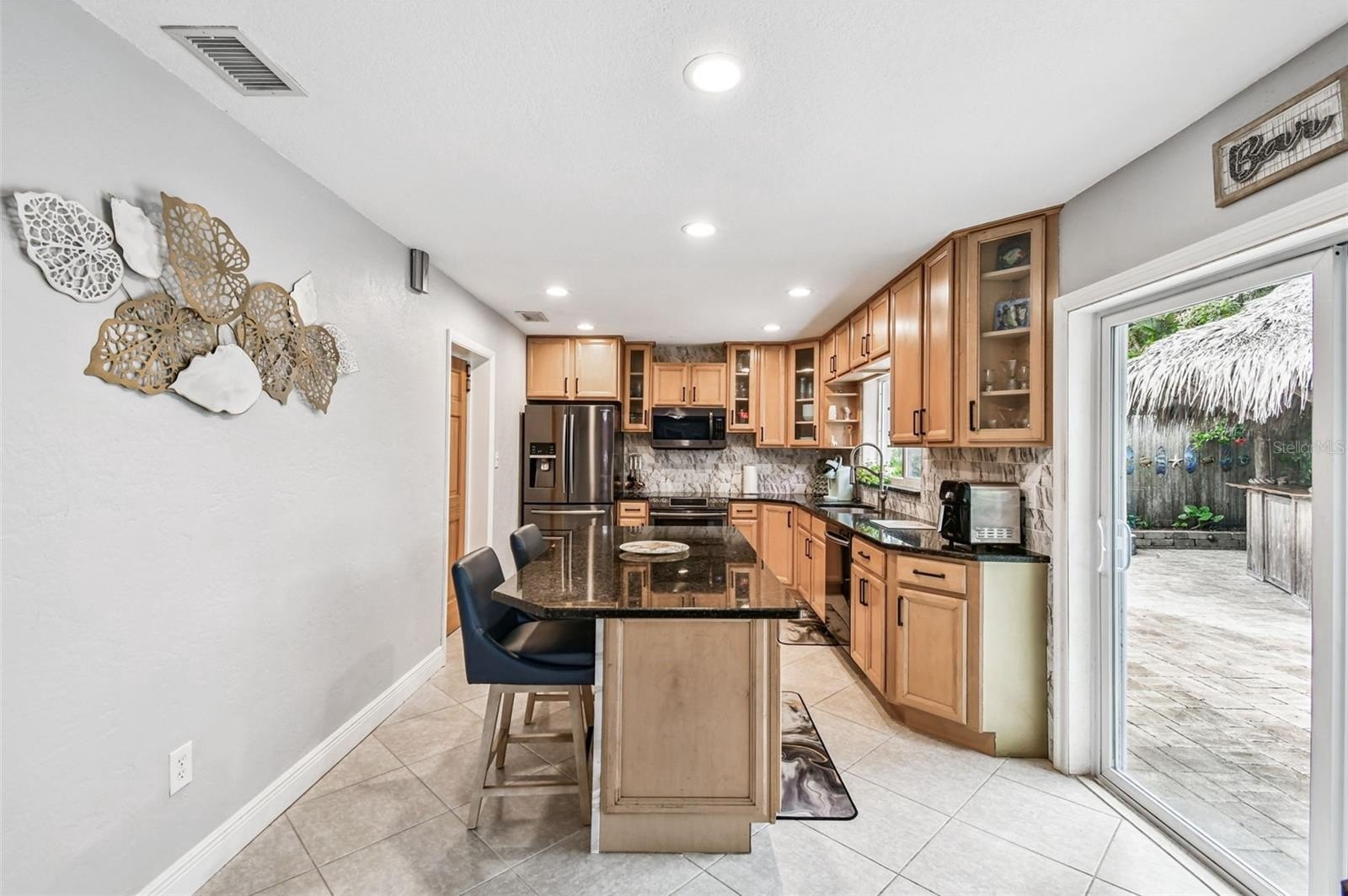 The updated kitchen boasts beautiful granite countertops, sleek high-end black stainless Samsung appliances, and a newly installed hurricane-rated sliding glass door that opens to your backyard paradise. Recent kitchen refreshes enhance its modern appeal, making it a true culinary delight.