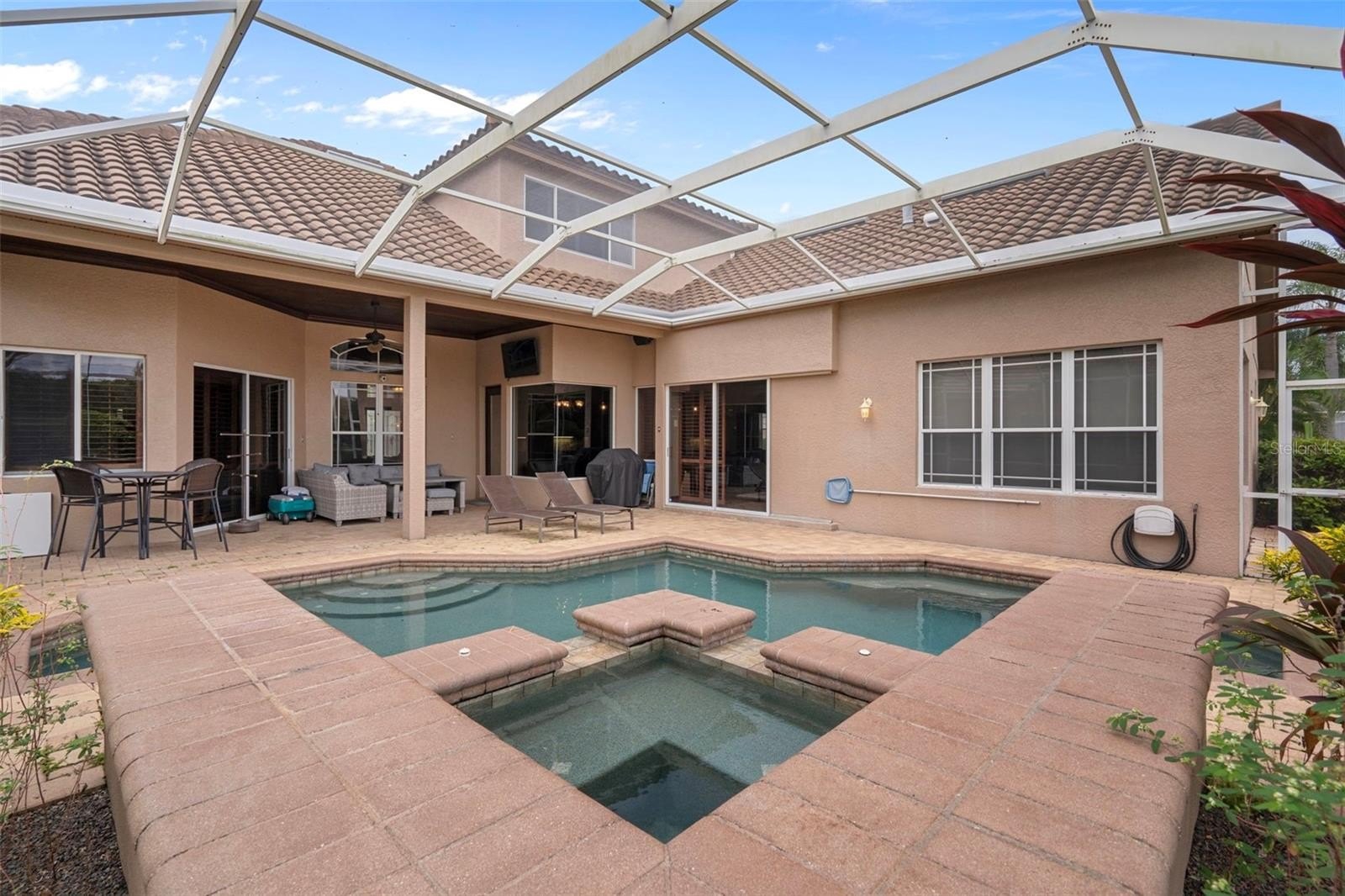 Step outside to your tropical oasis: brick paver deck, screened heated pool, spillover spa, updated jets, and a color-changing light display (2020). The fenced yard backs to a serene pond alive with wildlife, creating a truly tranquil setting.