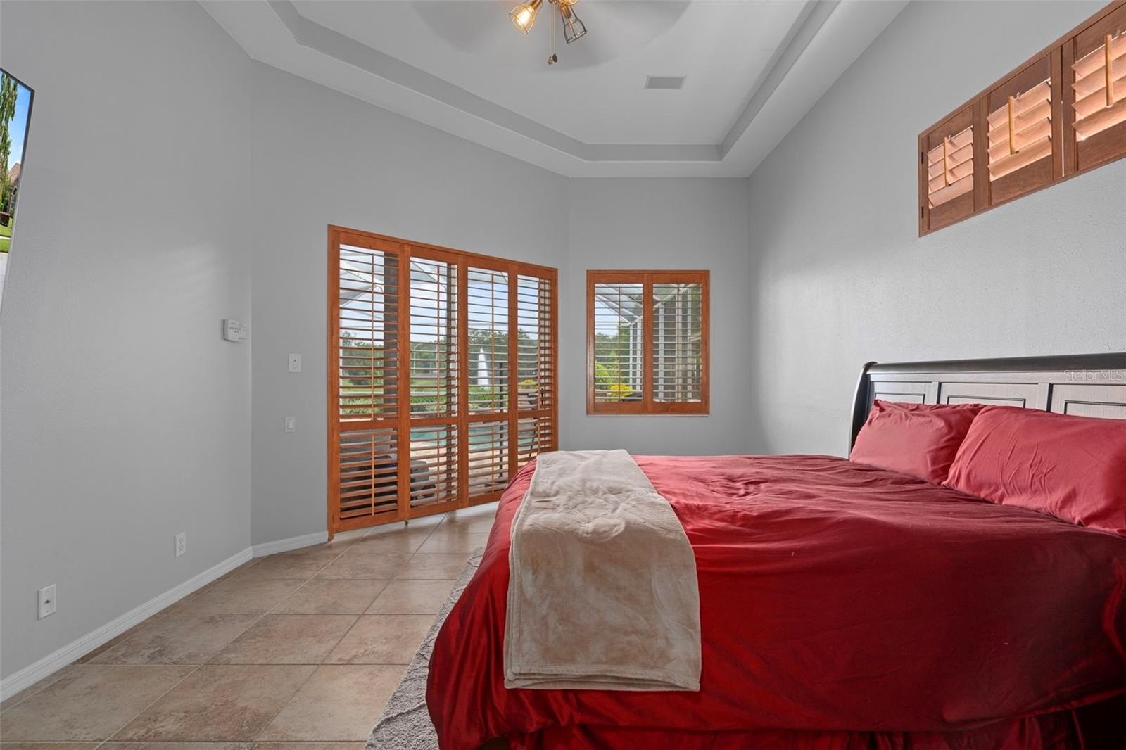 The oversized primary suite features plantation shutters, pool and pond views, and a beautifully updated bath with a walk-in shower, dual vanities, and an expansive custom closet.