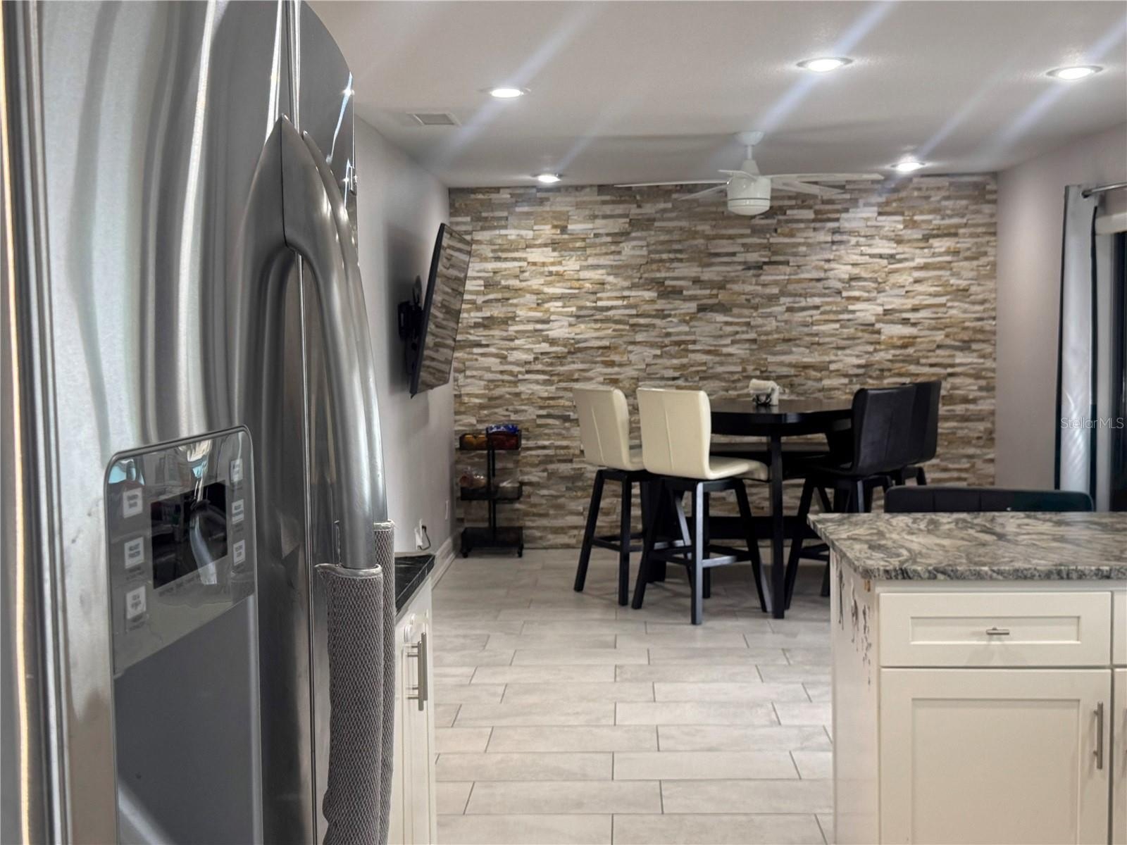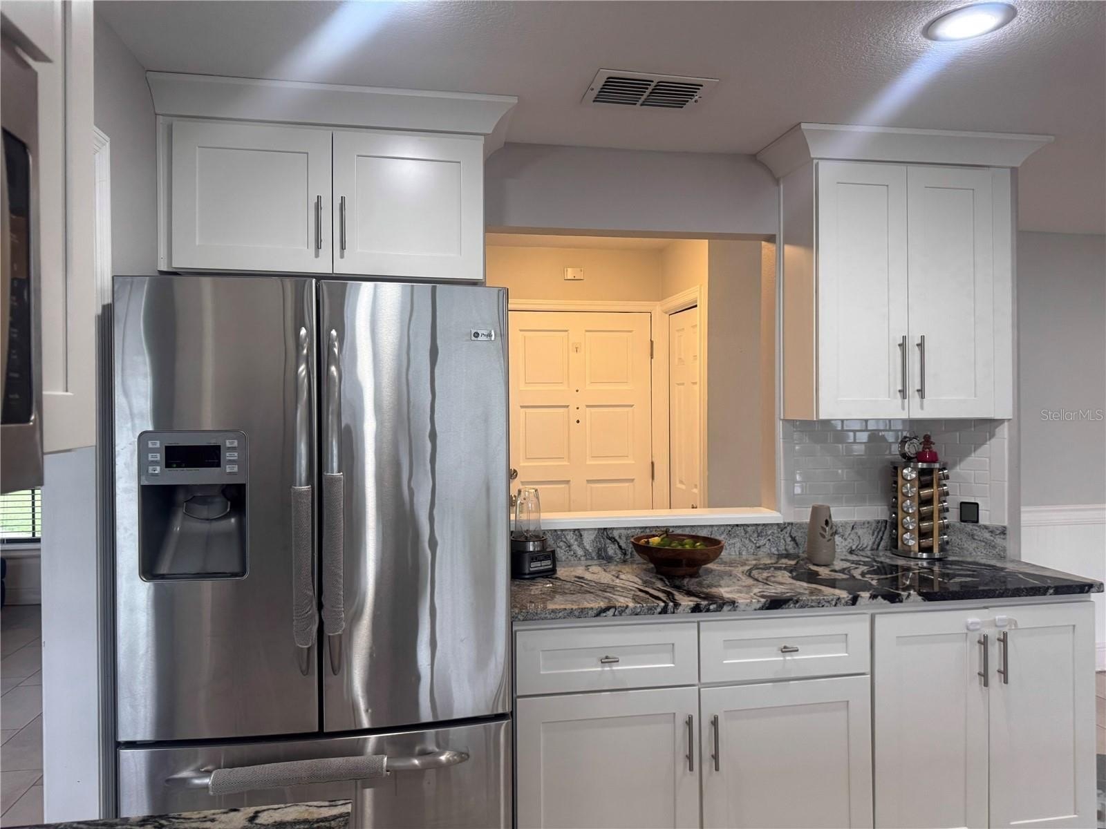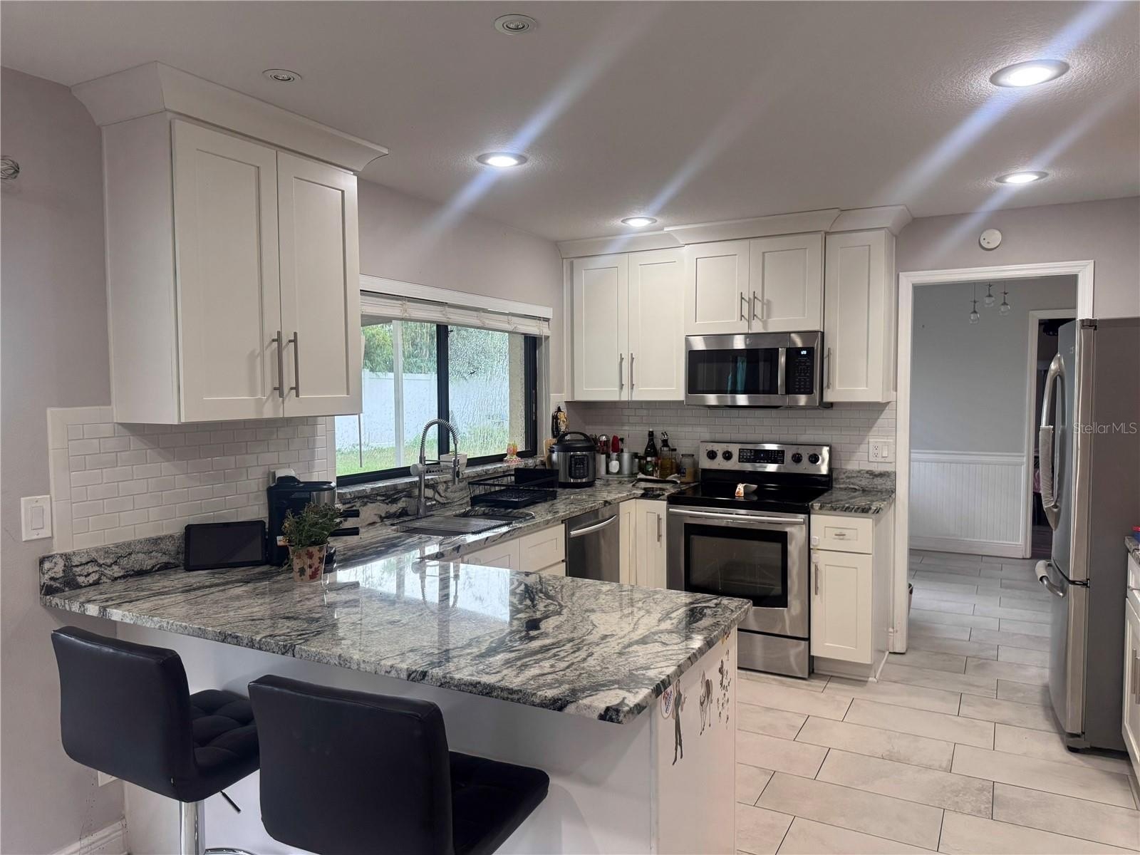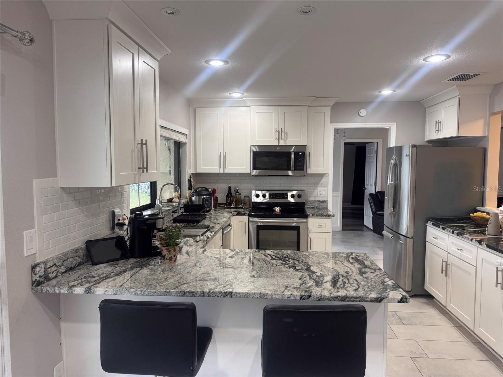 The kitchen is equipped with granite countertops, stainless steel appliances, and solid wood cabinetry. A large indoor laundry room and ample storage throughout add everyday convenience