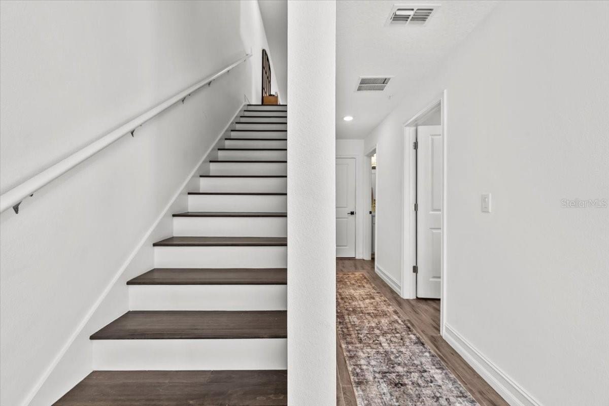 Step inside and you’ll notice the difference immediately. The main living area is anchored by a sleek electric fireplace with a Frame TV above, blending art, technology, and comfort. Designer wallpaper, bold light fixtures, and custom details create a home that feels elevated beyond builder-standard finishes.