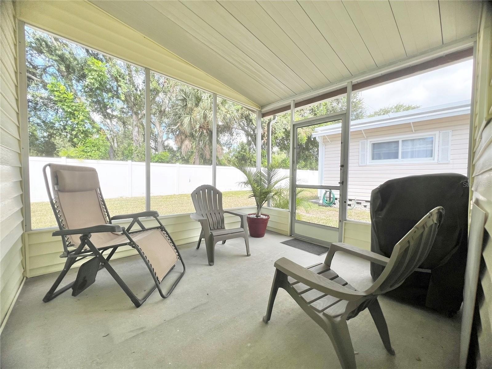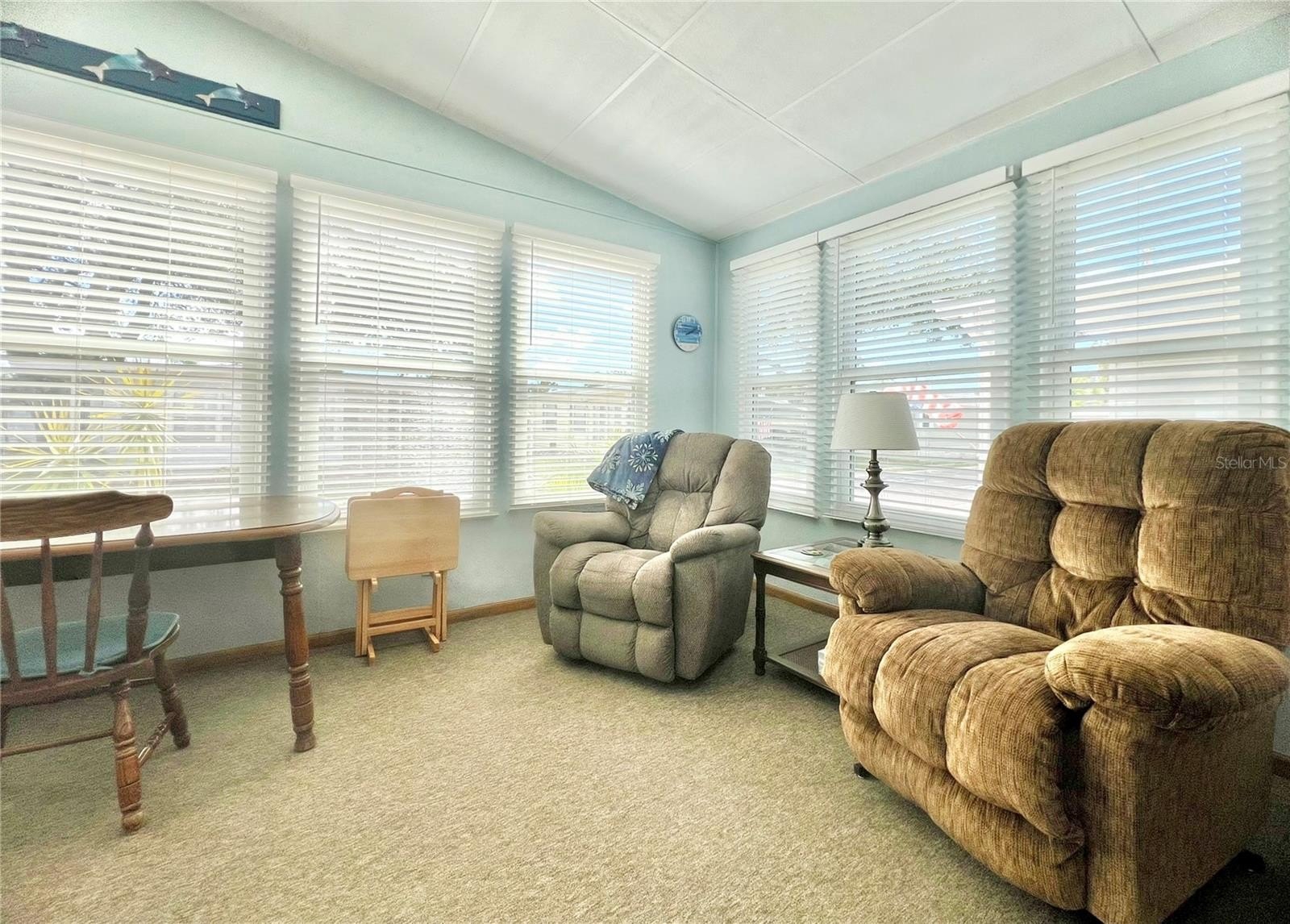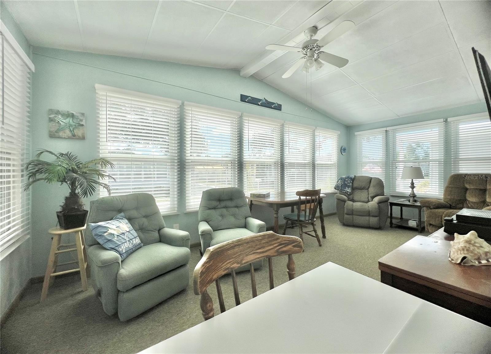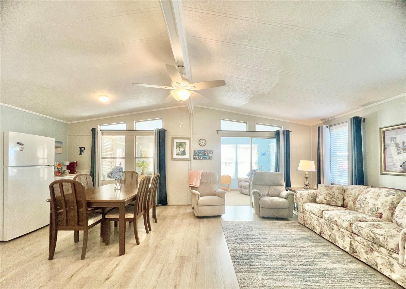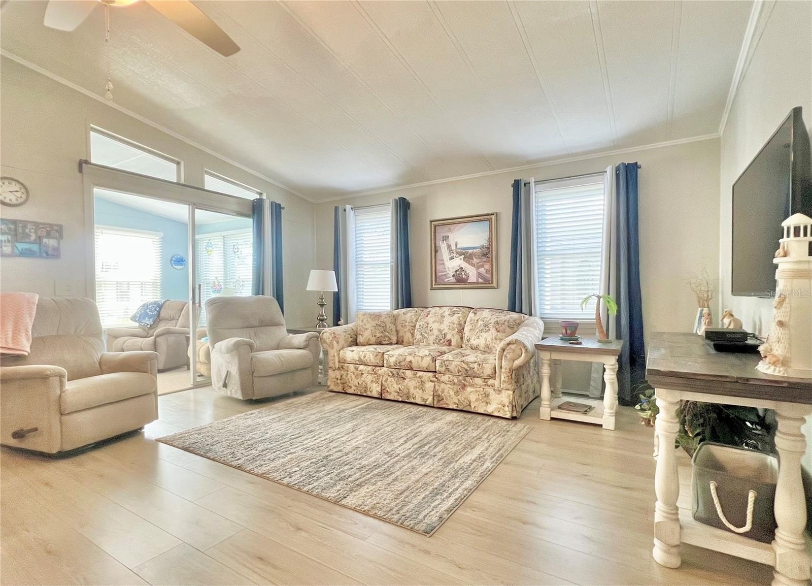 This stunning, partically furnished residence offers an inviting open layout connecting the living room, dining area, and kitchen under soaring cathedral ceilings. Freshly painted throughout, the home is bright, cheerful, and move-in ready. Newer luxury vinyl plank flooring adds a touch of modern elegance in every room except the bathrooms and the light-filled Florida Room, which features its own cathedral ceiling and provides a serene space to unwind. While not included in the official square footage, this Florida Room adds 200 sq ft of valuable bonus living space. Thoughtful updates throughout the home enhance both comfort and style. Both entry doors have been replaced and have built-in blinds between the glass for added privacy and ease. The spacious primary bedroom includes a walk-in closet and a private en suite with a walk-in shower. The beautifully remodeled main bathroom showcases a new tub with ceramic tile surround, updated beadboard, new flooring, and a stylish vanity that adds to the home's charm. Enjoy your morning coffee or evening read in the private screened room behind the shed—a peaceful retreat all your own. Practical upgrades include a new vapor barrier installed in 2022, a newer A/C unit (2018), and a roof-over with double-pane replacement windows, enhancing the home's quiet, energy-efficient appeal. Fairway Village is not just a place to live—it’s a lifestyle. Residents can enjoy access to the private 9-hole, par-3 golf course with two lakefront fairways and a putting green, a scenic 5-acre lake for catch-and-release fishing, two pools and hot tubs, and eight covered shuffleboard courts. The newly opened 19,000+ sq. ft. clubhouse (opened January 2022) offers a 700-seat auditorium and ballroom, a commercial kitchen, performance stage, fitness center, library, card and billiard rooms, cozy lounges, and free community-wide Wi-Fi. With a full calendar of over 50 social events each year, it's easy to feel connected and part of something special. The 2025 monthly maintenance fee of $401.00 includes water, sewer, high-speed internet, over 220 Spectrum TV channels, lawn care, lawn pest control, and curbside trash pickup—making this home as practical as it is beautiful. Optional unlimited golf membership is available for just $440/year + tax (residents/renters only). If you're seeking a spacious, thoughtfully updated home in a welcoming, resort-style 55+ community that truly feels like family—this is the one you've been waiting for.