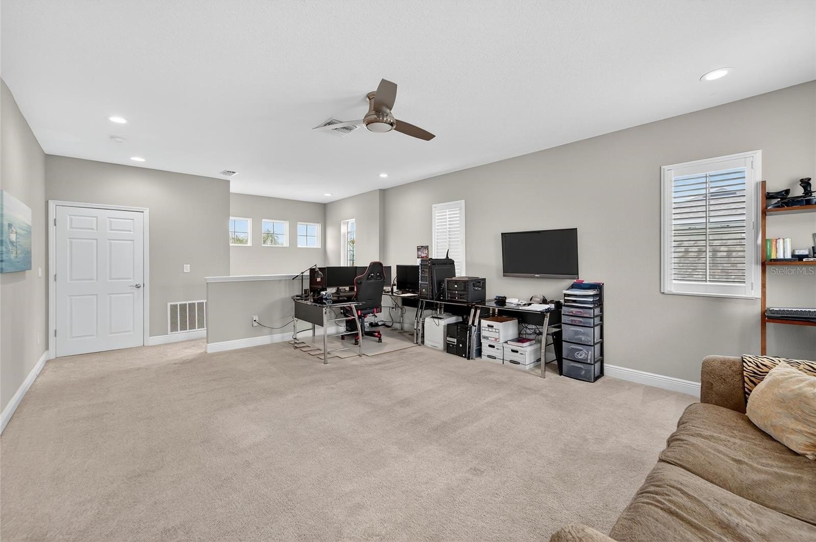 The luxurious first-floor primary suite includes a spacious walk-in closet, dual sinks, premium cabinetry and countertops, and a generous walk-in shower. Upstairs, a large bonus room and two additional bedrooms (one with a custom shiplap accent wall) share a beautifully appointed full bath. The landscape and architectural lighting in the front of the house is high voltage, hard-wired and permanently installed.